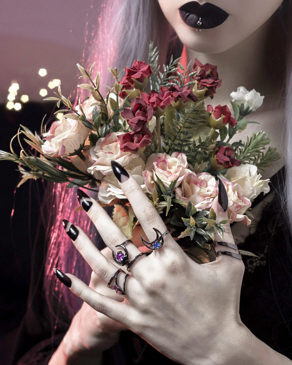 A lavender kiss on the glyph, under a cloudy sky, for an undecided love. Midi Ring of Affection, a commanding bond of runic lines.