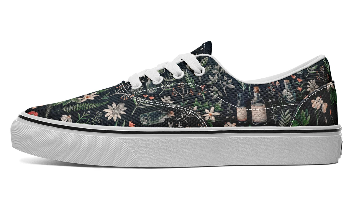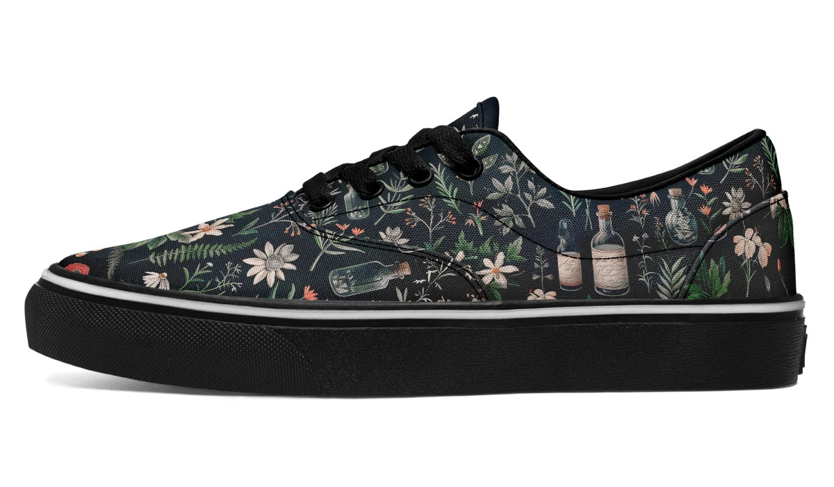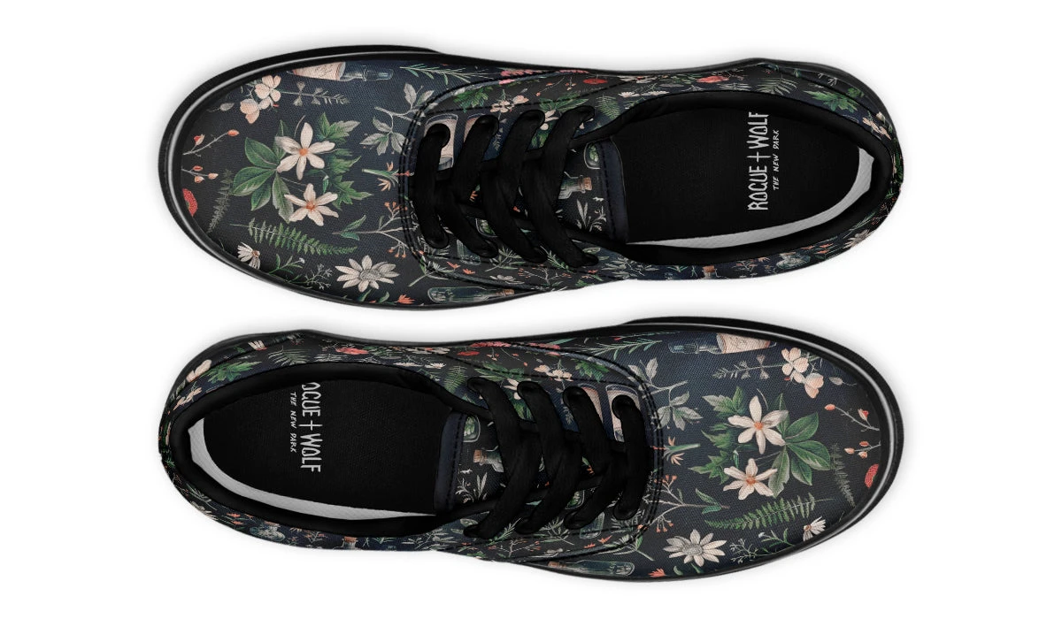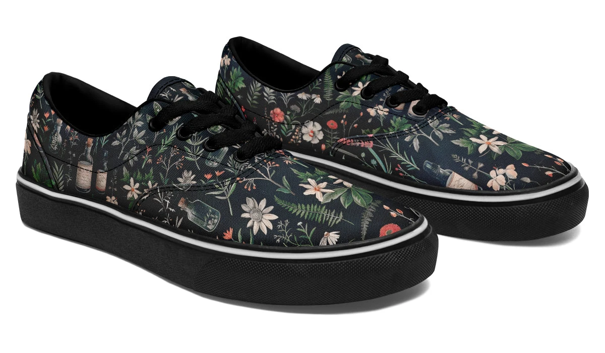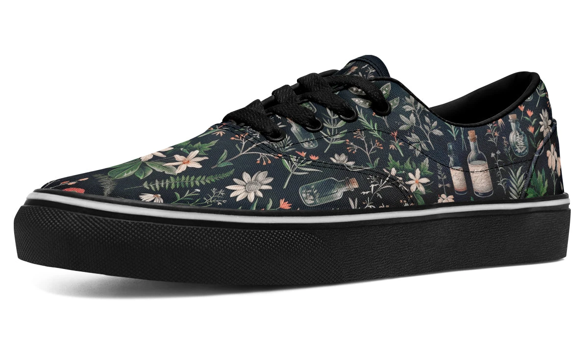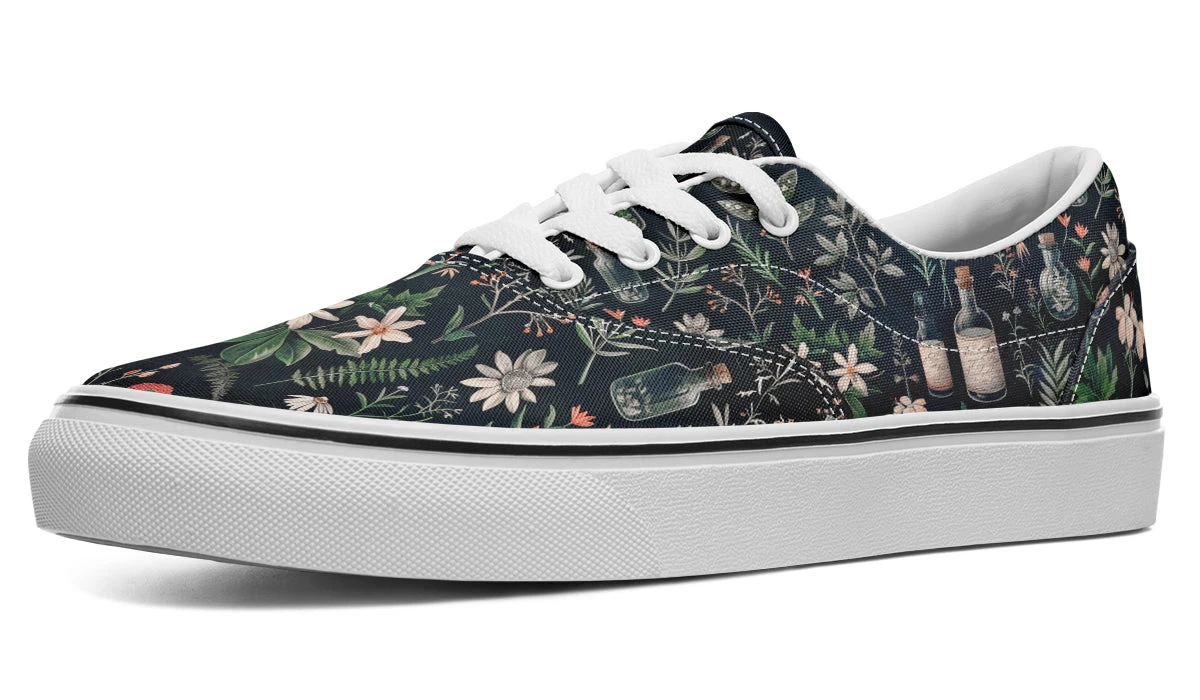 Embrace the ancient alchemy and wander through a whimsical world of blossoms and elixirs with each step. These street sneakers, adorned with apothecary bottles and herbs on a bewitching black canvas, are your ticket to a realm where mystical meets playful. Manufactured with the spirit of enchantment, they carry the charm of a midnight potion crafted just for your feet.