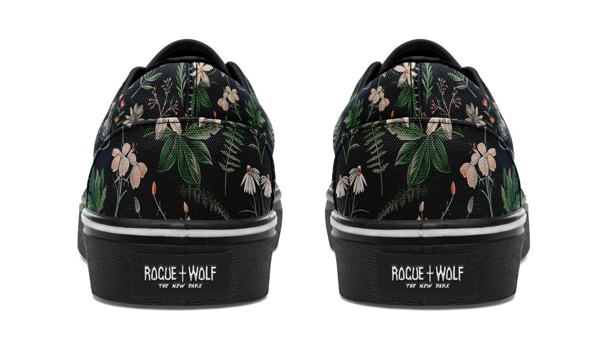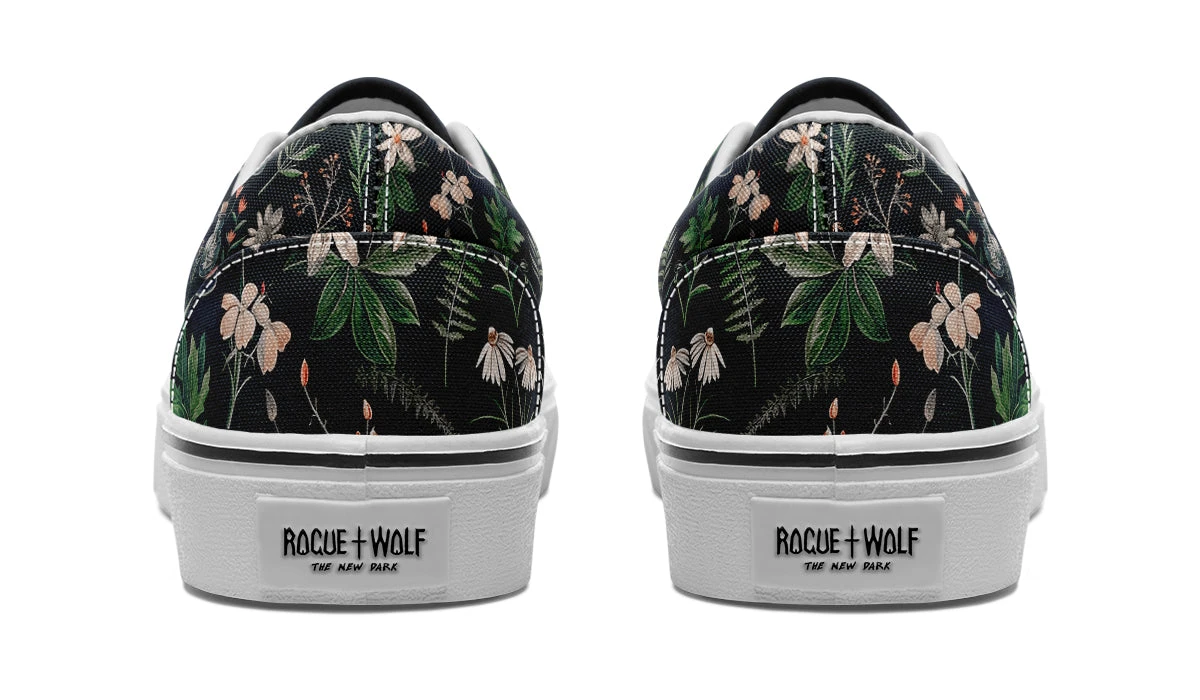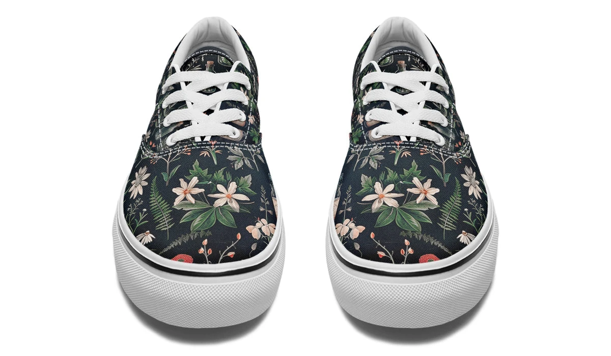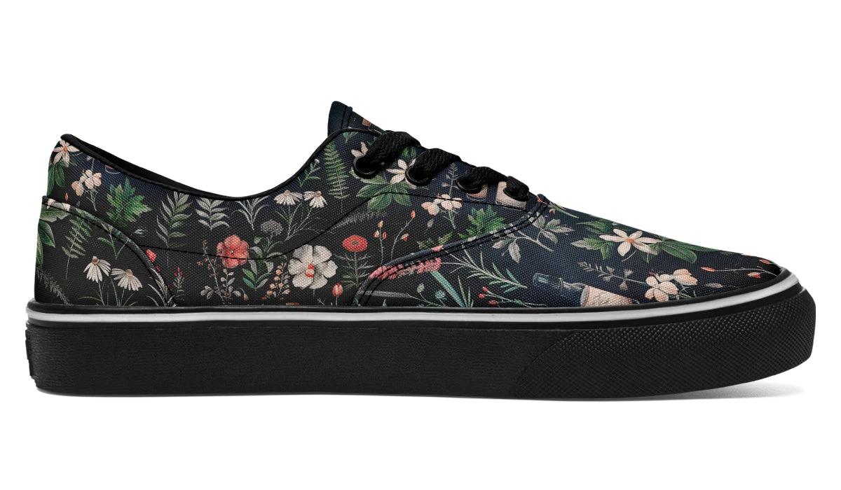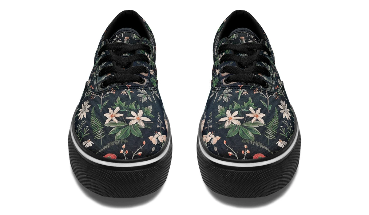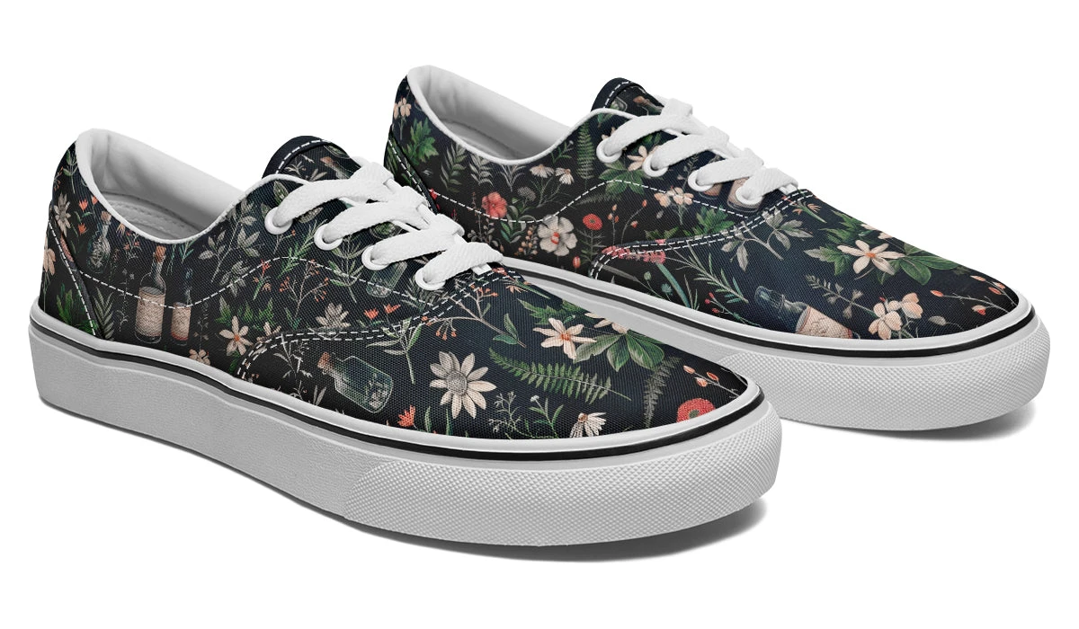 Embrace the ancient alchemy and wander through a whimsical world of blossoms and elixirs with each step. These street sneakers, adorned with apothecary bottles and herbs on a bewitching black canvas, are your ticket to a realm where mystical meets playful. Manufactured with the spirit of enchantment, they carry the charm of a midnight potion crafted just for your feet.