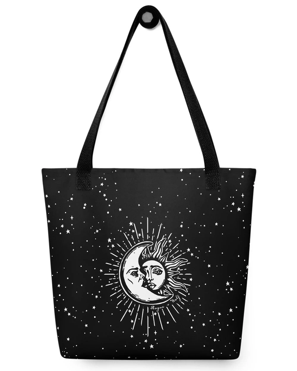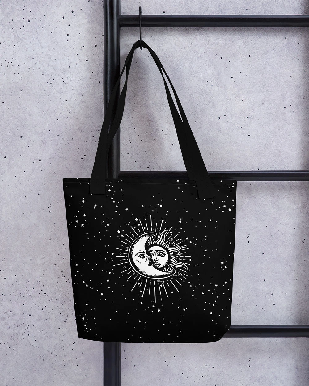 Don’t you just love it when the Sun & Moon decide to defy all laws of astrophysics and share a cosmic embrace? Our Astral Tote Bag brings this celestial romance to life, painted against a backdrop of twinkling stars, captured forever in a Goth accessory that’s as witchy as a new moon seance.
