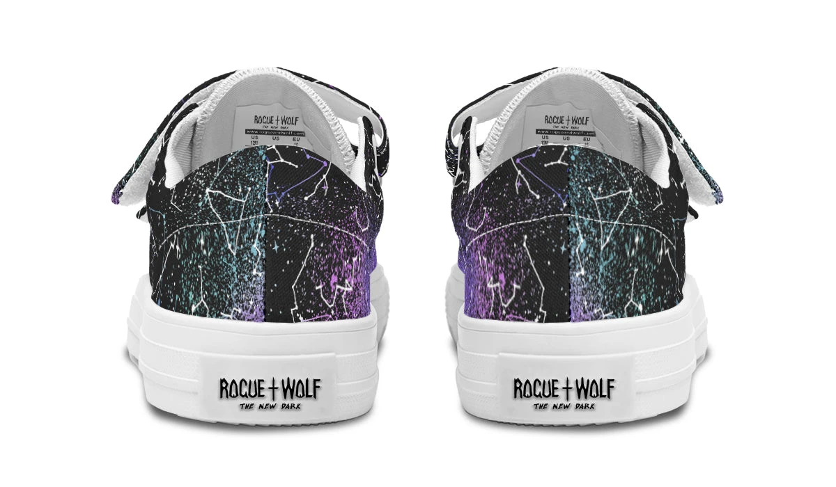 Step into a universe of whimsical wonder with our Aurora Kids Low Tops, where constellations and colourful galaxies dance in the enchantment of the endless cosmos. These vibrant hues of blue and purple capture the mystical allure of the universe, perfect for budding star gazers.