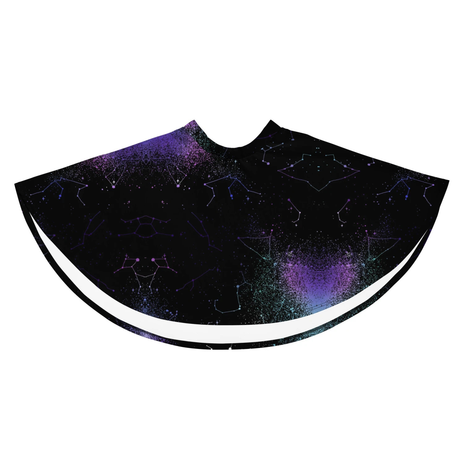 Slip into cosmic enchantment with a spellbinding skater skirt, painted in moody hues of purple and blue galaxies against the velvety darkness of the universe. Perfect cosmic camouflage for those midnight rituals—or just chasing down your next oat latte fix.