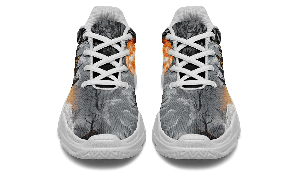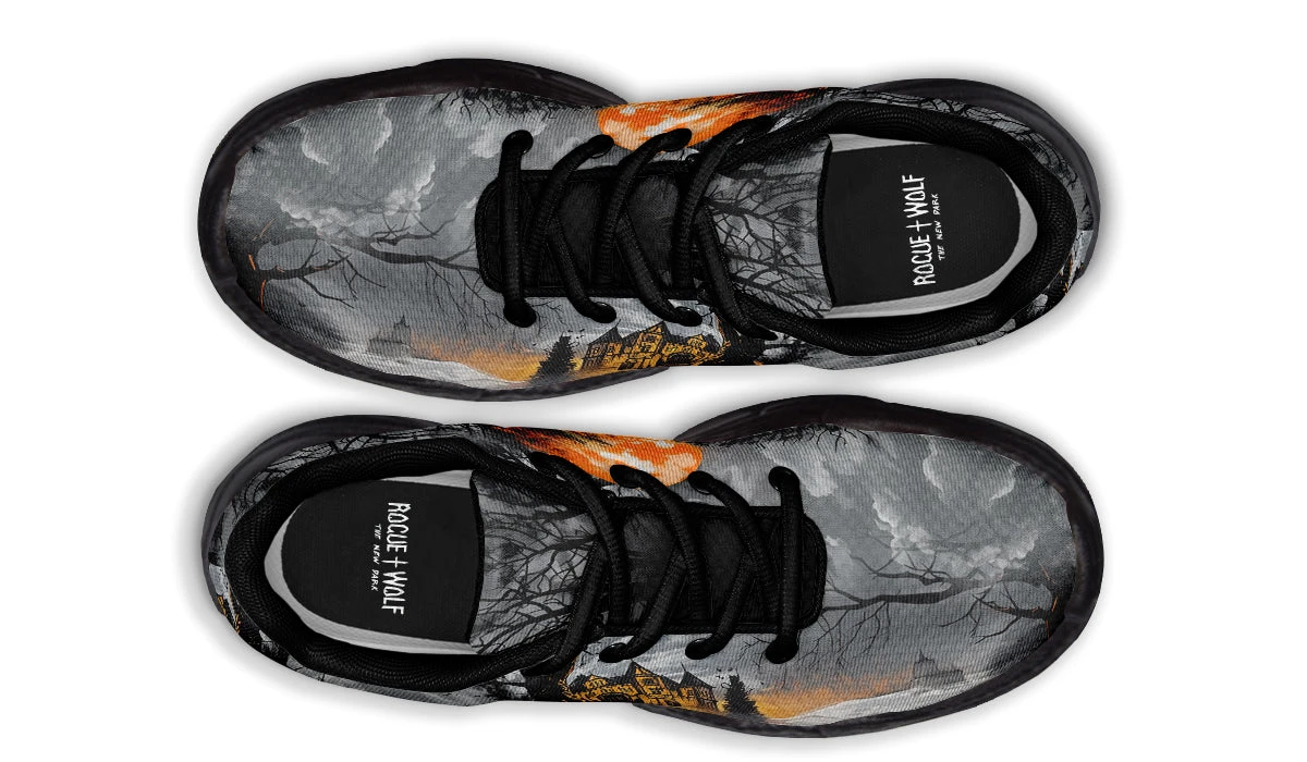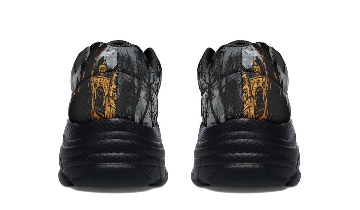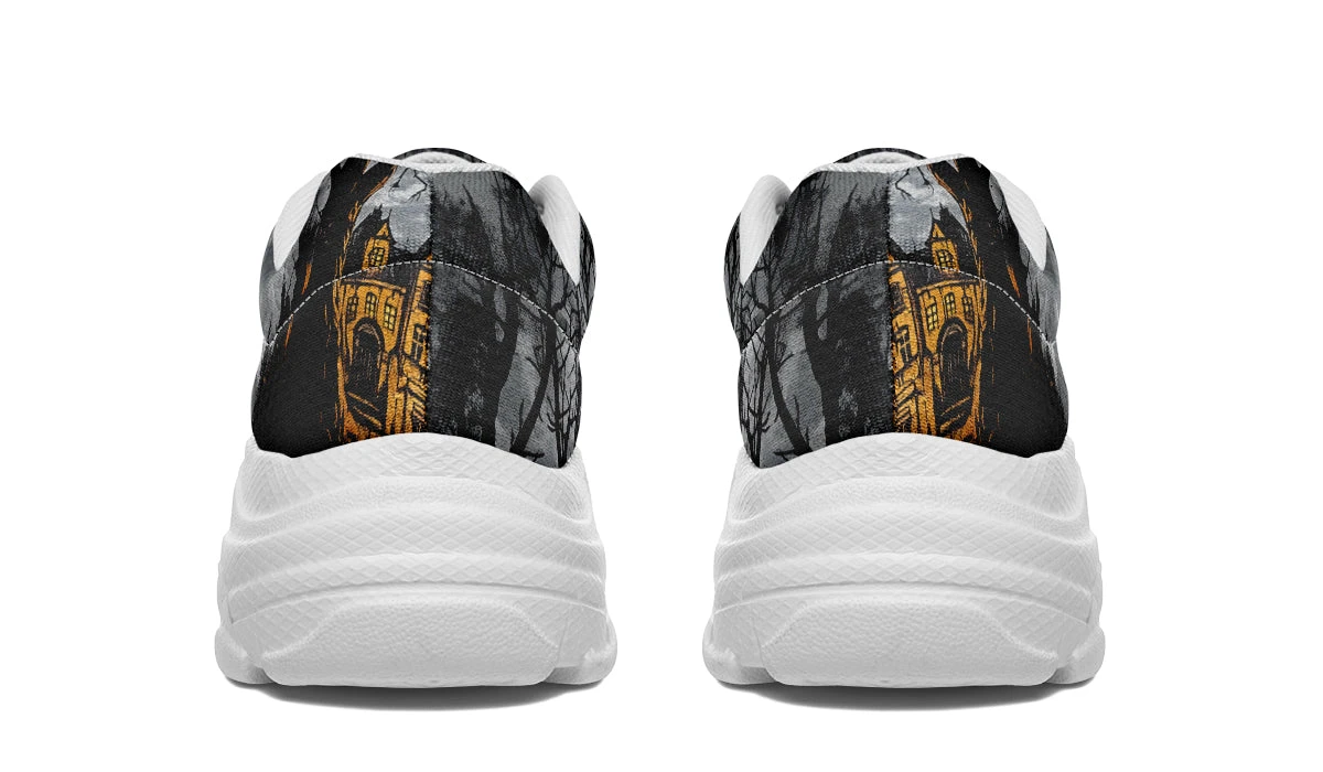Feel the eerie allure of a haunted night as you lace up these chunky sneakers adorned with a gothic mansion under a fiery blood moon. Ideal for those who thrive in the shadows and dance with the supernatural. Immerse yourself in a tale of mystique and wonder with each stride.