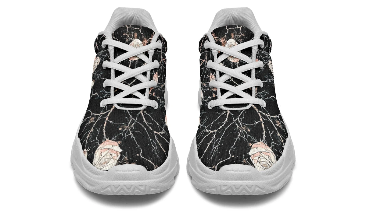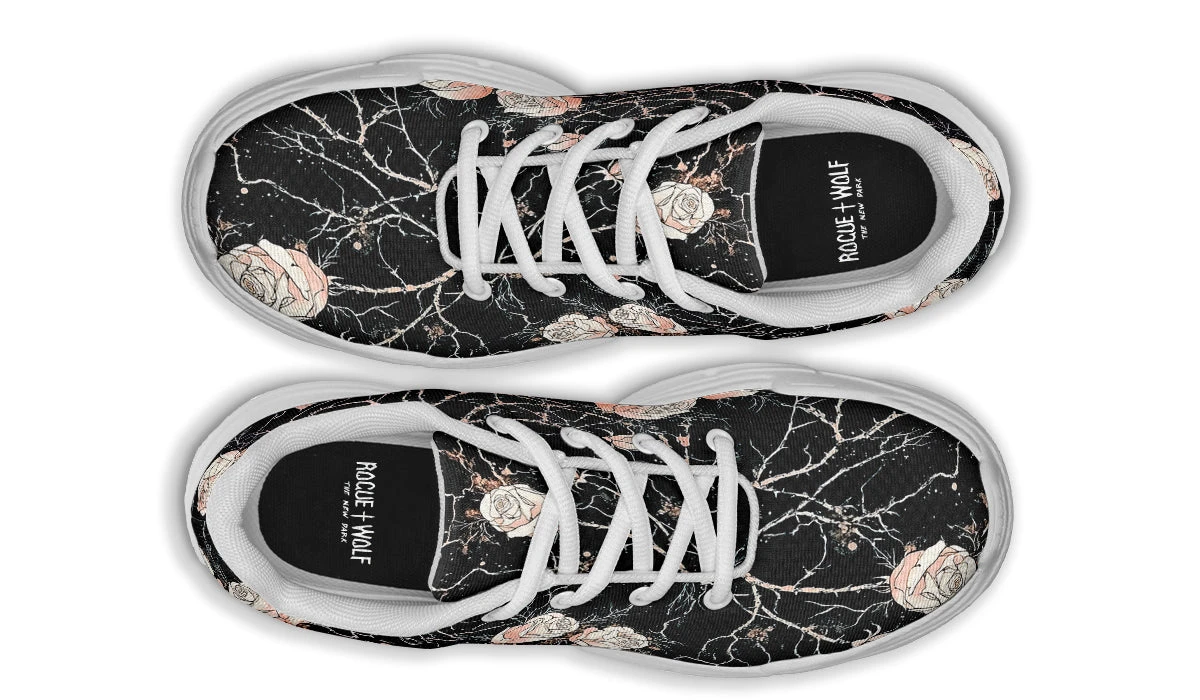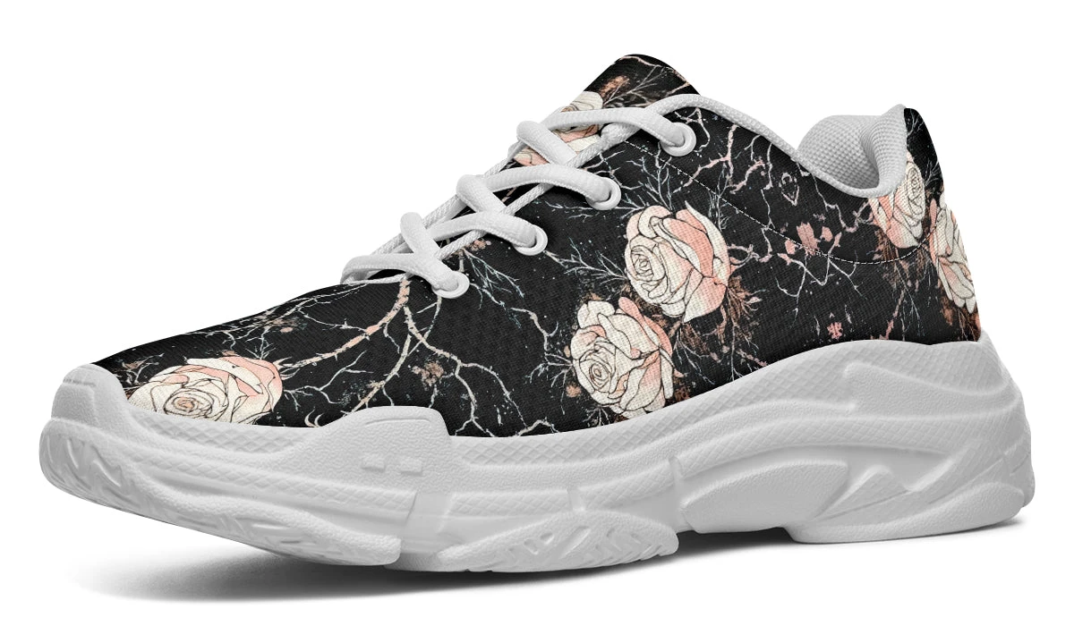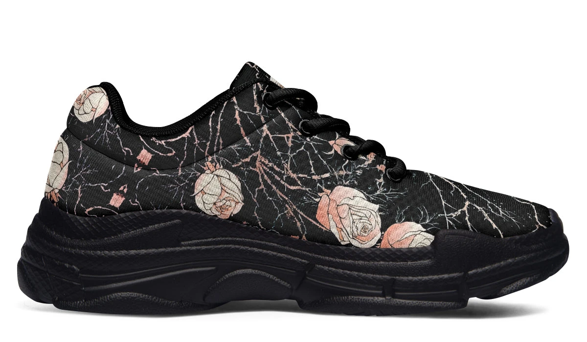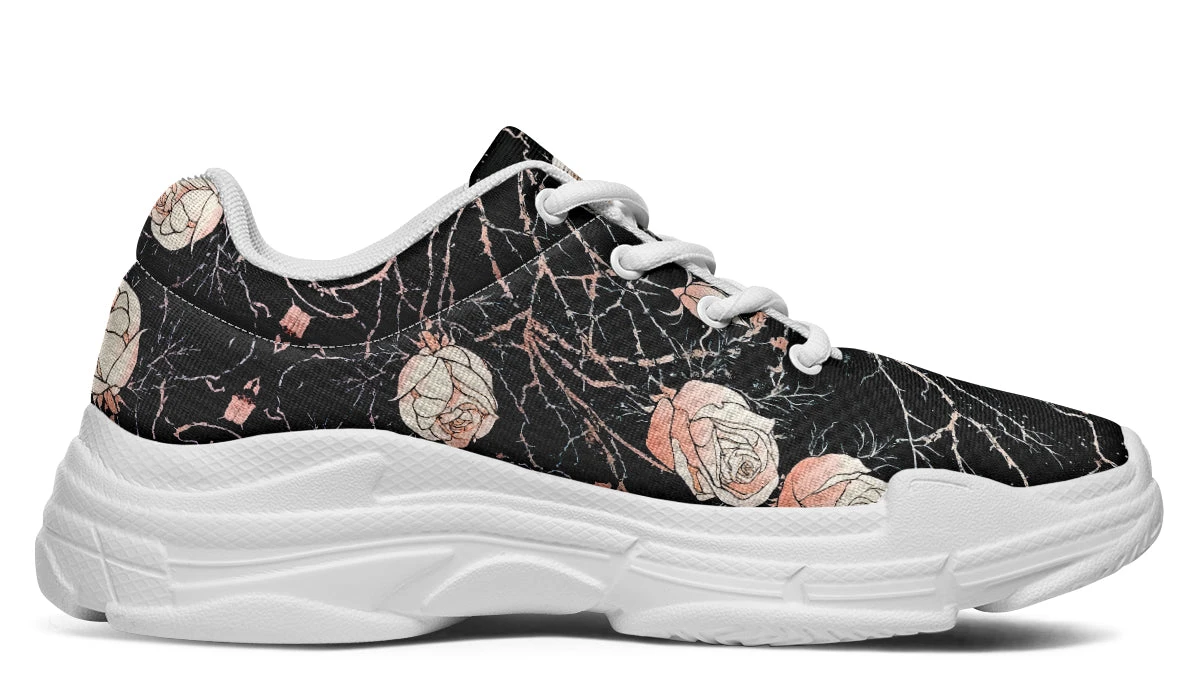 Embrace your inner mystique with the Blush Kintsugi Rose Chunky Sneakers, where delicate blush pink roses weave a tale of warmth and sophistication on a moody black canvas. Each step cracks open a little more magic—perfect for the rebellious soul daring to tread where mortals fear.