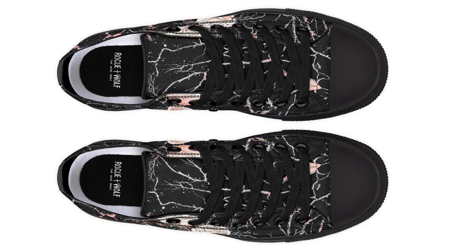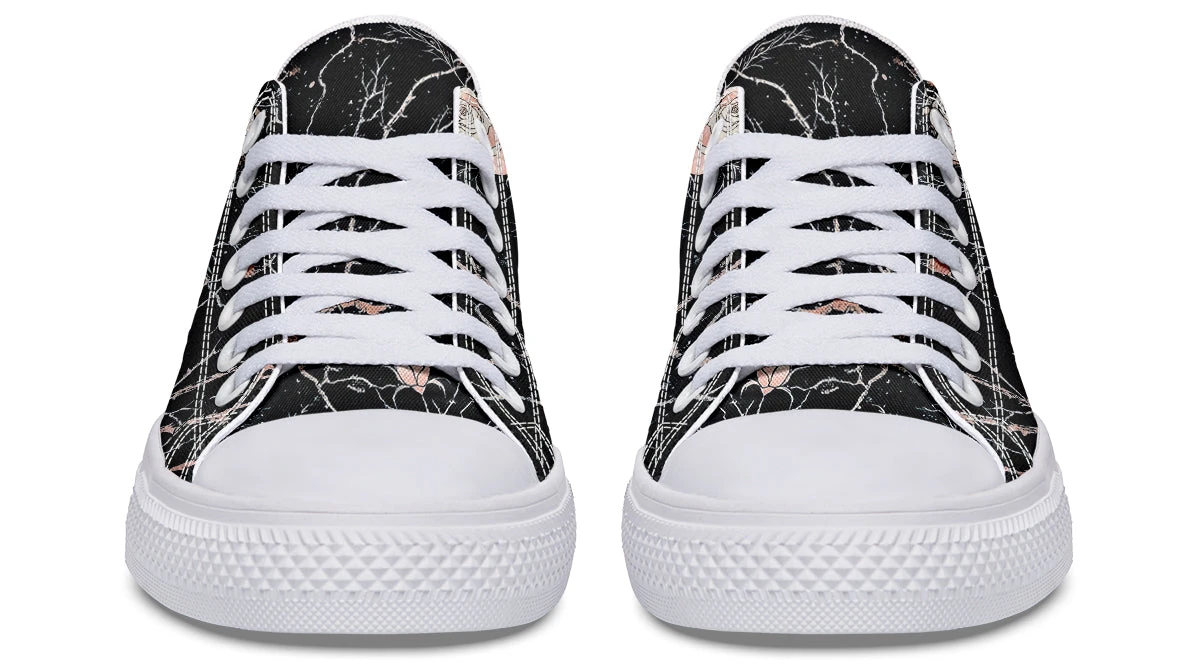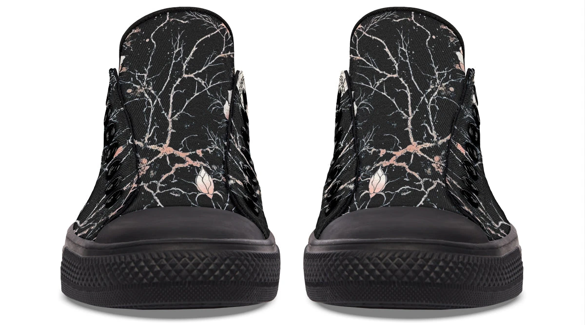 Summon the spirit of gothic elegance with the Blush Kintsugi Rose Low Tops. These spellbinding kicks showcase delicate blush pink roses etched on a black canvas, embodying a touch of warm sophistication. Perfect for those who walk the line between this world and the next.