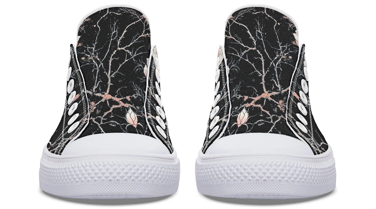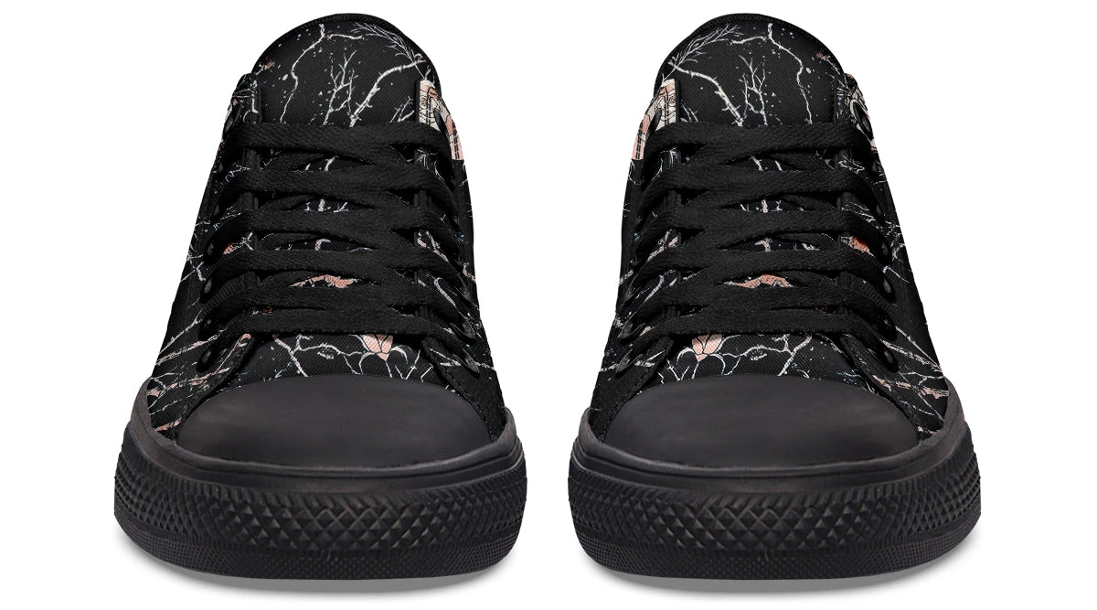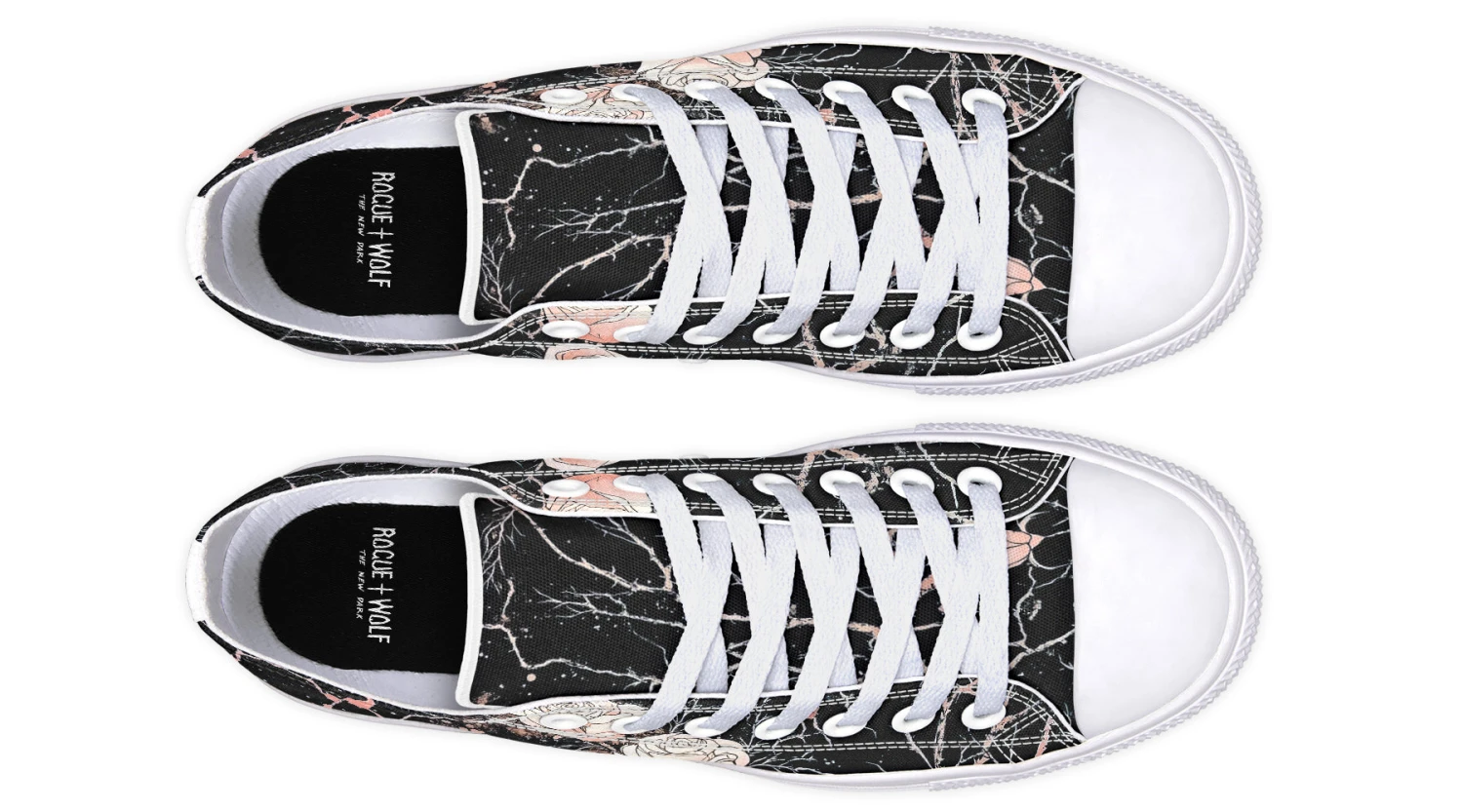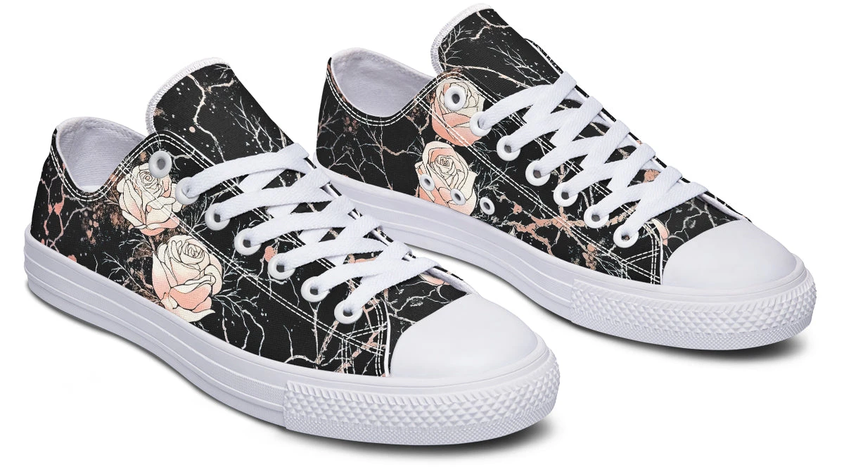 Summon the spirit of gothic elegance with the Blush Kintsugi Rose Low Tops. These spellbinding kicks showcase delicate blush pink roses etched on a black canvas, embodying a touch of warm sophistication. Perfect for those who walk the line between this world and the next.