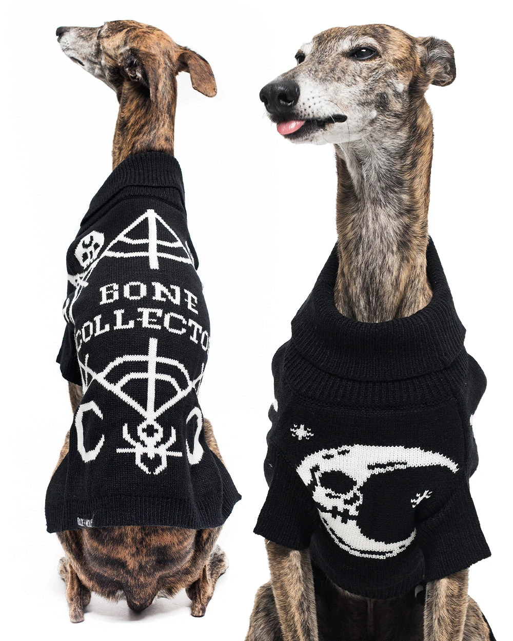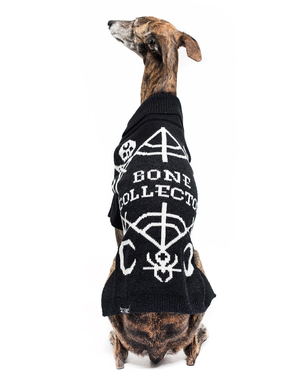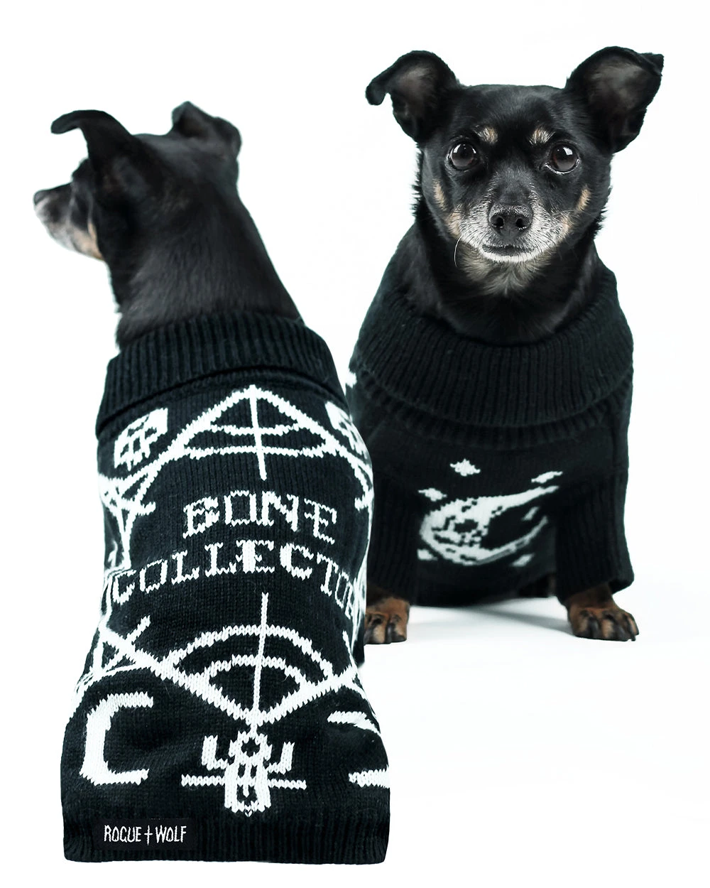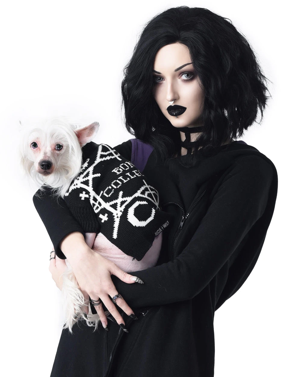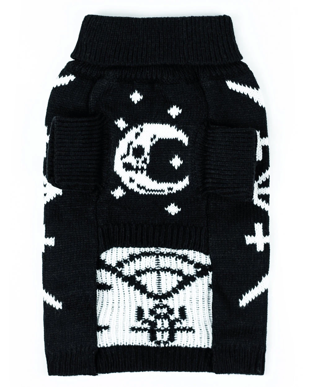 Show everyone who’s top dog with this wickedly cute black & white Vegan Yarn Knitted Sweater, with a spiderweb slogan design on the back and a skeleton moon on the front!