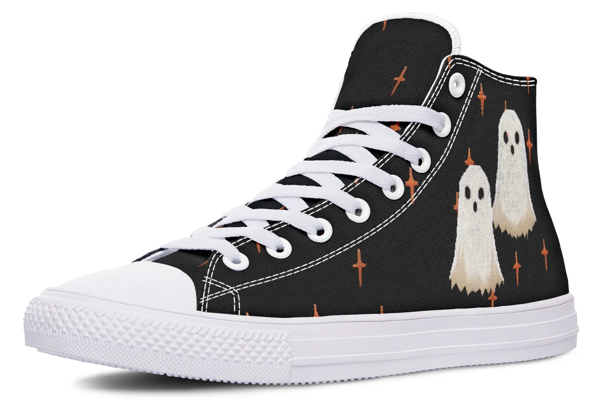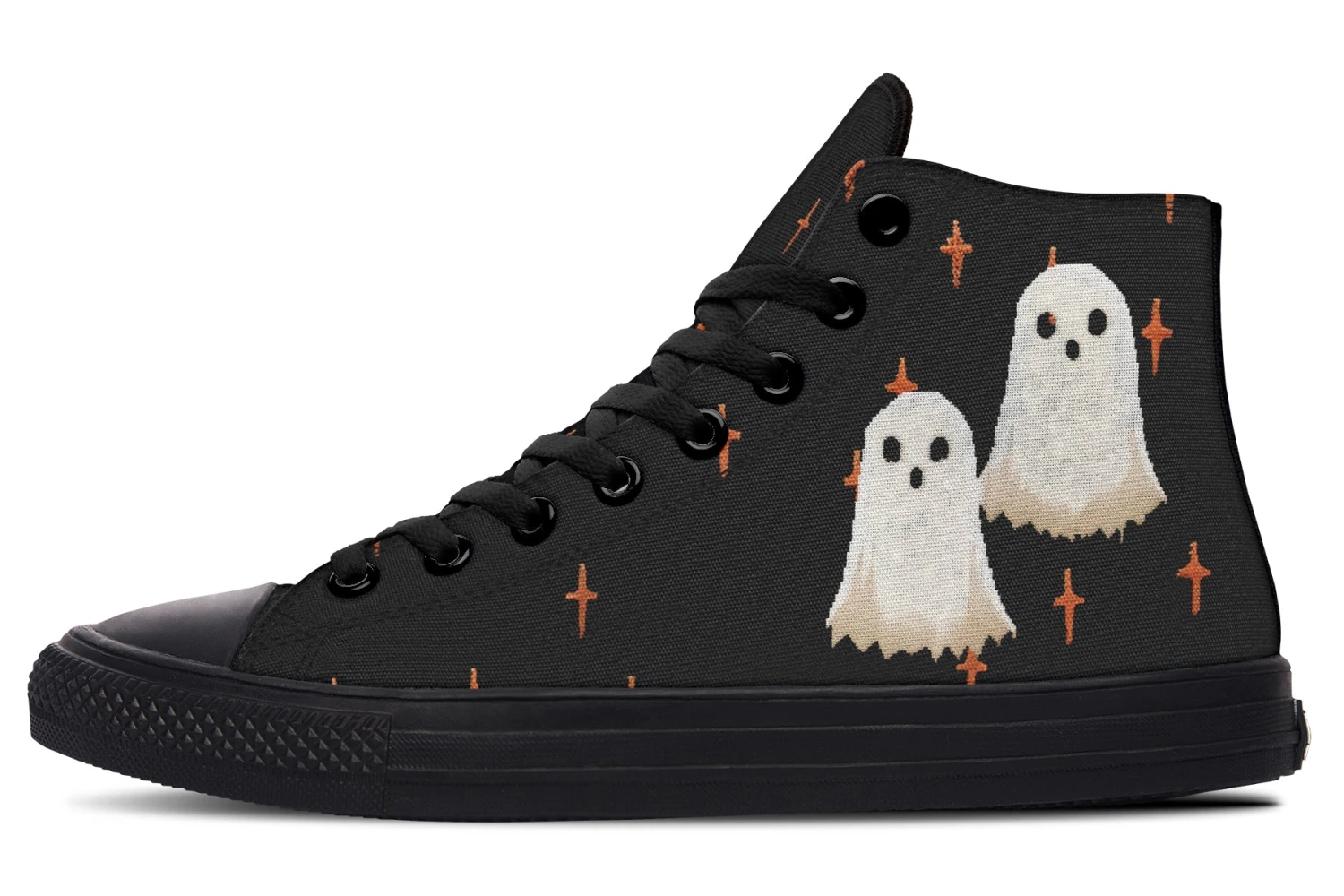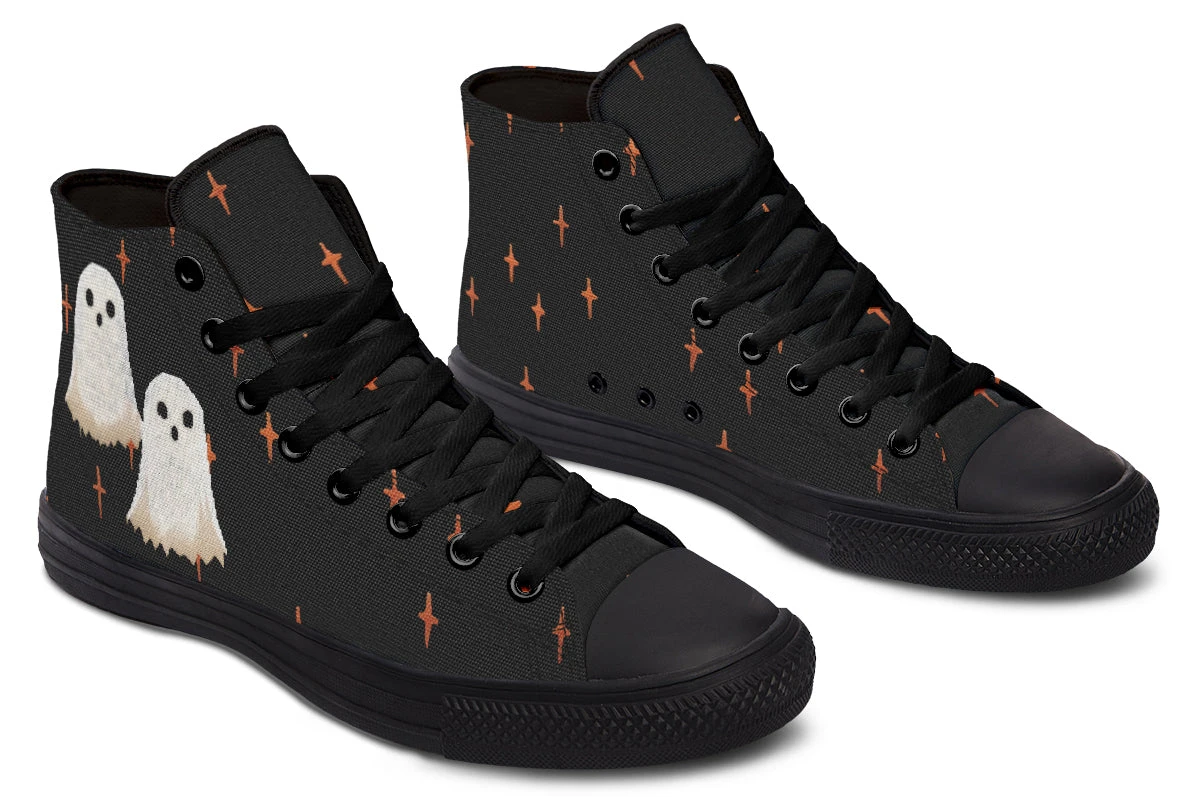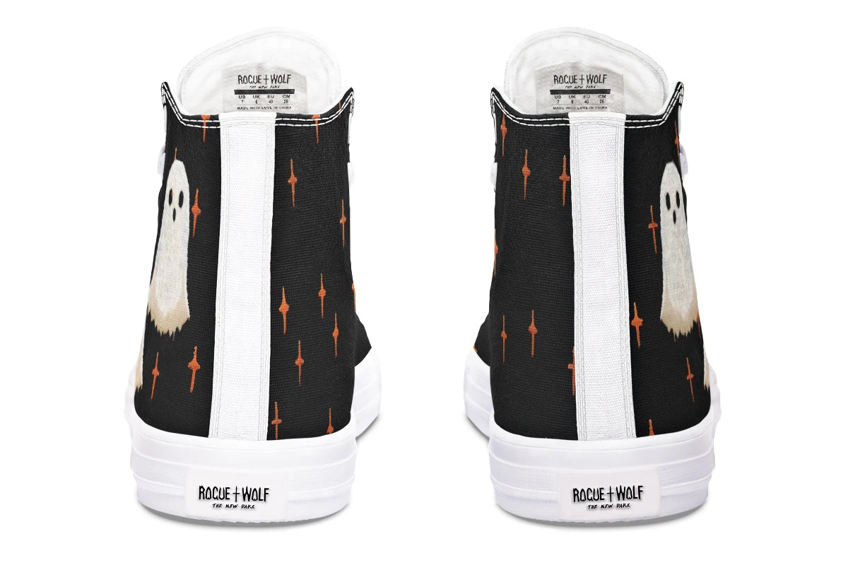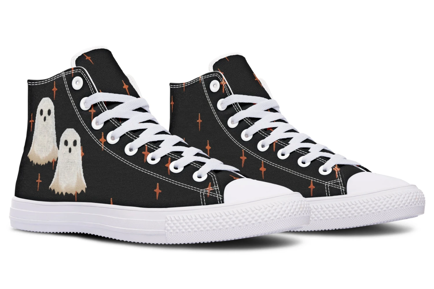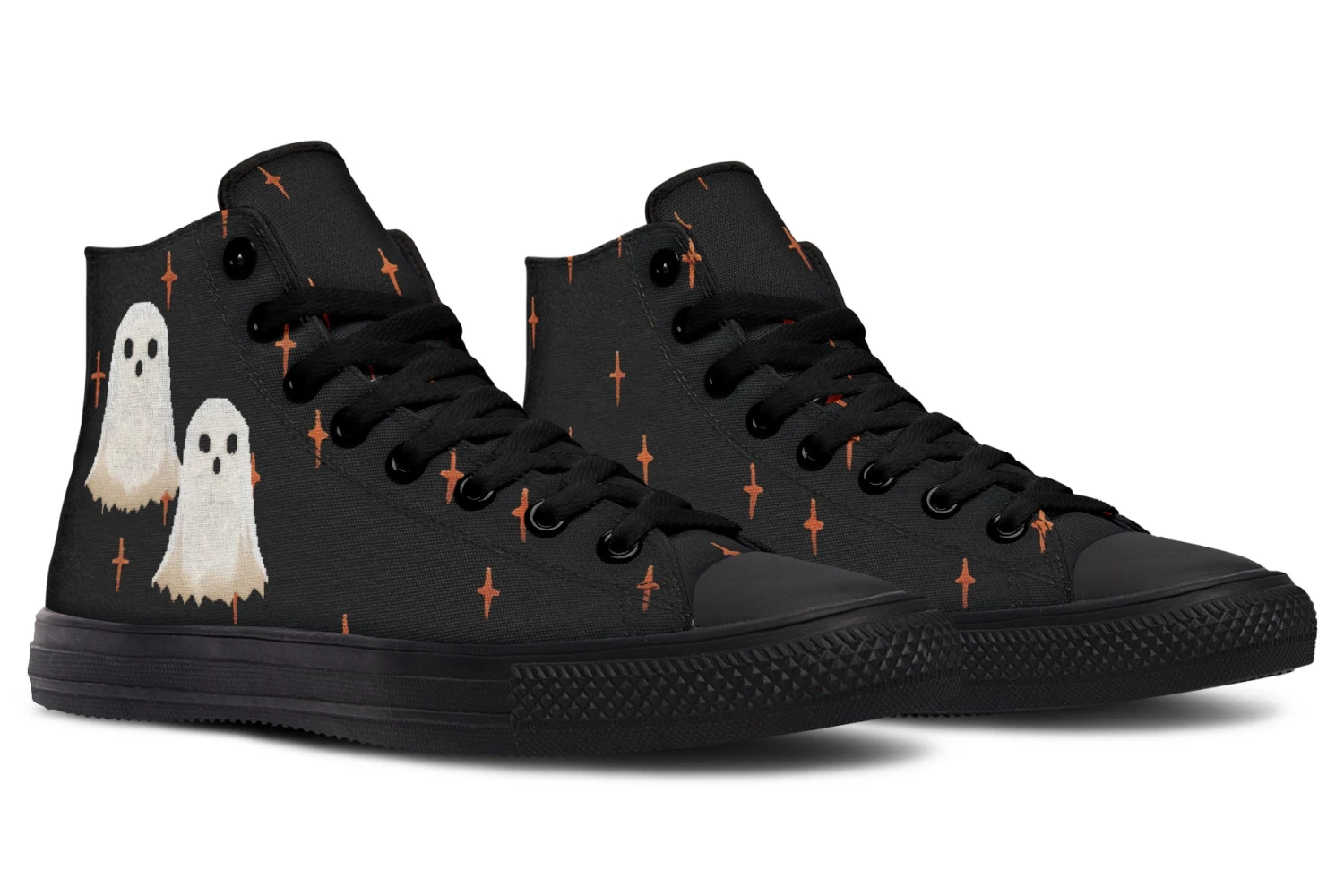 Step into a world of spooky charm with these retro high tops, featuring two adorable cross-stitched white ghosts floating in a starry expanse. These shoes are so cute, it’s scary – you might just find yourself being followed by a trail of lovesick specters! Don’t worry though, they’re probably just drawn to your killer sense of style.