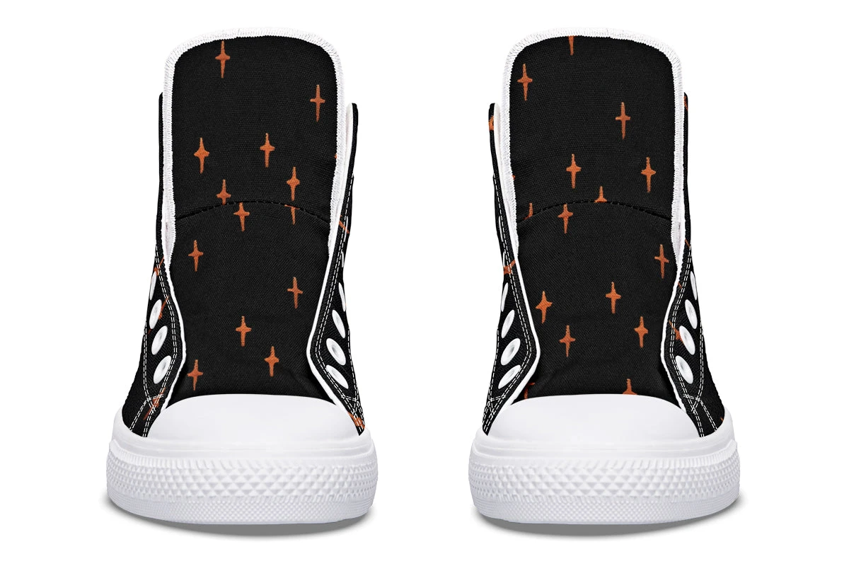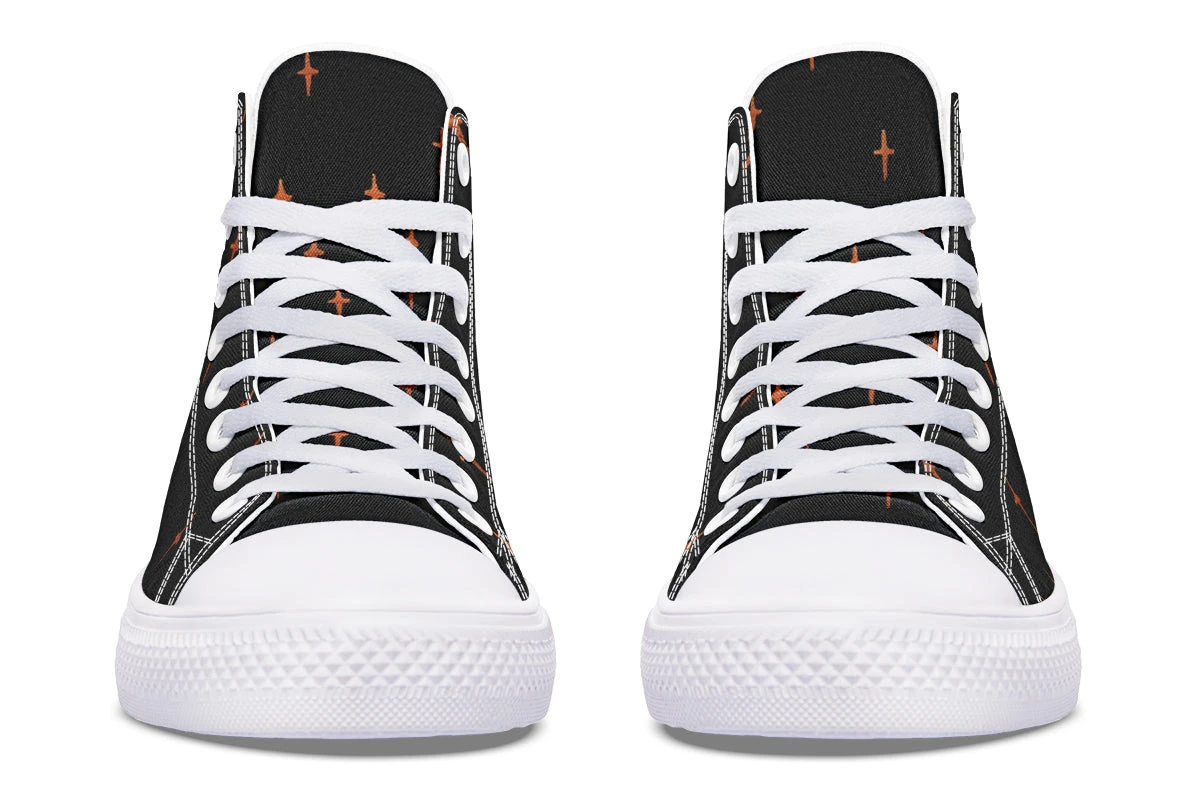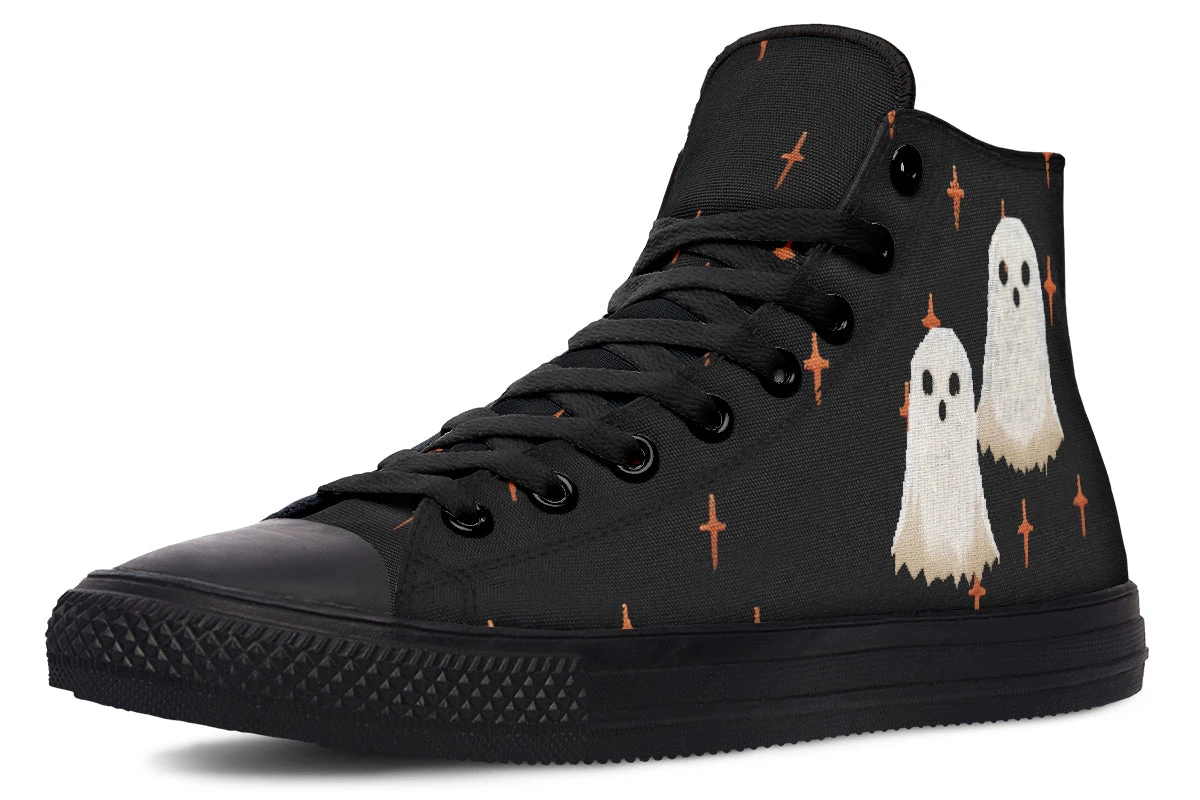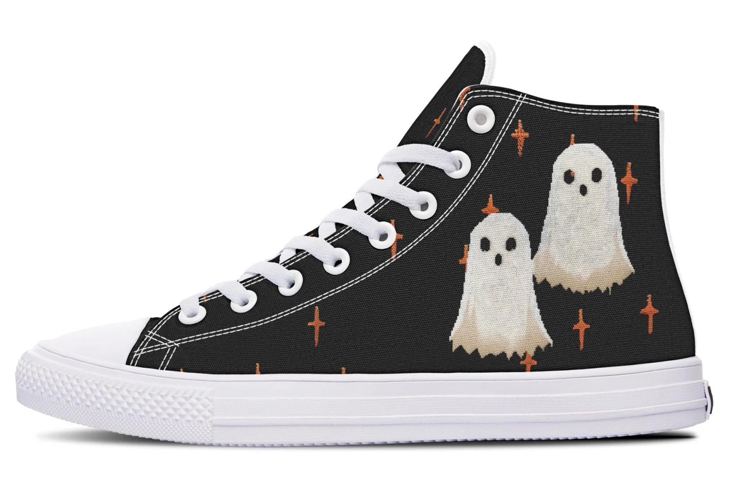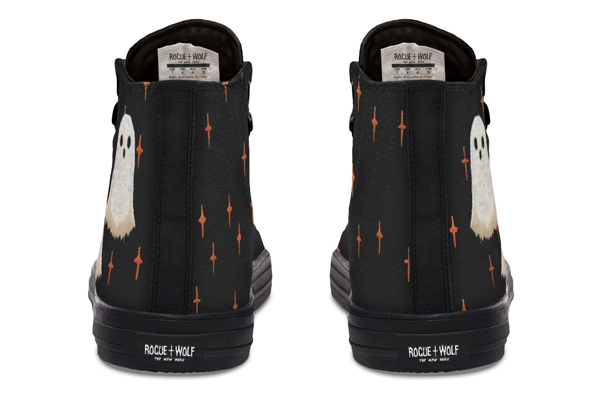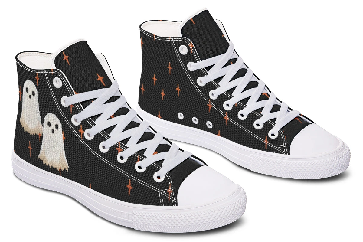 Step into a world of spooky charm with these retro high tops, featuring two adorable cross-stitched white ghosts floating in a starry expanse. These shoes are so cute, it’s scary – you might just find yourself being followed by a trail of lovesick specters! Don’t worry though, they’re probably just drawn to your killer sense of style.