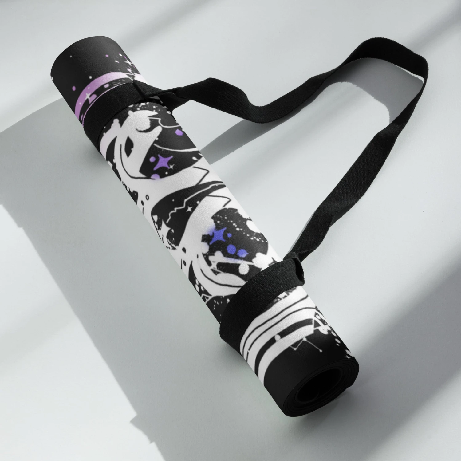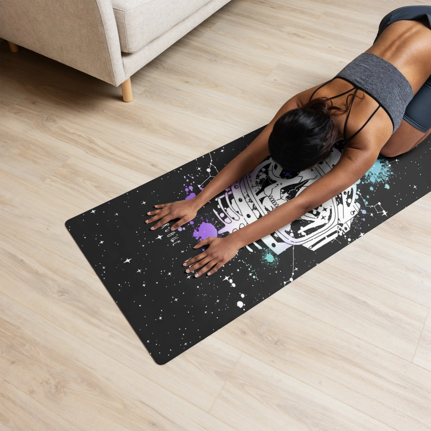 Navigate the universe of zen with our Cat-Astro-Phe Yoga Mat, where goth meets the cosmos in a divine conspiracy. The mat unveils an astronaut’s helmet, the visor revealing not just any skull, but a mystical feline’s, surrounded by celestial splashes of otherworldly galaxies and stars. Perfect for those who want to stretch beyond the mundane and delve into the realms of dark academia and witchy style. Dare to align your chakras with a touch of cosmic chaos!