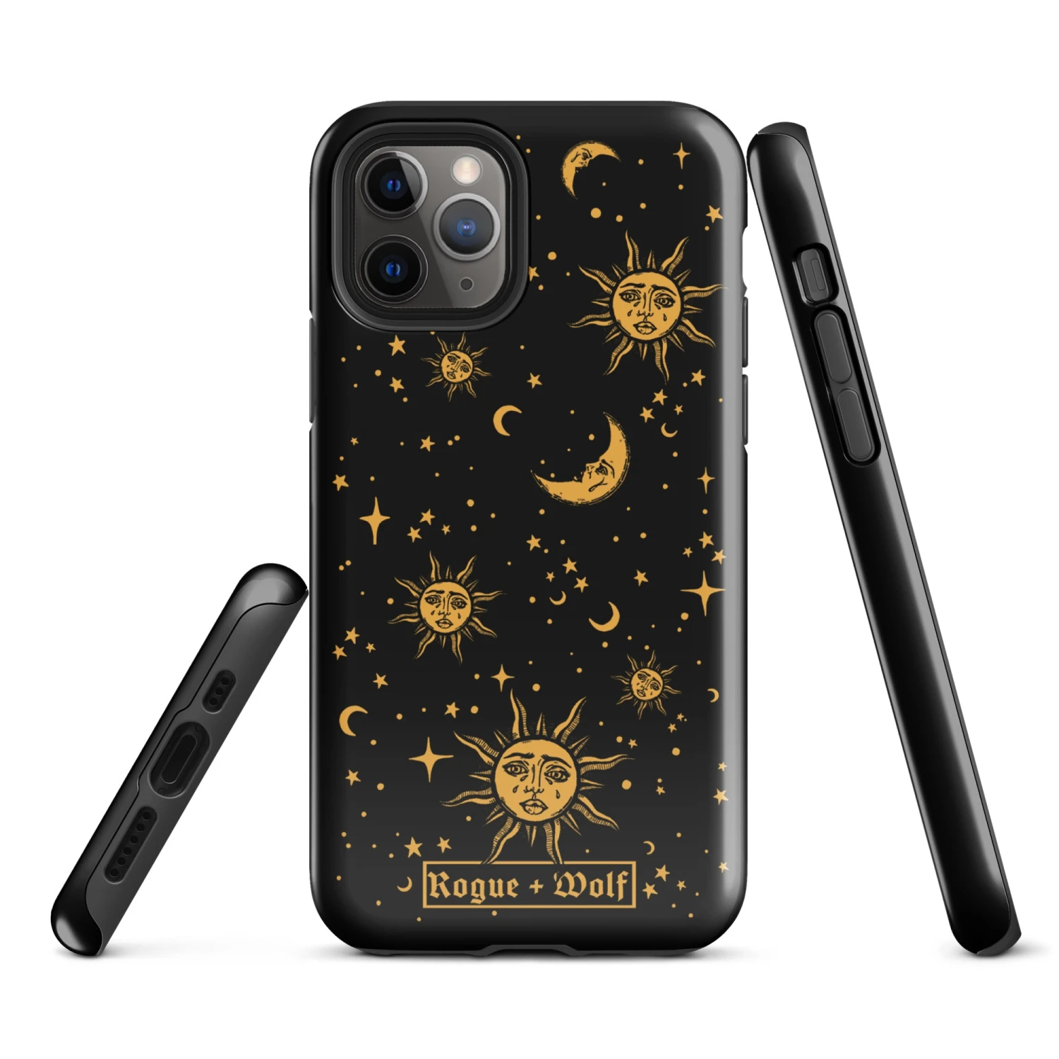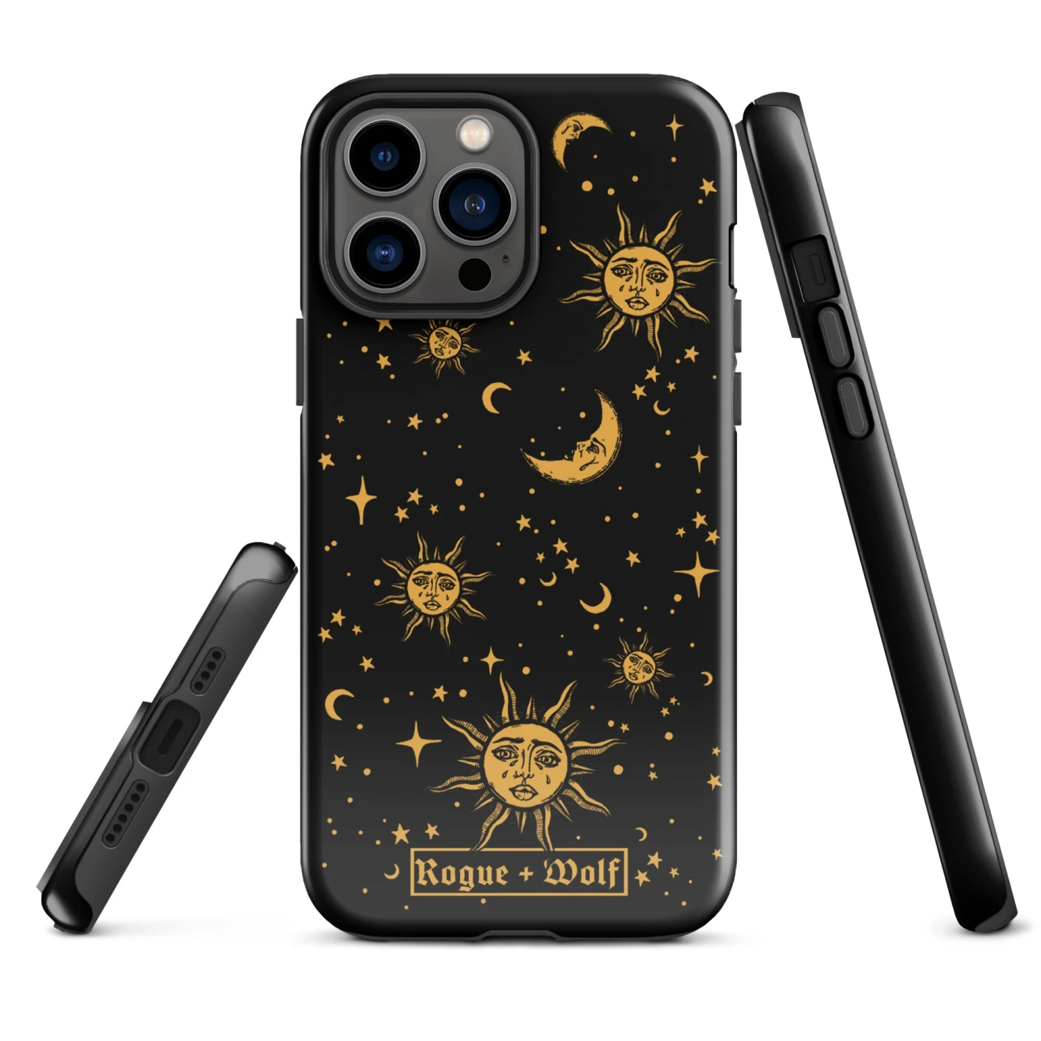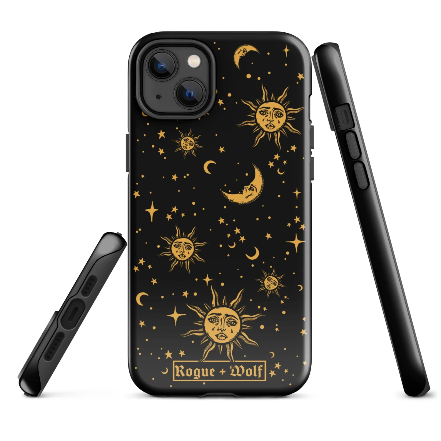 Introducing the Celestial Tough Phone Case for iPhone, where the ethereal meets the durable. A case not just designed to protect, but to enchant, allowing you to carry the mesmerizing dance of suns, moons, and stars with you, ensuring your phone is safe and your style is ineffably celestial.
