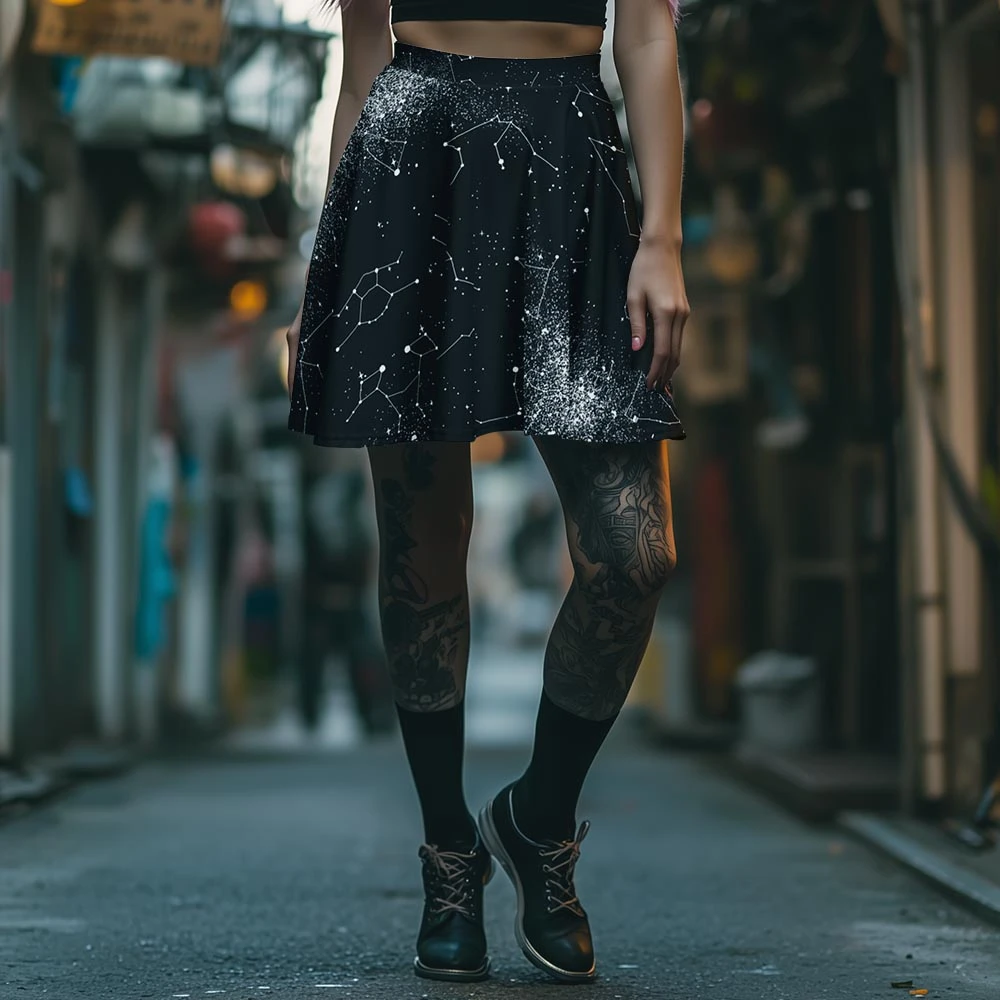 Twirl beneath the cosmos in our Constellation Skater Skirt, spellbound by galaxies and enchanted by stardust—because summoning spirits is overrated, conjure compliments instead. Made for stargazers, mystics, and Coven sisters who adore weaving enchantment into their everyday attire.