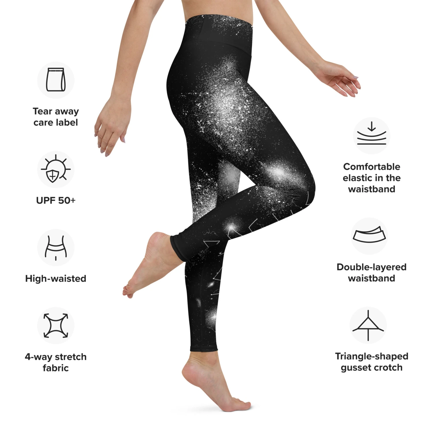 Drape your limbs with the night sky in our Constellation Yoga Leggings. Crafted for the astral adventurer, these leggings embody the mystery and wonder of the universe, with every stretch and pose revealing new cosmic secrets. Perfect for nocturnal souls who wish to carry the stars with a UPF 50+ protection from 98% harmful rays.