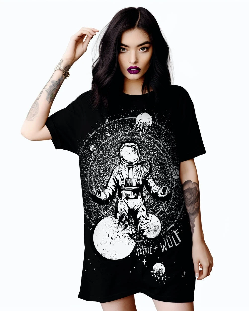 Get ready to moonwalk through the universe with our Cosmic Explorer Tee Dress! Its ethereal aesthetic captures the essence of a vast, unexplored cosmos, allowing your style to skyrocket into galaxies unknown. Perfect for the souls yearning to echo the mysteries of the universe, this tee dress is your ticket to an interstellar adventure wrapped in the soft embrace of gothic and alternative style.