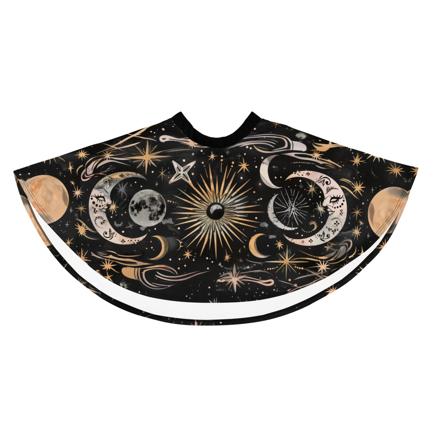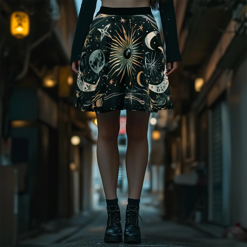 Step into the shadows while illuminating your style with this bewitching skater skirt, featuring cosmic golden suns, moons, and stars dancing in the dark. Perfect to summon attention at moonlit gatherings, midnight rendezvous, or simply dazzling The Coven during daily arcane endeavors.