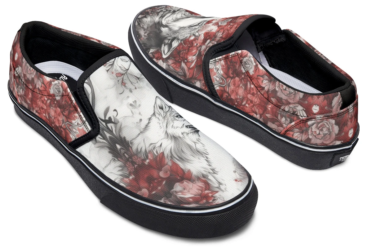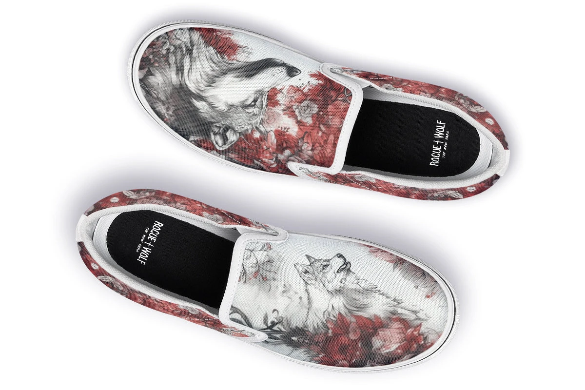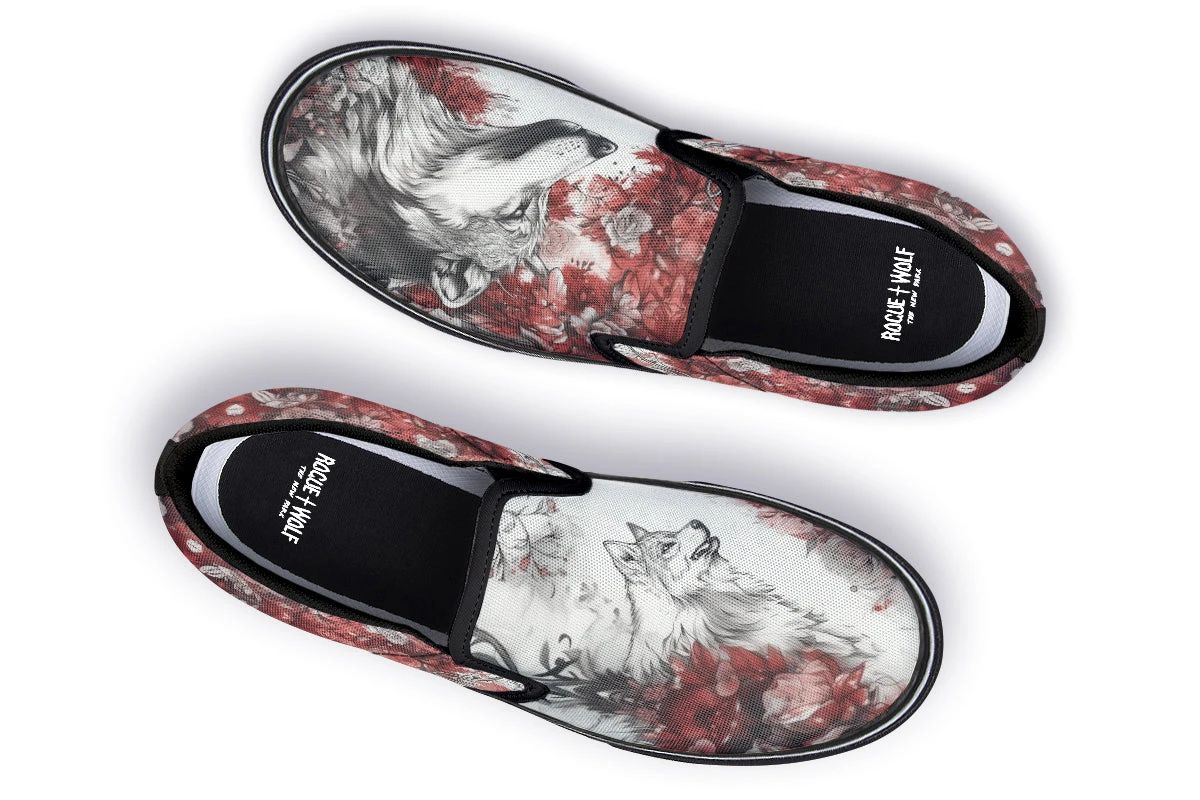 Slip into the Crimson Wolf Slipons and let your journey unfold amidst spiraling crimson leaves and ethereal pale roses. Majestic wolves embedded in the soft grayscale ignite a dance of wild ferocity and serene beauty, capturing the untamed spirit of the arcane.