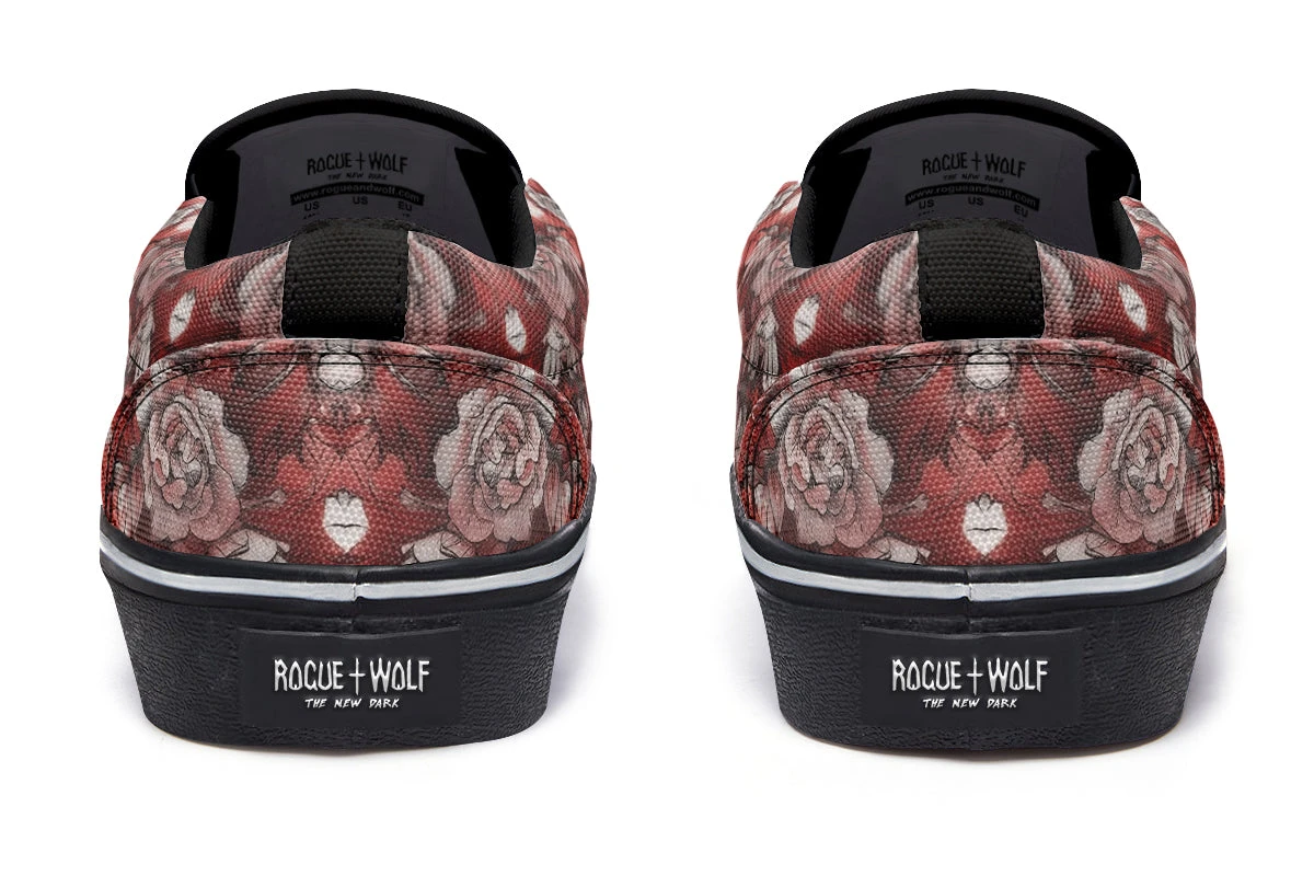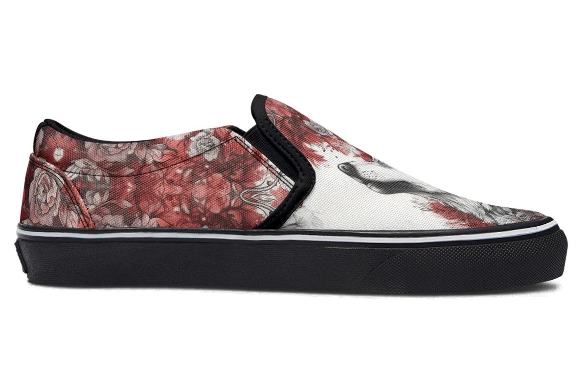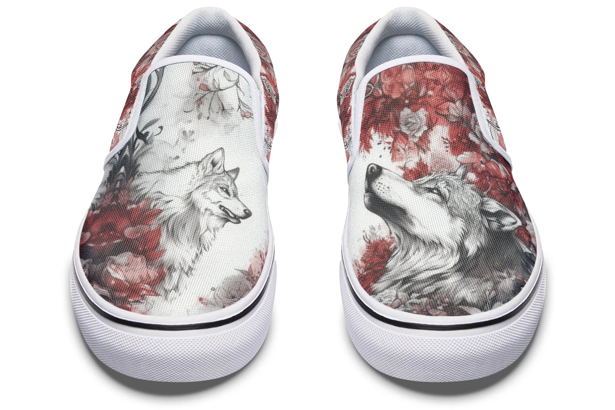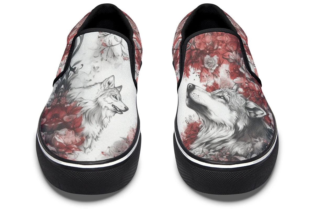 Slip into the Crimson Wolf Slipons and let your journey unfold amidst spiraling crimson leaves and ethereal pale roses. Majestic wolves embedded in the soft grayscale ignite a dance of wild ferocity and serene beauty, capturing the untamed spirit of the arcane.