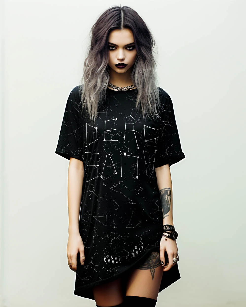 Evoke the spirits of the night with the ‘Dead or Alive Tee Dress,’ a cryptic canvas where the realms of life and the afterlife mystically intertwine. Each thread weaves the ethereal tales of the cosmos, crafting an alternative goth fashion saga that resonates with the souls traversing the paths of both shadows and stars. Let this tee dress envelop you in a cryptic embrace, making you the celestial ambassador of an eternal gothic style tale.