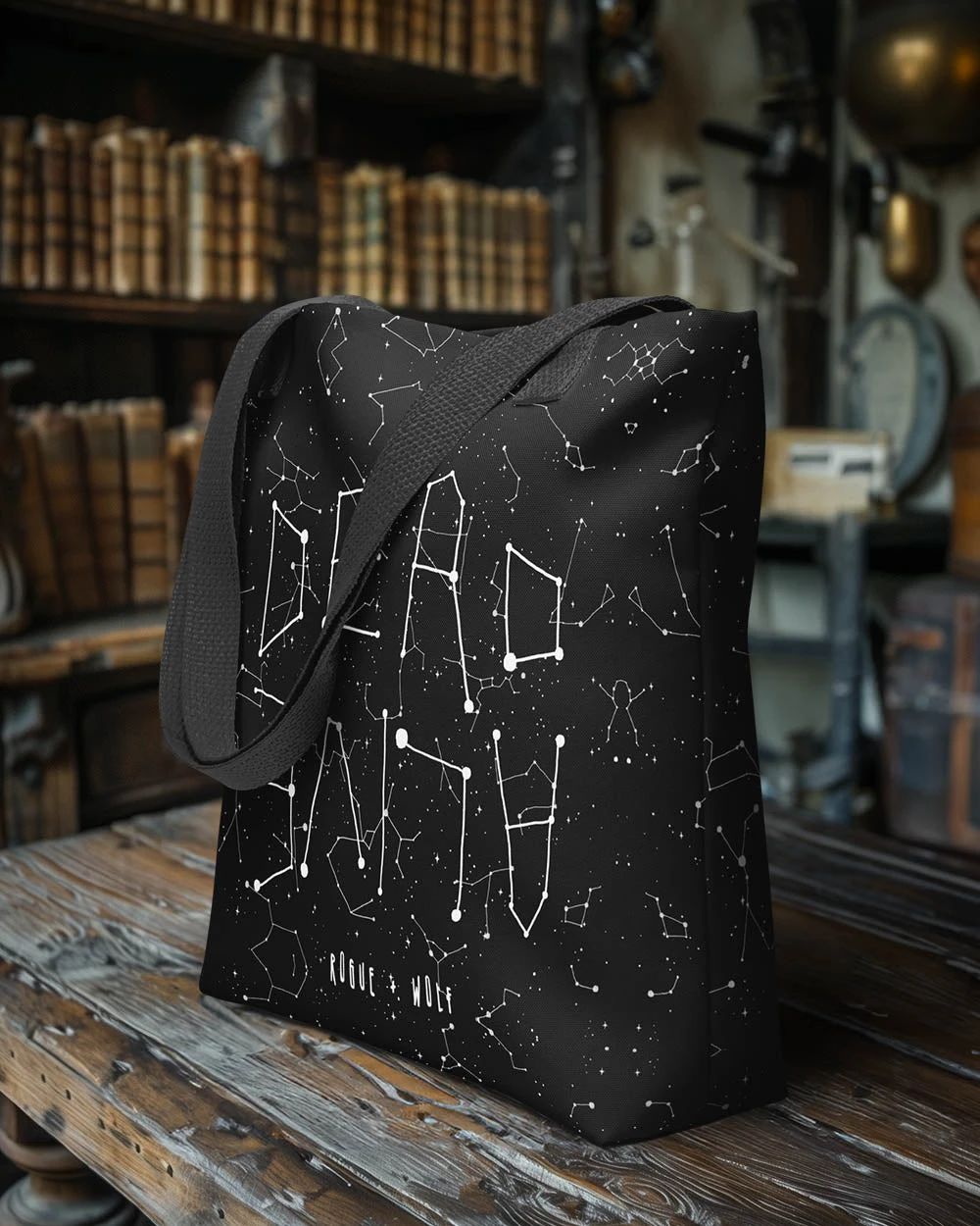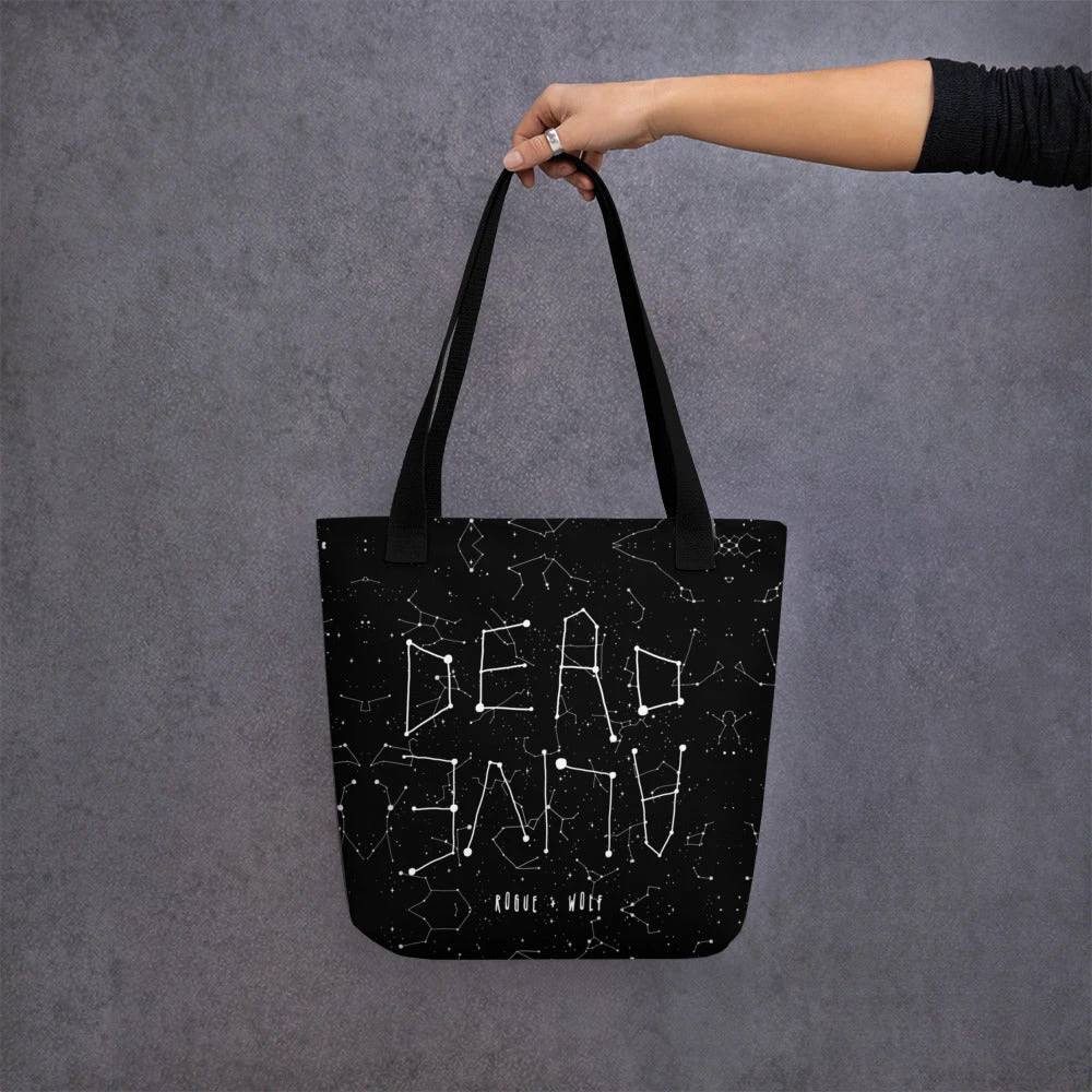Unlock the mysteries of the universe with Rogue + Wolf’s Dead or Alive Tote Bag. Drenched in the beauty of the night sky and adorned with celestial constellations, this bag is your grunge aesthetic talisman. The gothic accessories gods have divined a pattern so mystical, even the stars are aligned in jealousy. Dare to be the celestial enchantress of the Coven with this ethereal weave of art and utility.