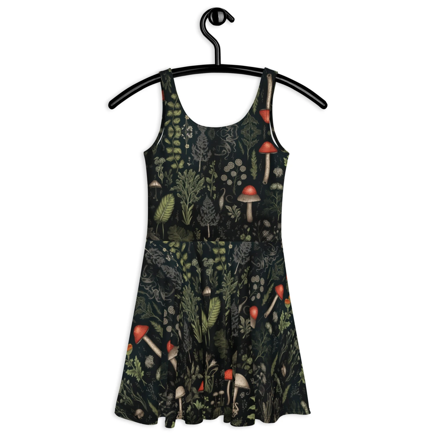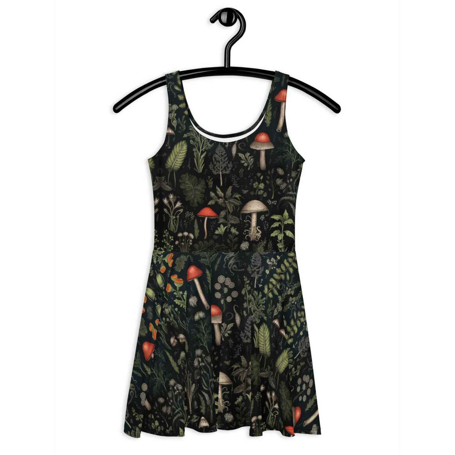 Step into the enchanting world of the Foraging Dress, where old botanical book charm meets the dark academia skater dress aesthetic. With each wear, you’ll conjure the allure of a green witch on a spellbinding quest through nature’s apothecary. Wrap yourself in an enigmatic tapestry of plants, herbs, and mystical mushrooms; it’s not just a cute goth black dress, it’s an incantation waiting to be cast.