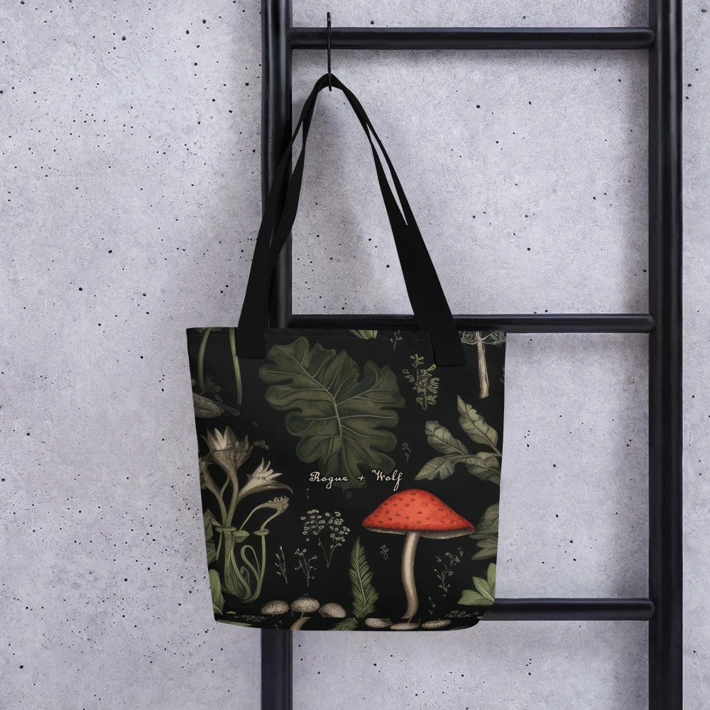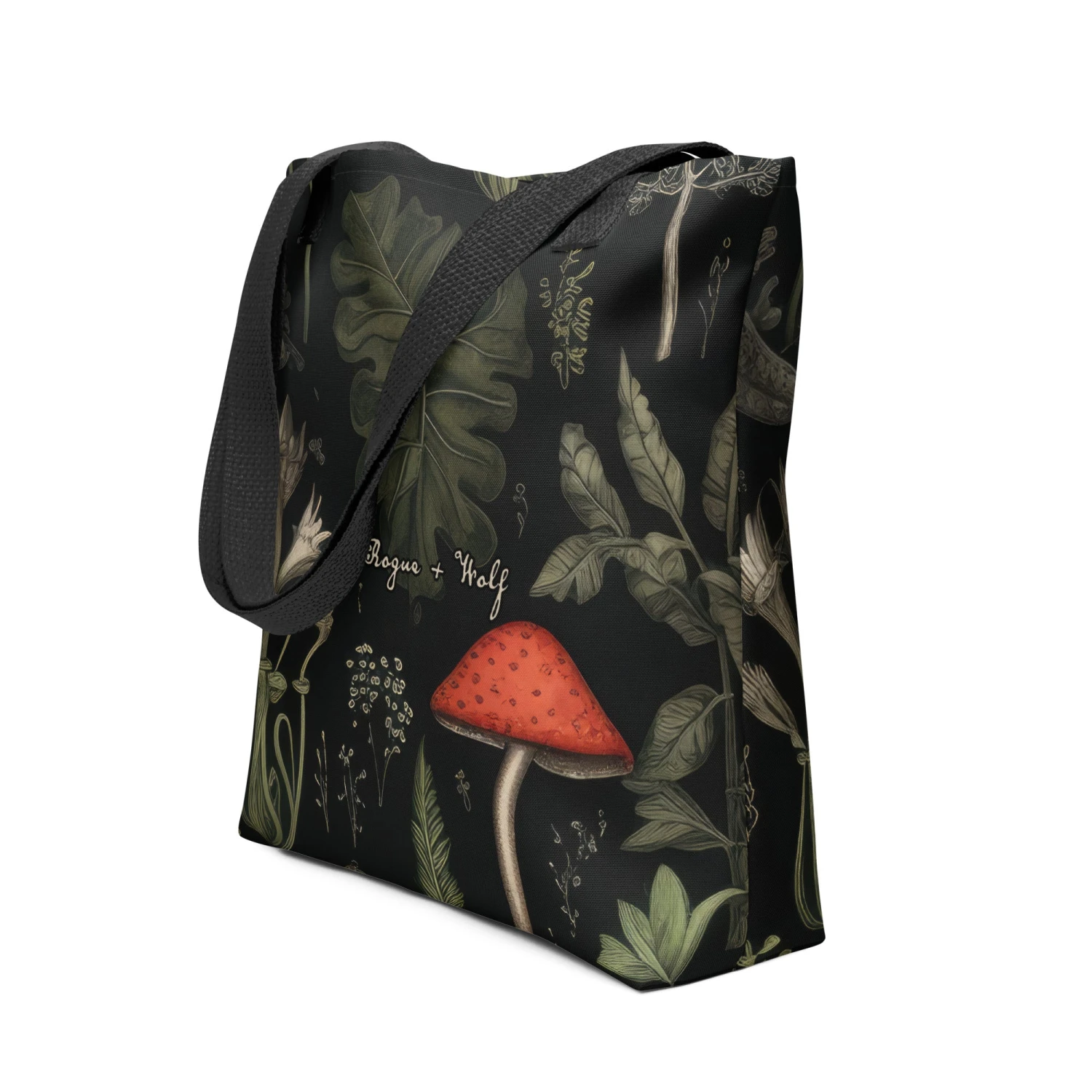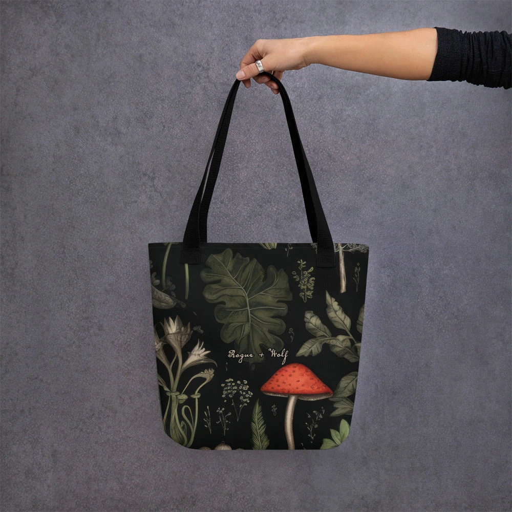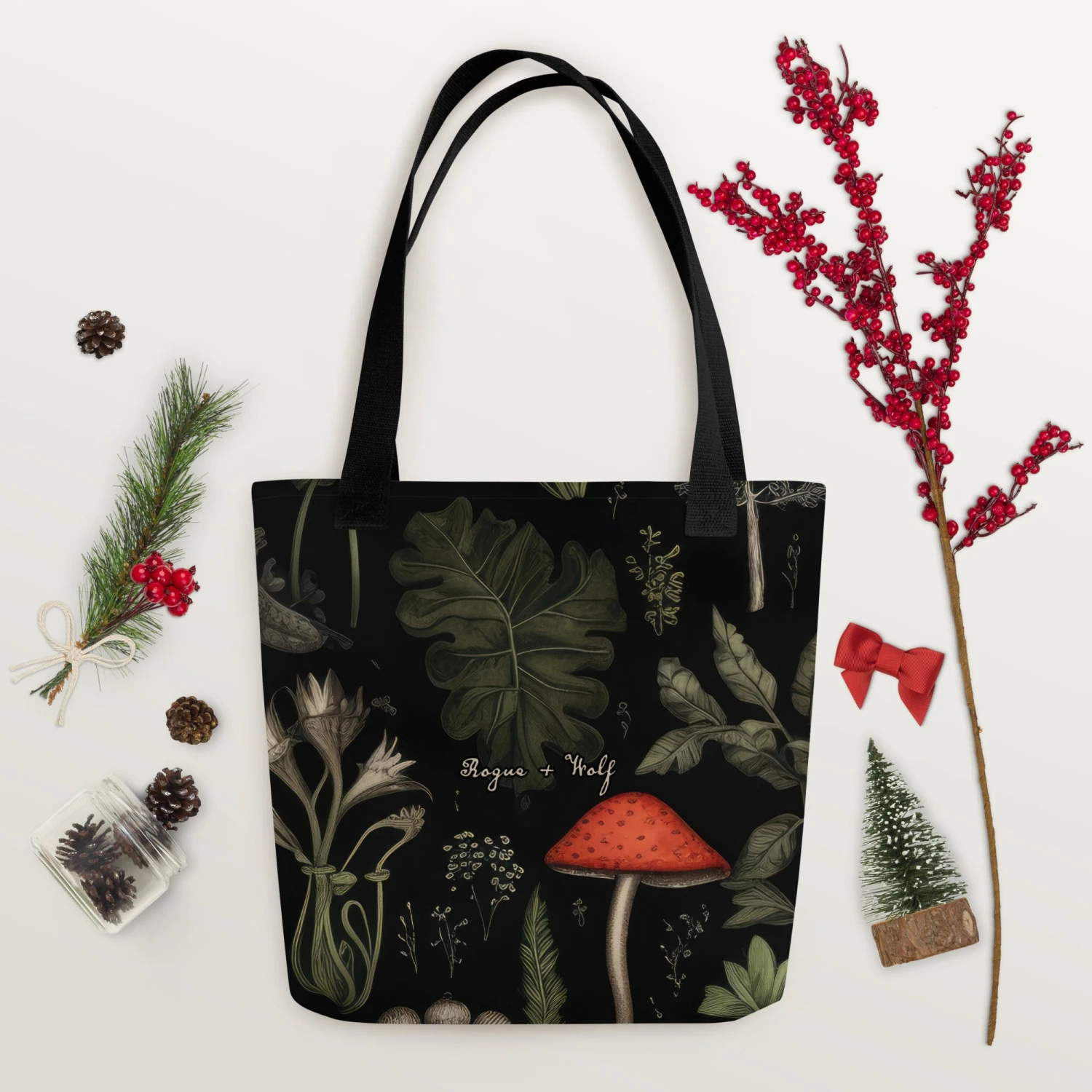 Drift into the ethereal charm of an old botanical tome with our Foraging Tote Bag, perfectly capturing a witch’s day of gathering herbs and mushrooms under its bewitching pattern. Imbued with the essence of a winter spell, it’s a trove for your soul and your haul.