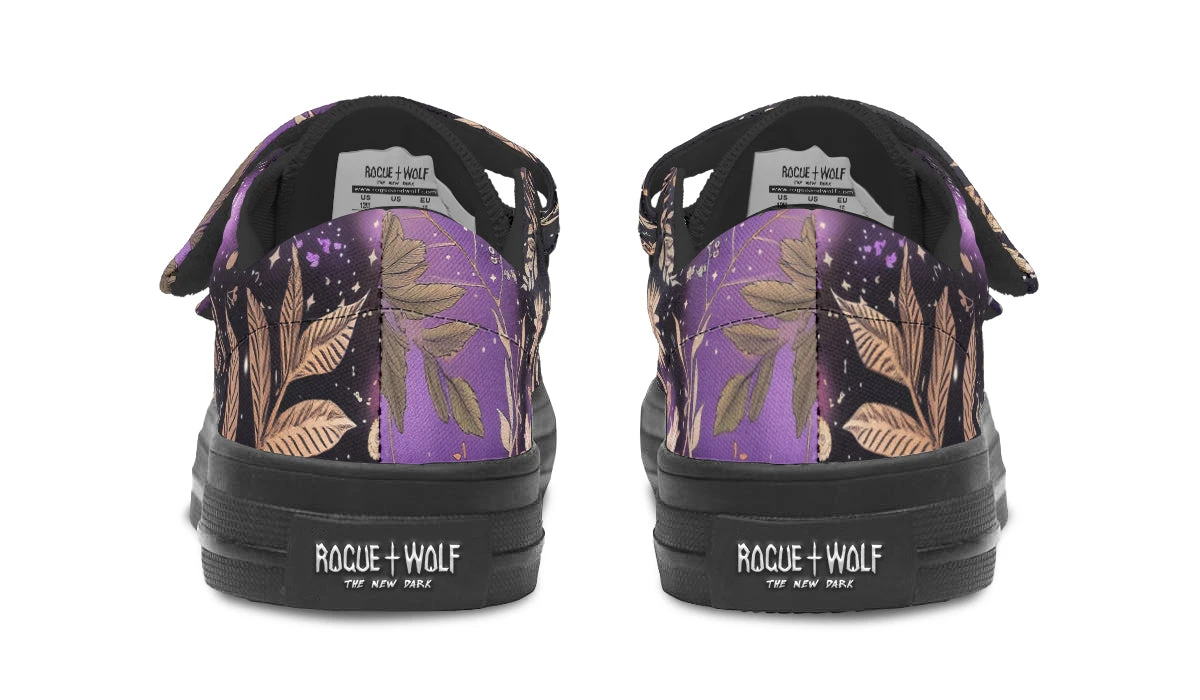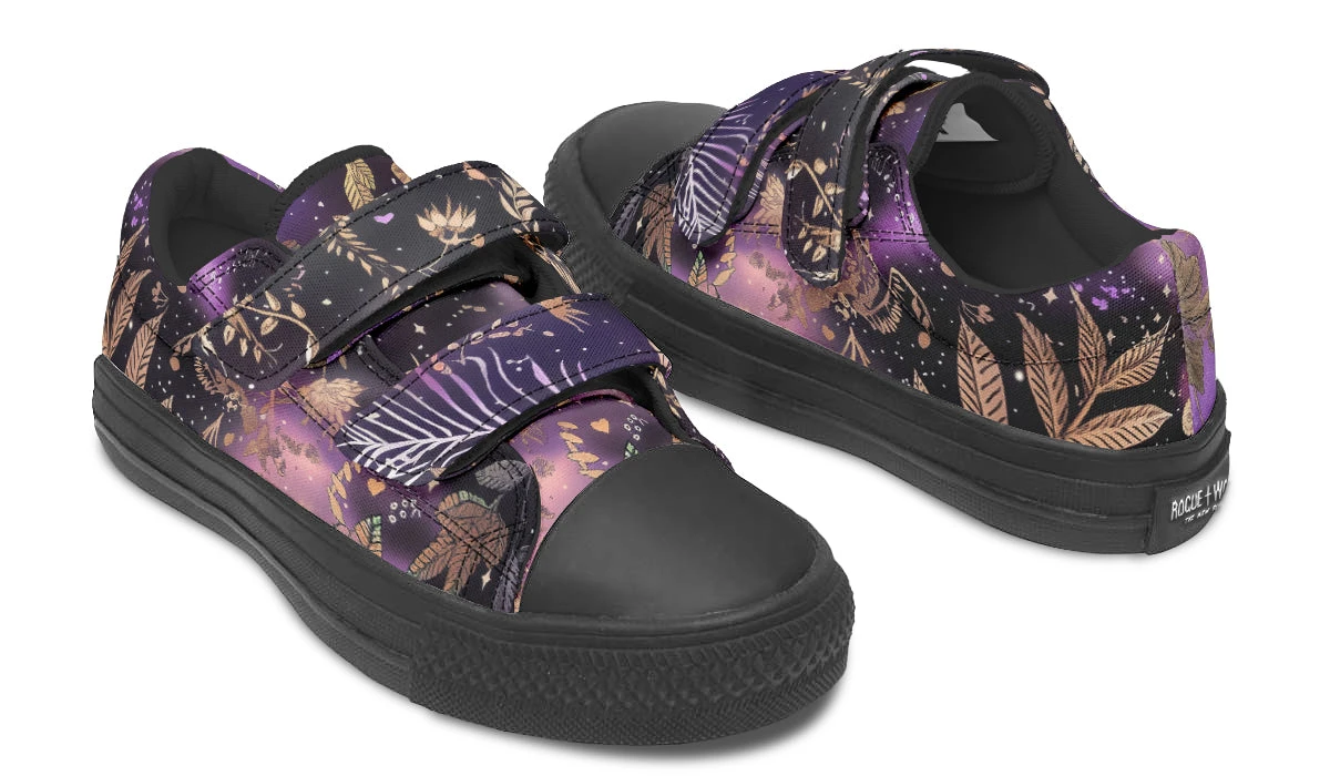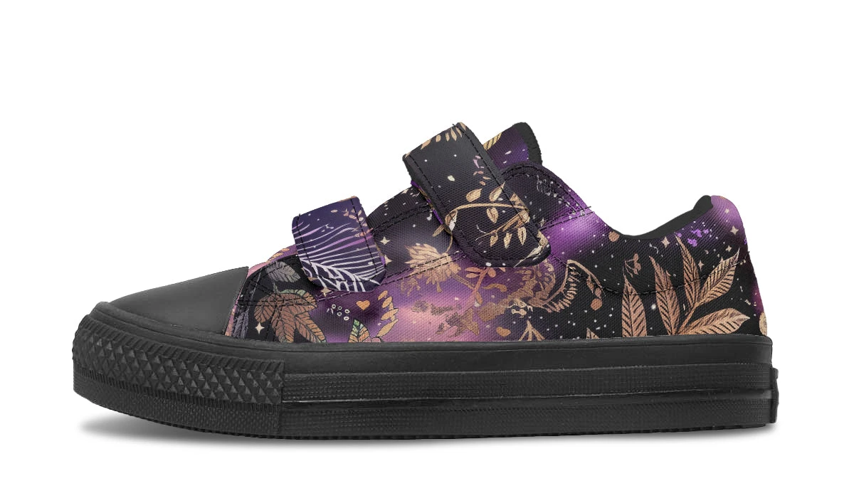 With Galactic Bloom Kids Low Tops, let your little ones step into a universe teeming with gold-dusted mysteries and enchanted flora. A cosmic backdrop in deep purples and blacks, sprinkled with stars, whispers tales of the endless night skies. It’s style that’s truly out of this world!