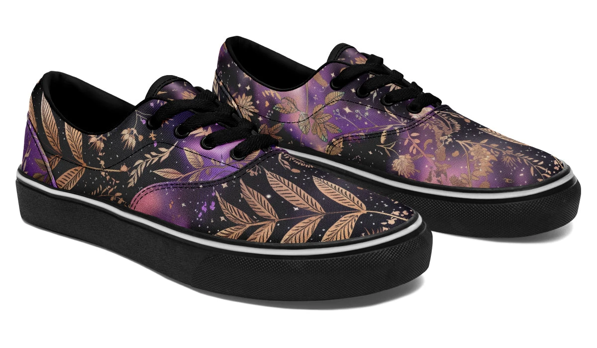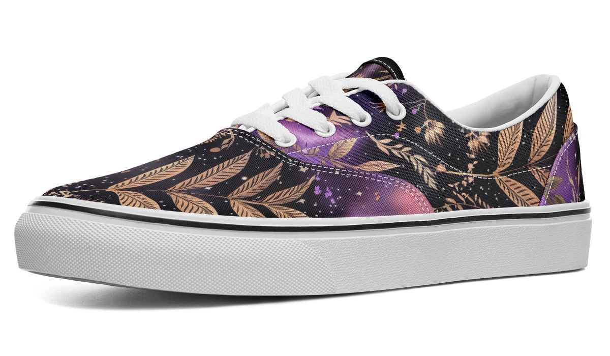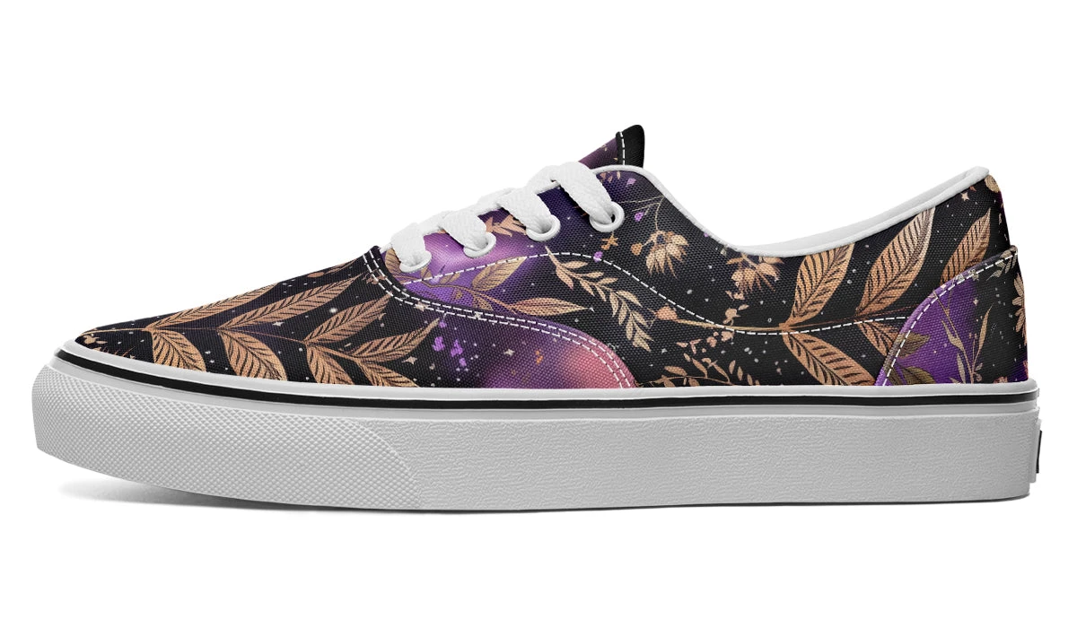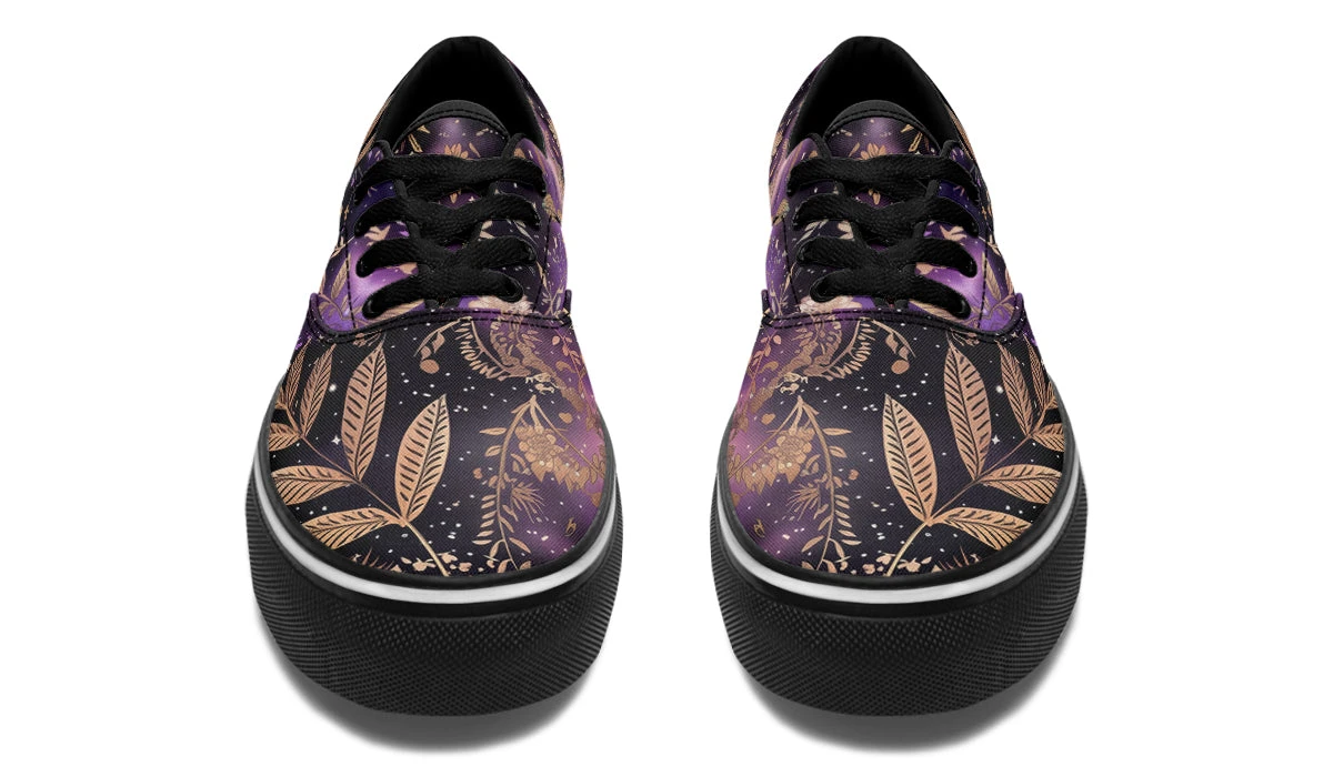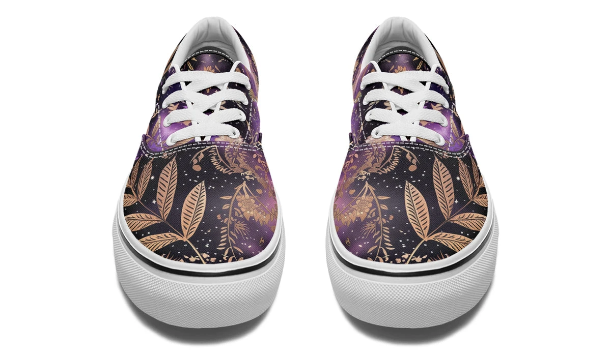 Step into the cosmic wild with our Galactic Bloom Street Sneakers. Enchanting gold leaves and flowers weave through a starlit cosmic expanse, where vibrant colors meet the mysterious allure of a midnight sky. Perfect for modern witches who walk among mortals.
