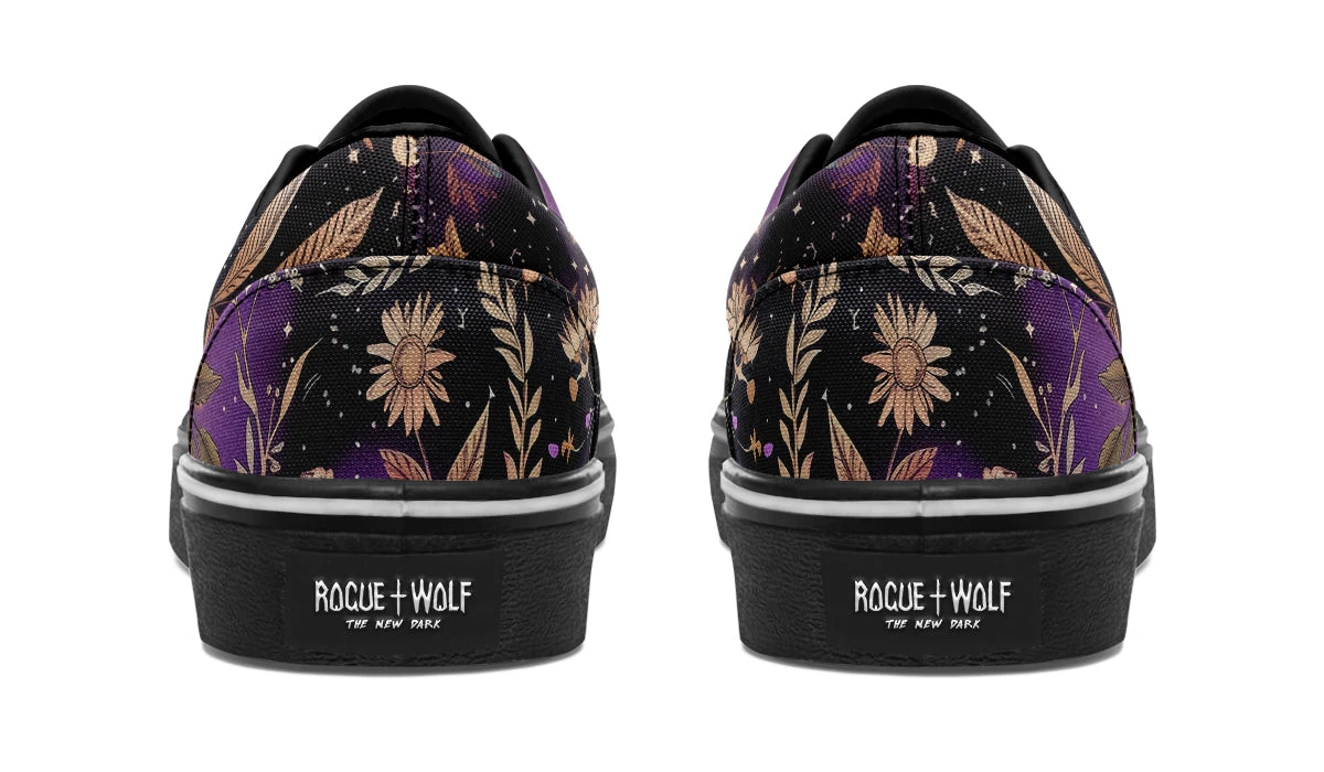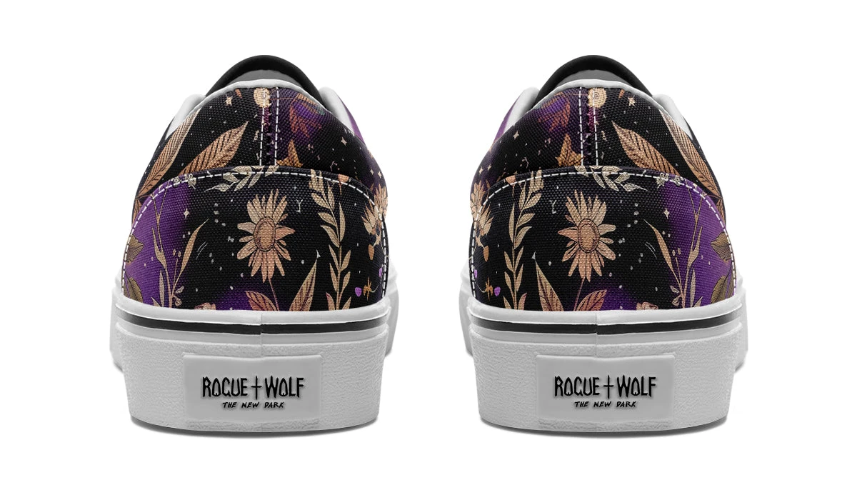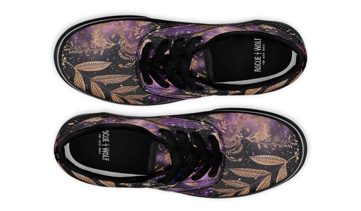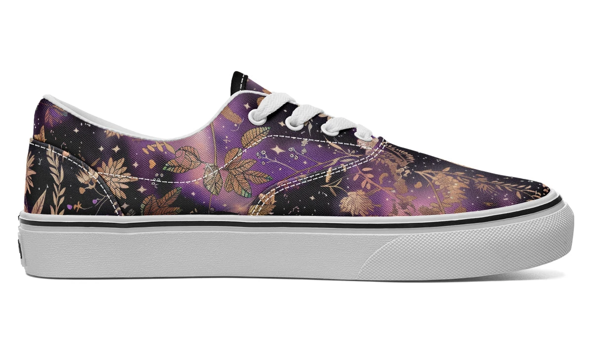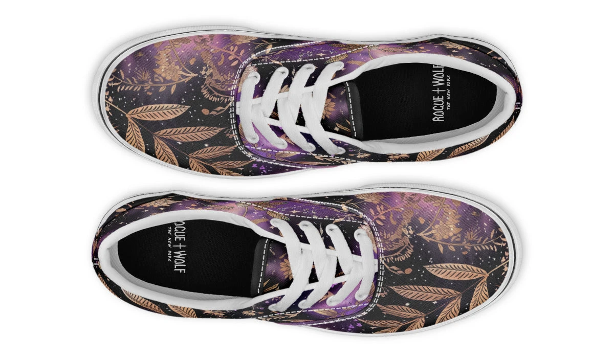Step into the cosmic wild with our Galactic Bloom Street Sneakers. Enchanting gold leaves and flowers weave through a starlit cosmic expanse, where vibrant colors meet the mysterious allure of a midnight sky. Perfect for modern witches who walk among mortals.