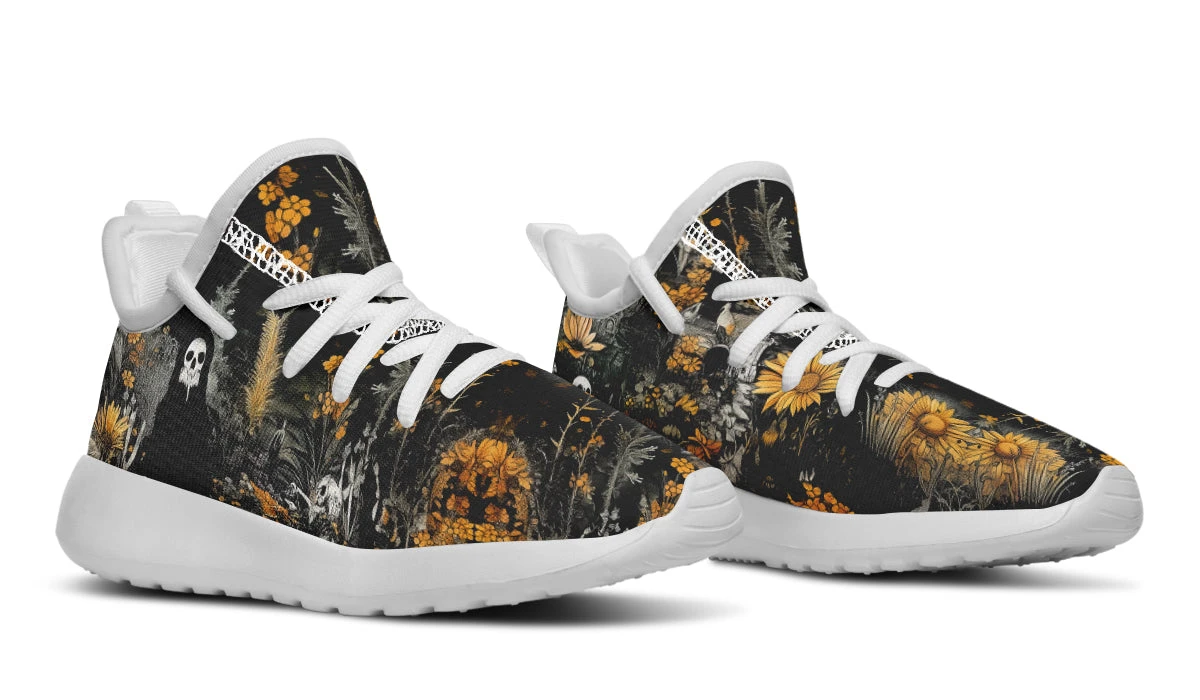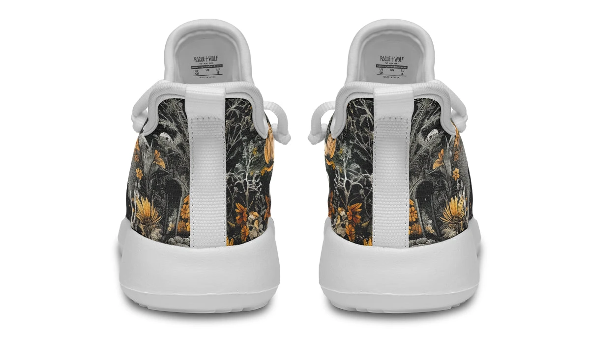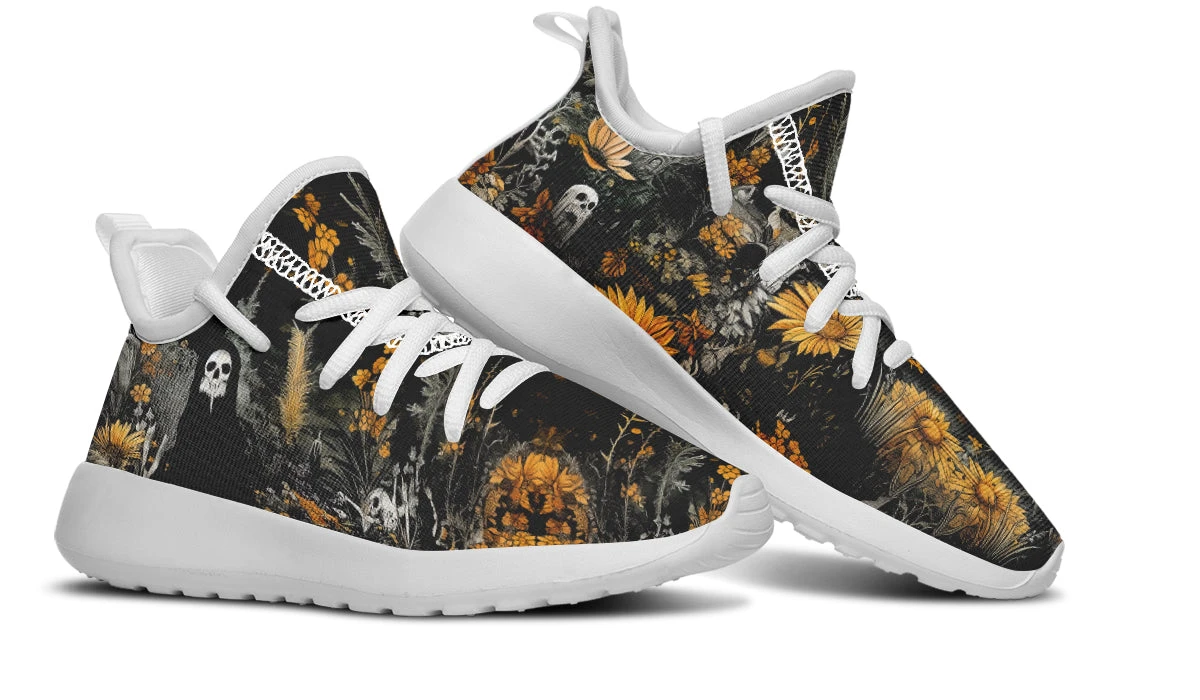 Embrace the dance of life and death with Grim’s Harvest Kids Sneakers. Crafted for the little witches and wizards who hear whispers beyond the veil, these sneakers bring Death’s Garden alive at their feet with a spectral symphony of dark and vivid contrasts.