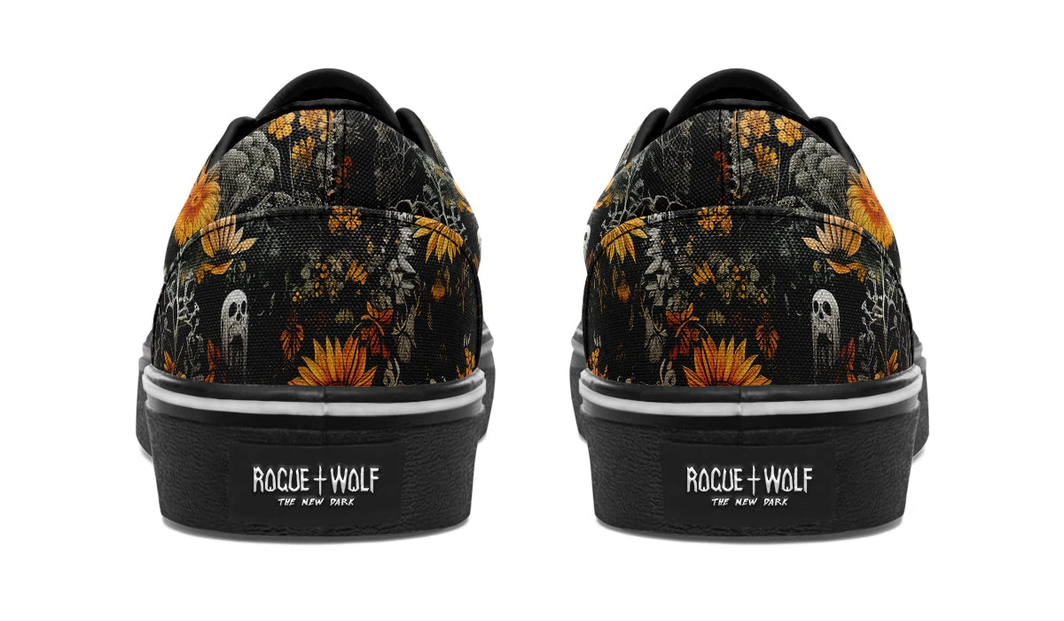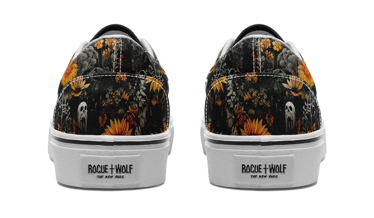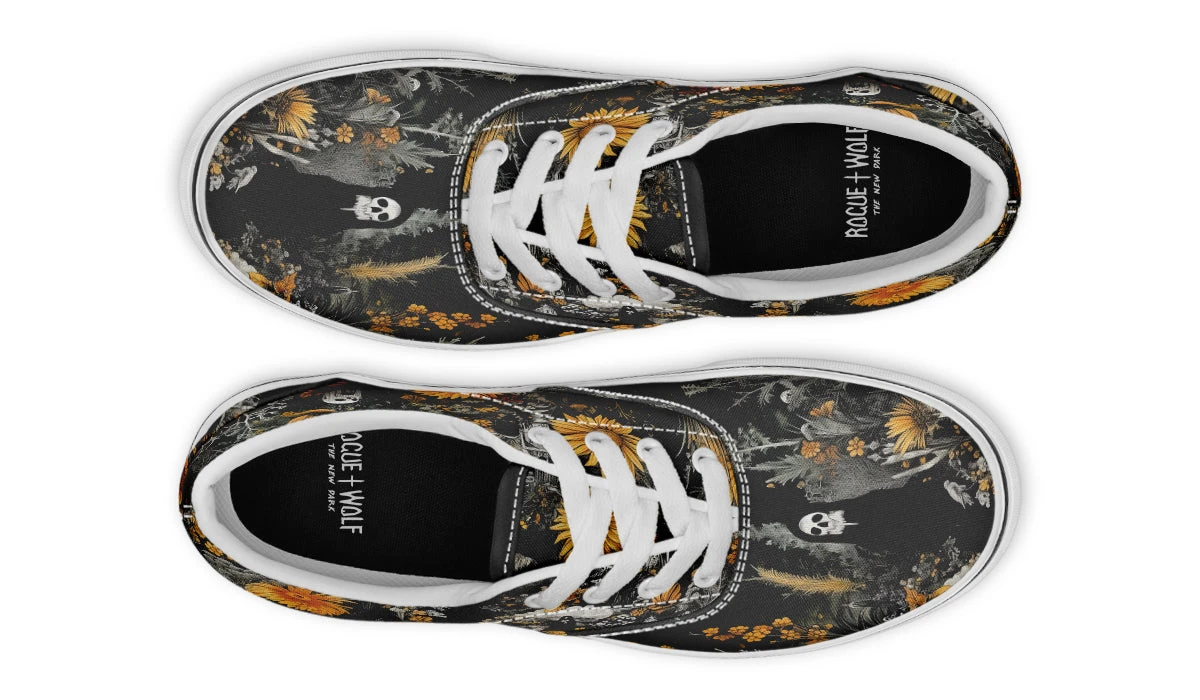 Step into a world where life and death entwine in a haunting ballet—Grim’s Harvest Street Sneakers from Rogue + Wolf invite you to wander through Death’s Garden, where spectral figures and skeletal whispers accompany vibrant bursts of orange sunflowers and wheat. These sneakers capture the gothic allure and supernatural vibes that are the heart and sole (see what we did there?) of our brand.