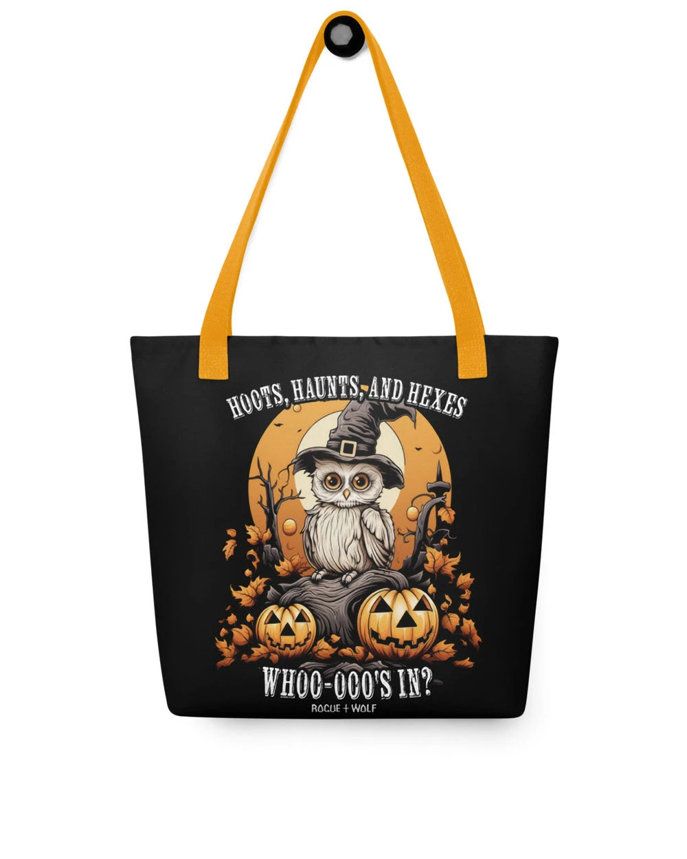 Immerse yourself in the mystical allure of Halloween with our ‘Hoots, Haunts, and Hexes’ tote bag by Rogue + Wolf. A blend of witchy vibes and dark academia, this tote is an invitation into the realm of the supernatural.