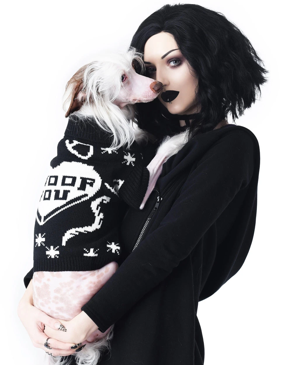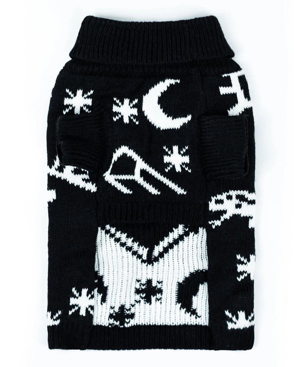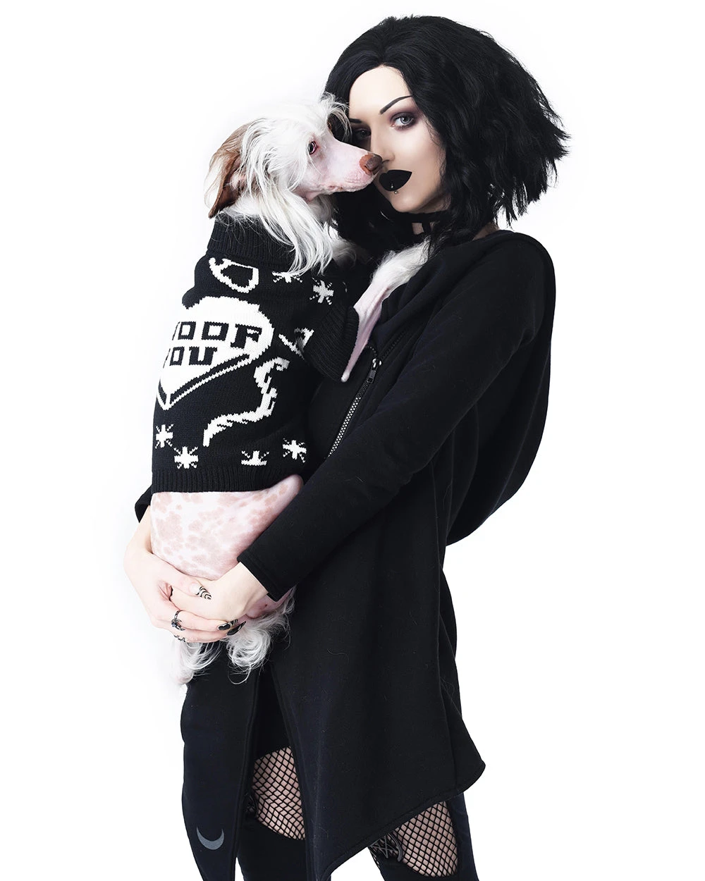 This cutesy black & white Sweater knitted with soft Vegan acrylic Yarn will have even the most stone-faced witches going “Aww!” With a big heart design on the back and witchy objects and creatures scattered all ovah!