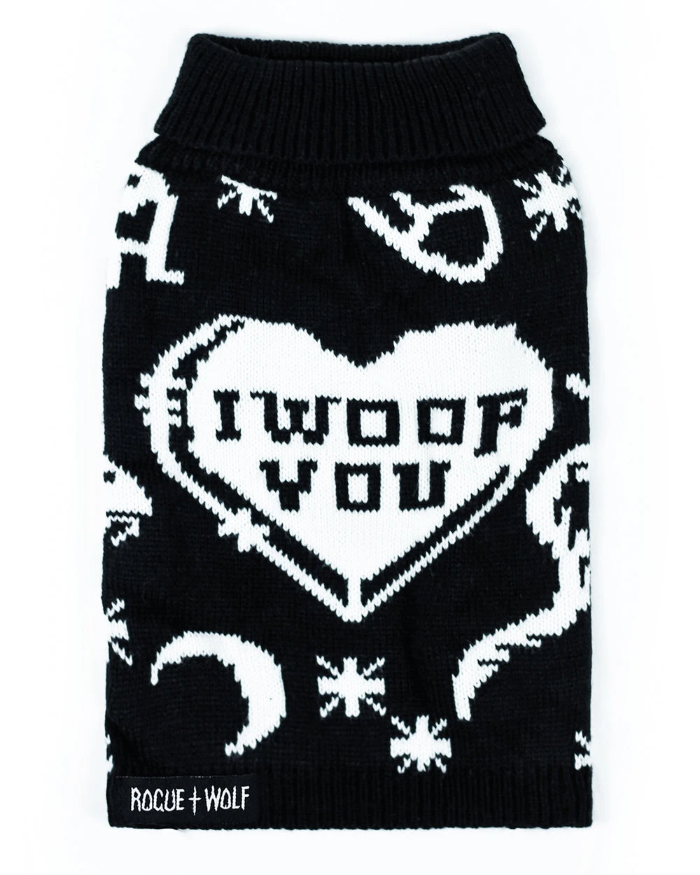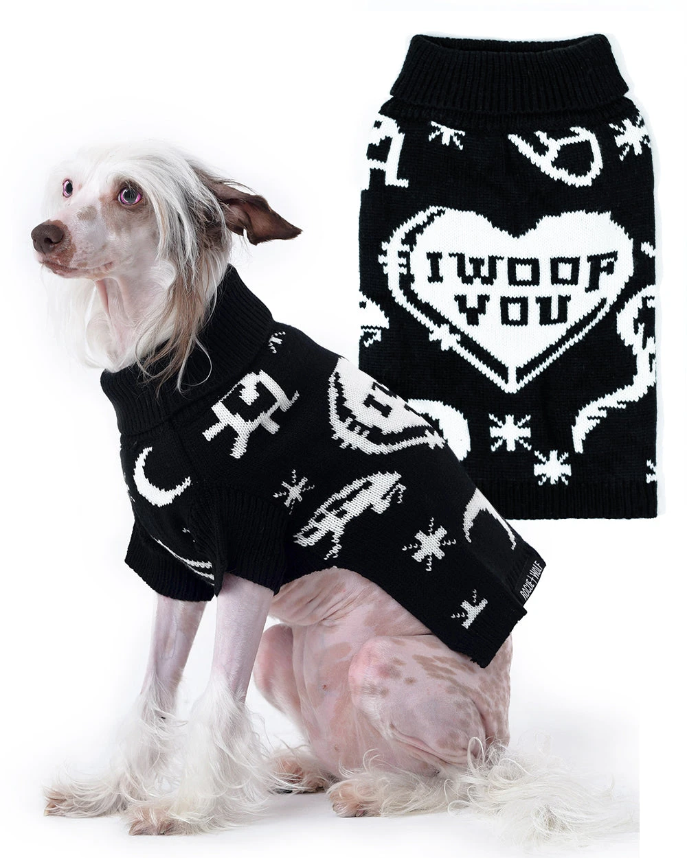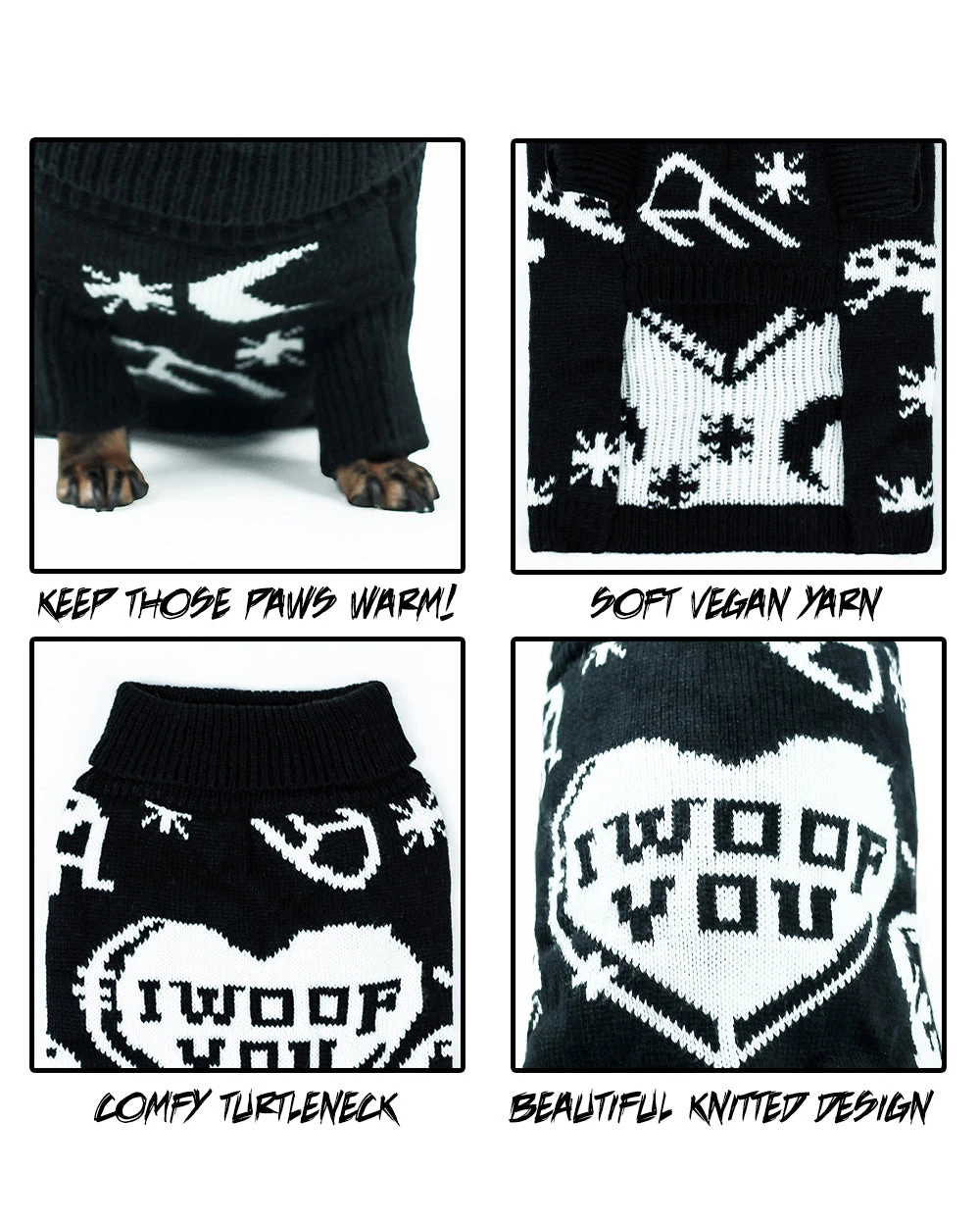 This cutesy black & white Sweater knitted with soft Vegan acrylic Yarn will have even the most stone-faced witches going “Aww!” With a big heart design on the back and witchy objects and creatures scattered all ovah!