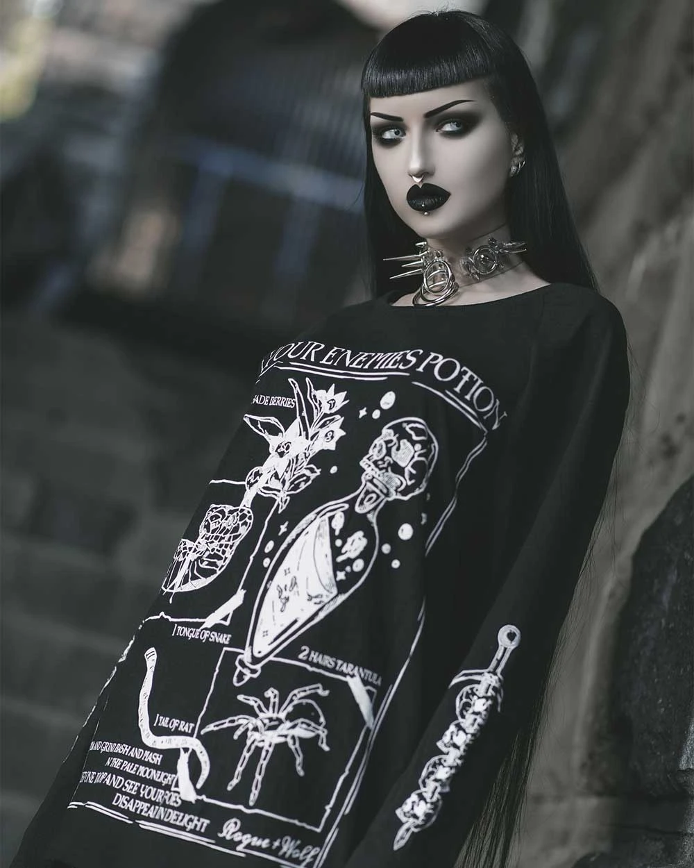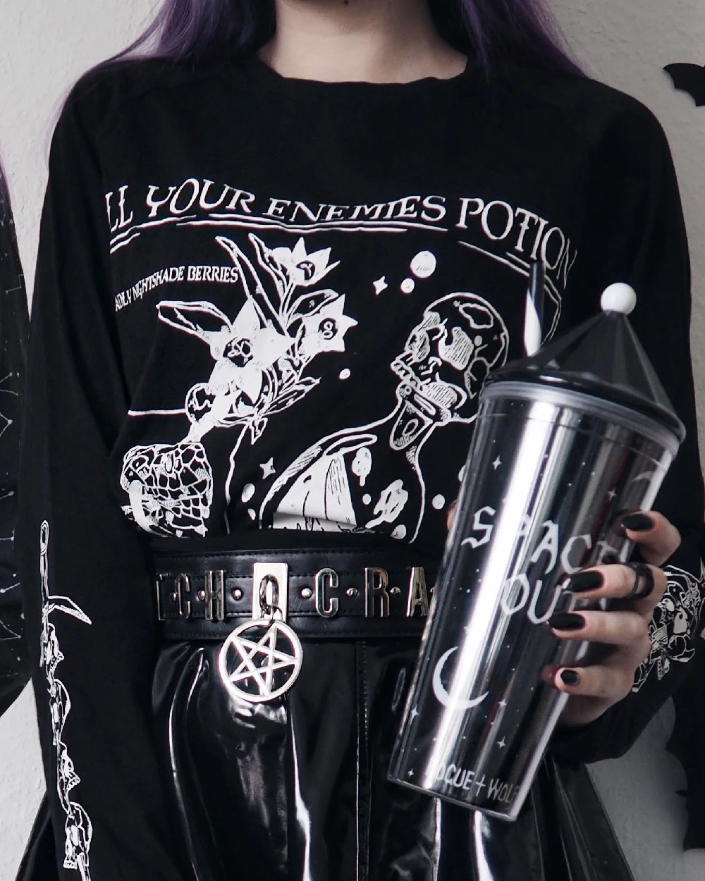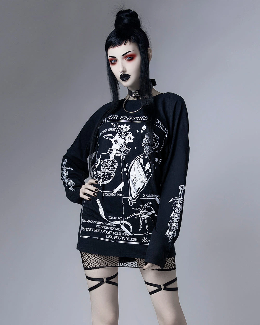An oversized, long-sleeve tee with round neckline, black as night fabric and ancient graphic scroll on the front & sleeves. Wear and watch your foes disappear in delight!