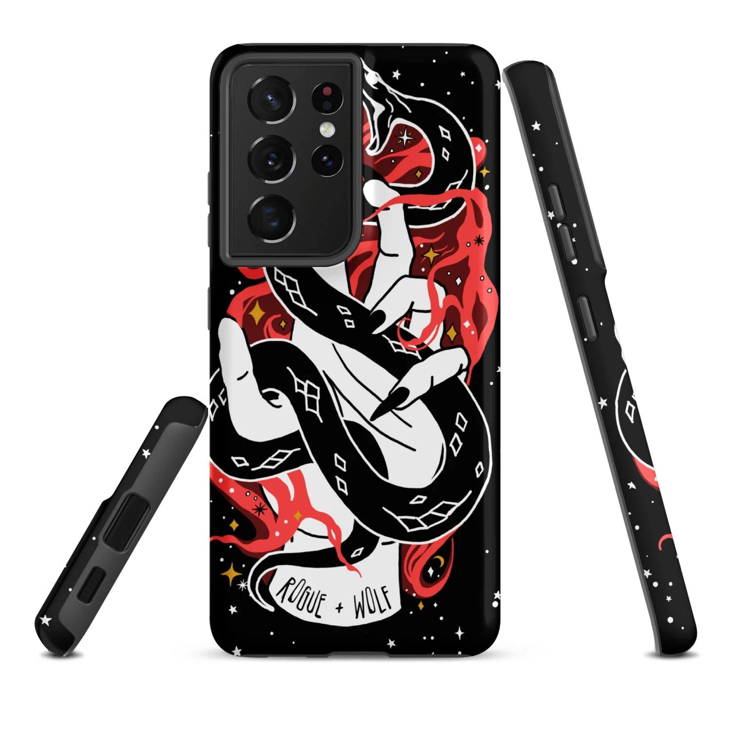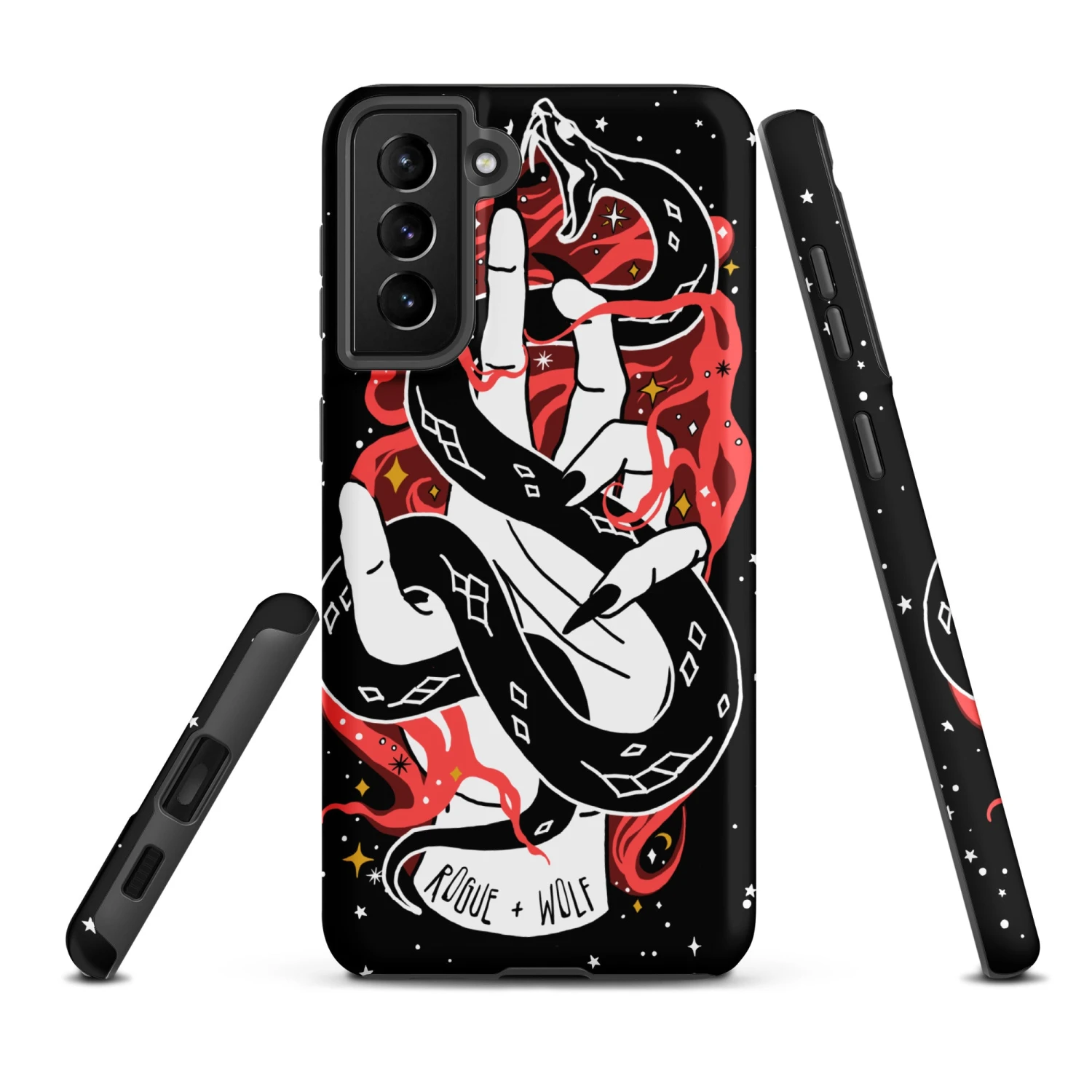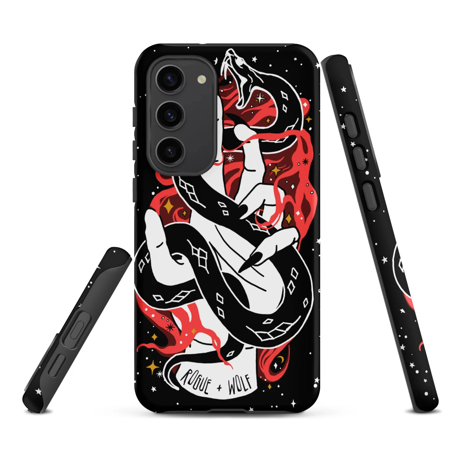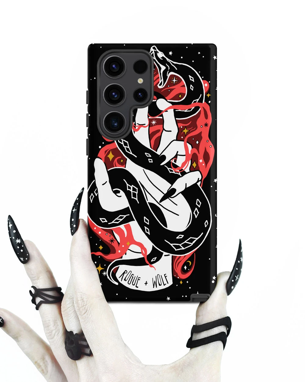 Amidst the swirling crimson mists, a witch’s hand rises, poised and powerful. Wrapped around it, a black snake readies for its bite. Their dark dance is an ode to love, betrayal, and the entwining of fates that none can escape, not even in the realm of phone accessories.