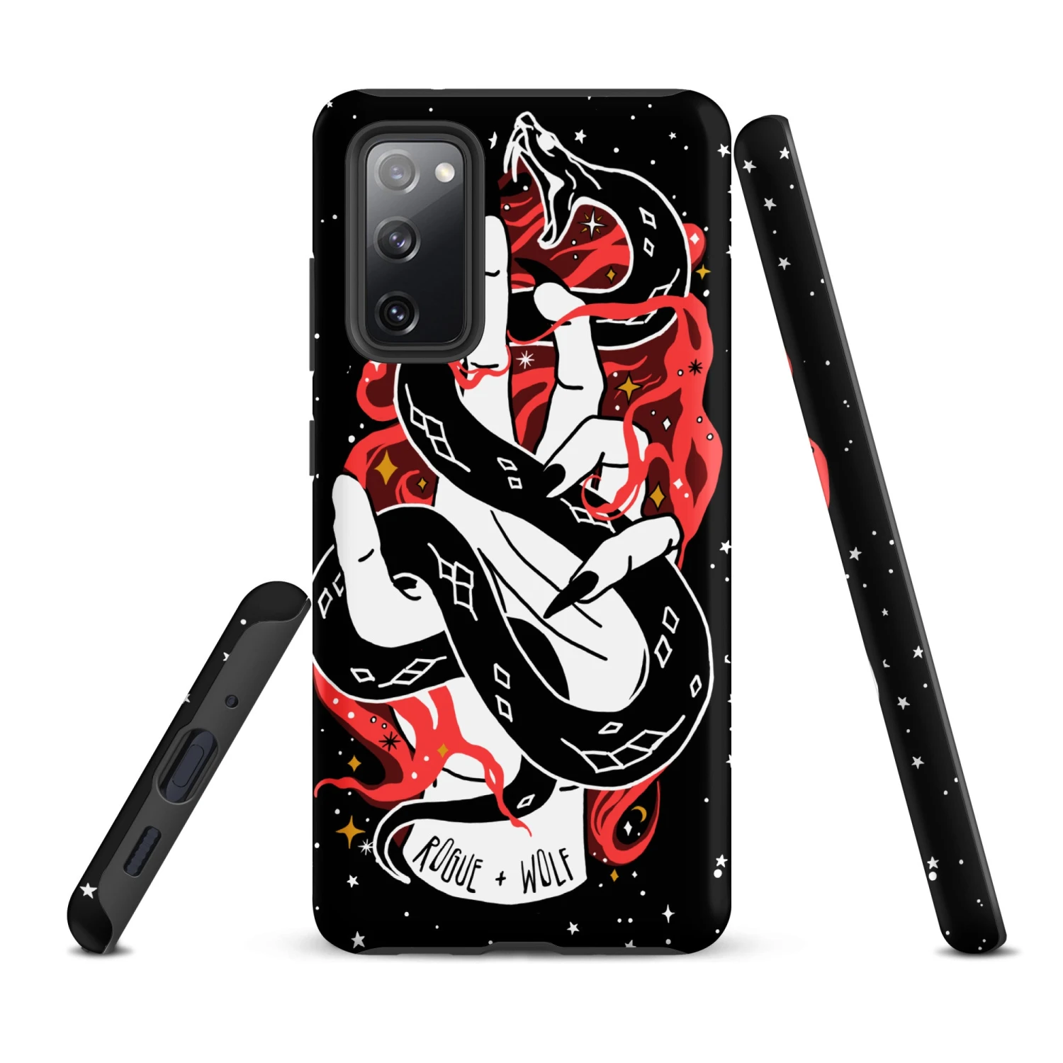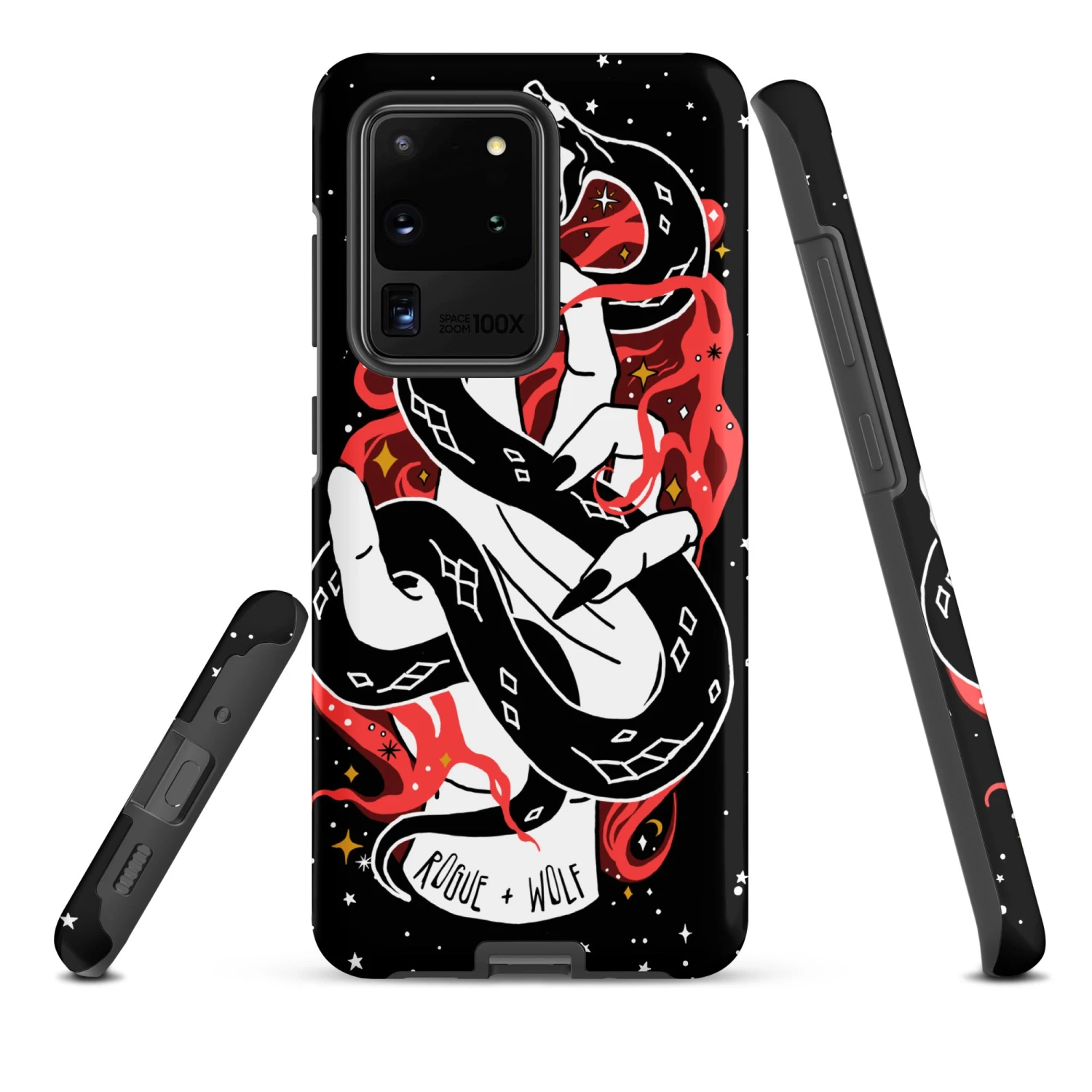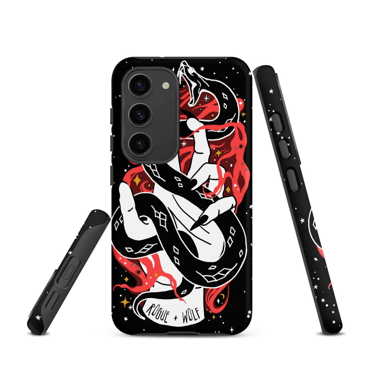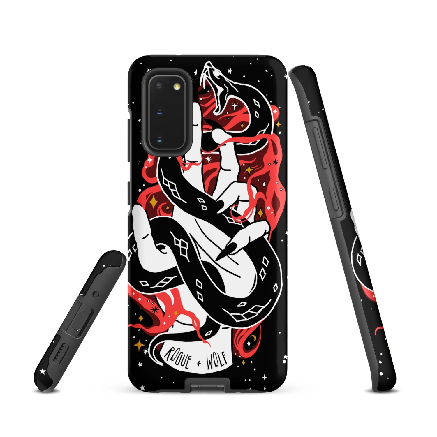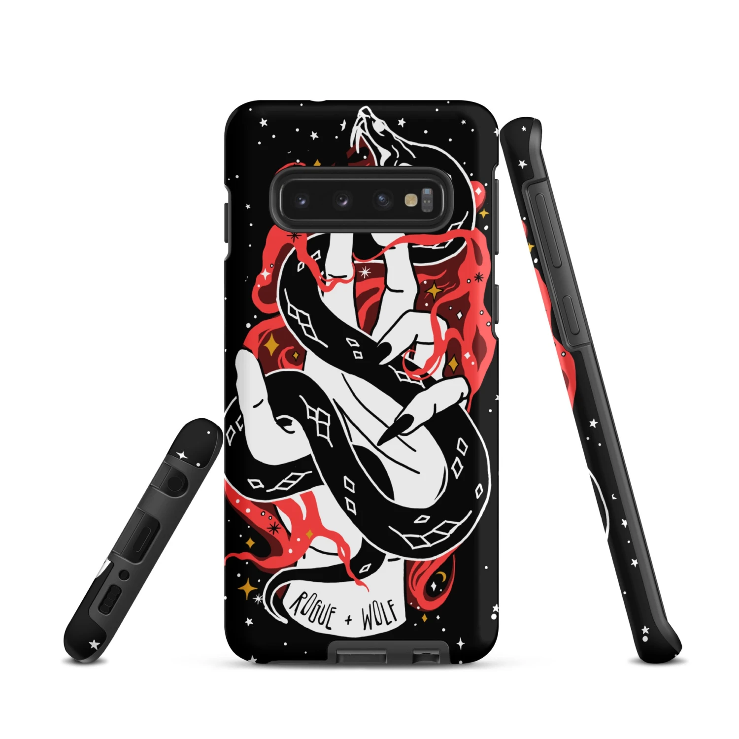 Amidst the swirling crimson mists, a witch’s hand rises, poised and powerful. Wrapped around it, a black snake readies for its bite. Their dark dance is an ode to love, betrayal, and the entwining of fates that none can escape, not even in the realm of phone accessories.