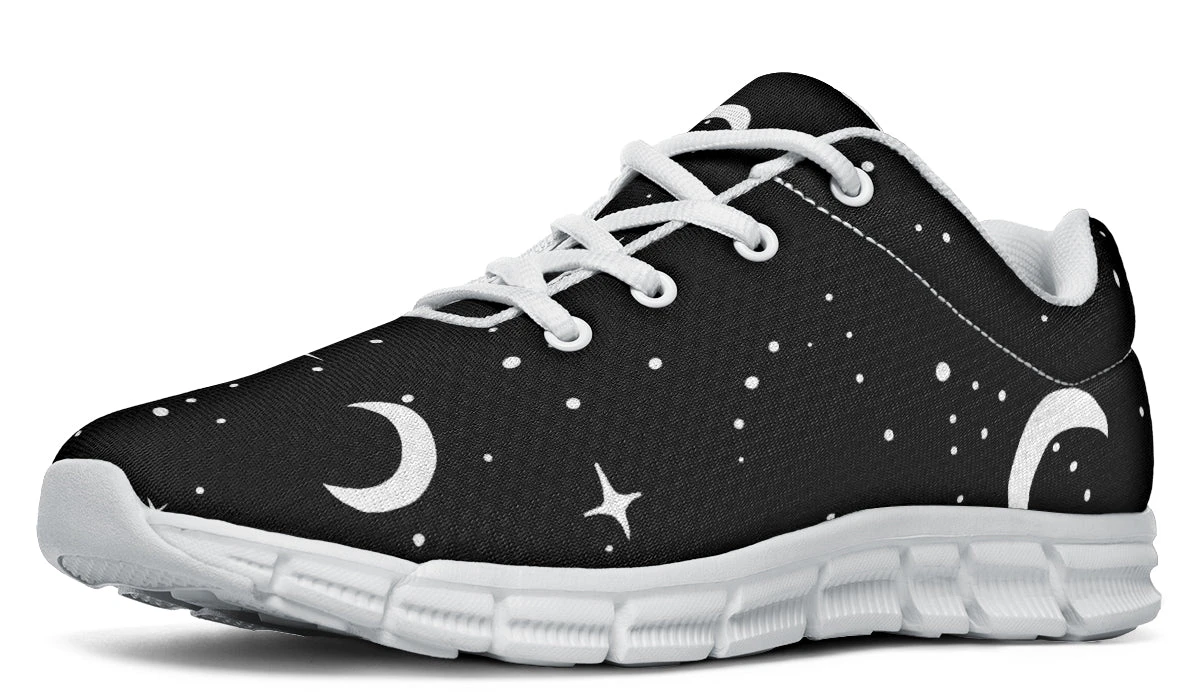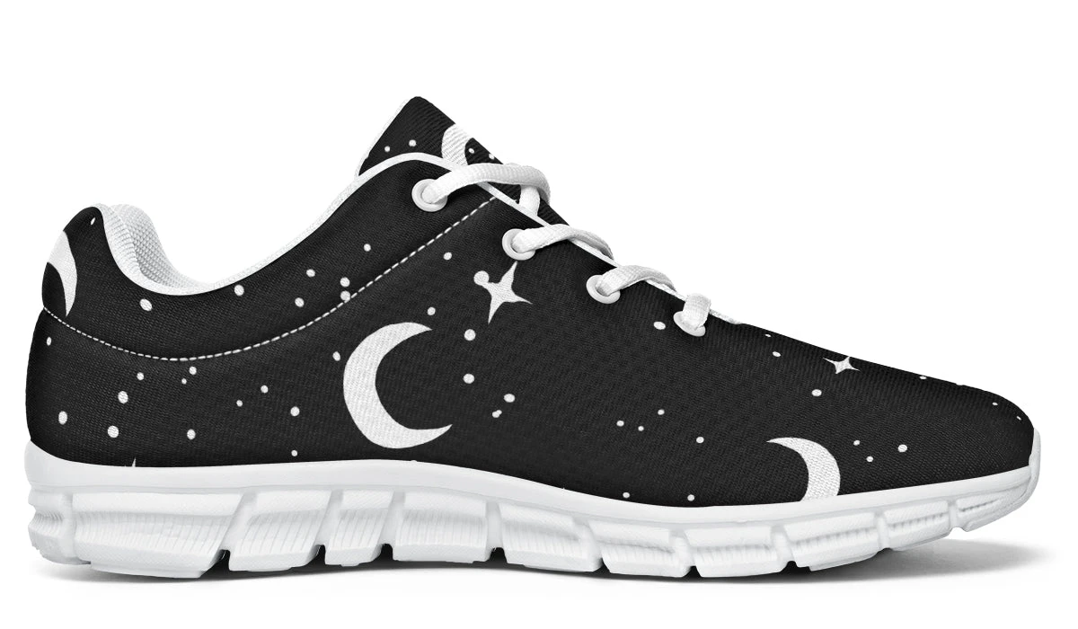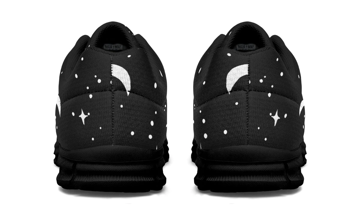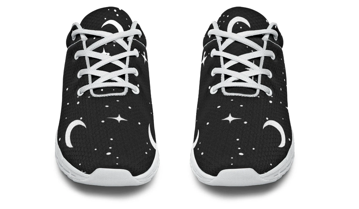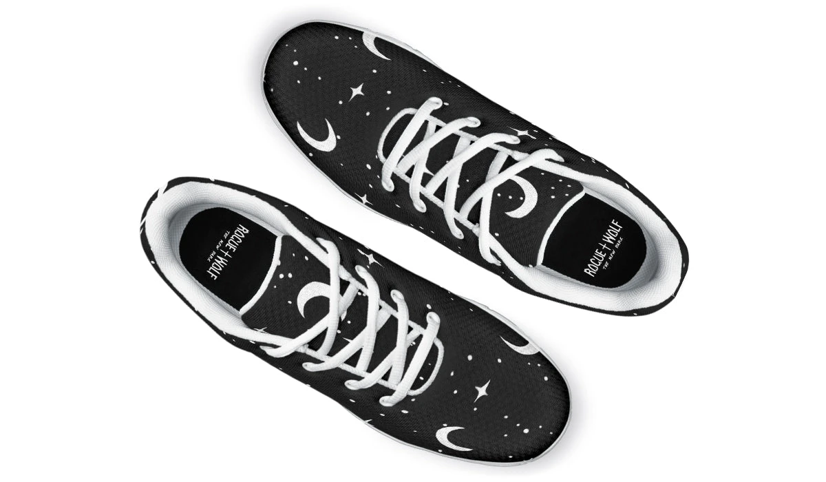 Dive into the moonlight whenever you lace up our MoonDust Athletic Sneakers, designed for those who draw power from the night sky. Painted with moons and stars against a pitch-black canvas, these sports shoes capture the essence of midnight walks and shadowy adventures. Perfect for the gothic soul with an exercise routine as mysterious as their style.