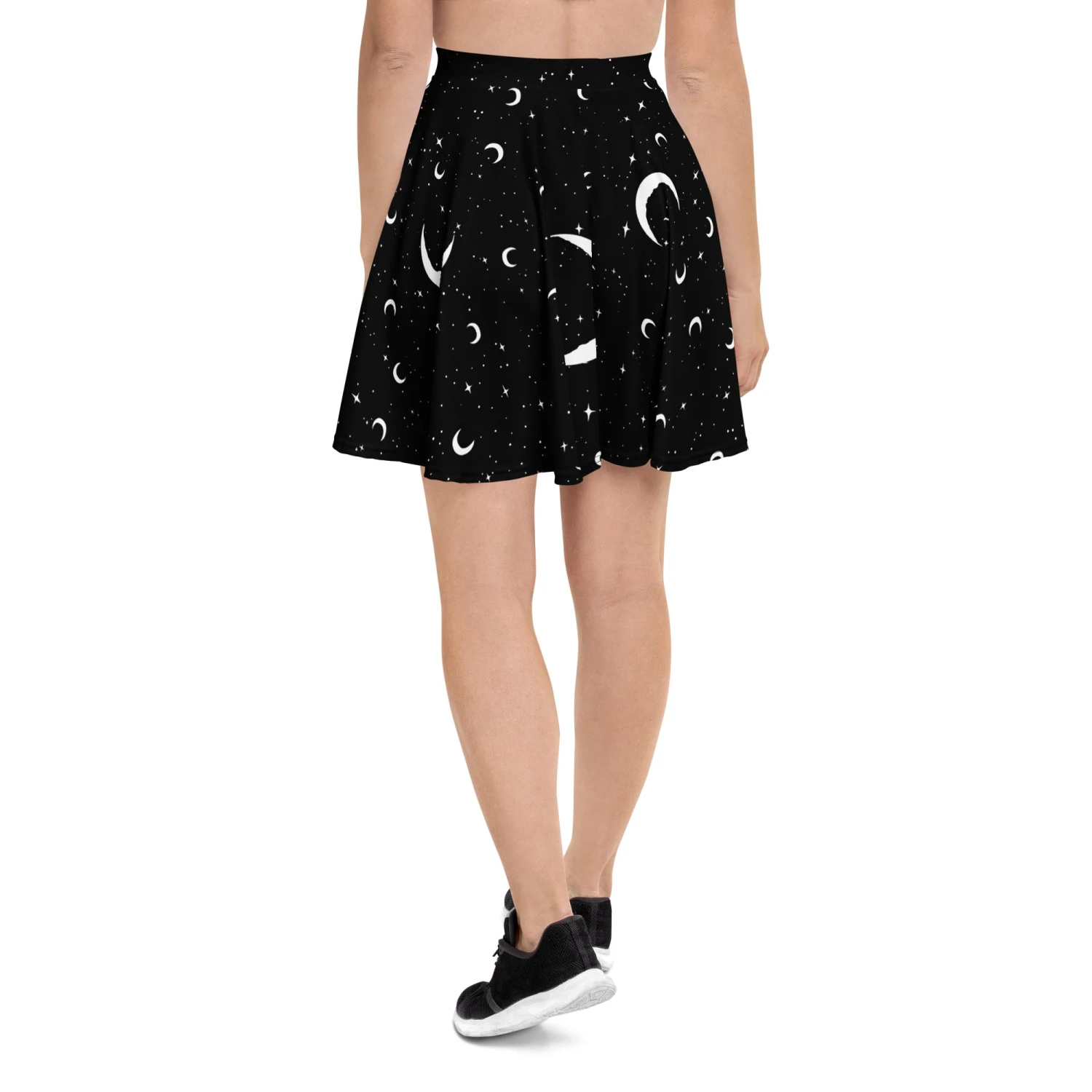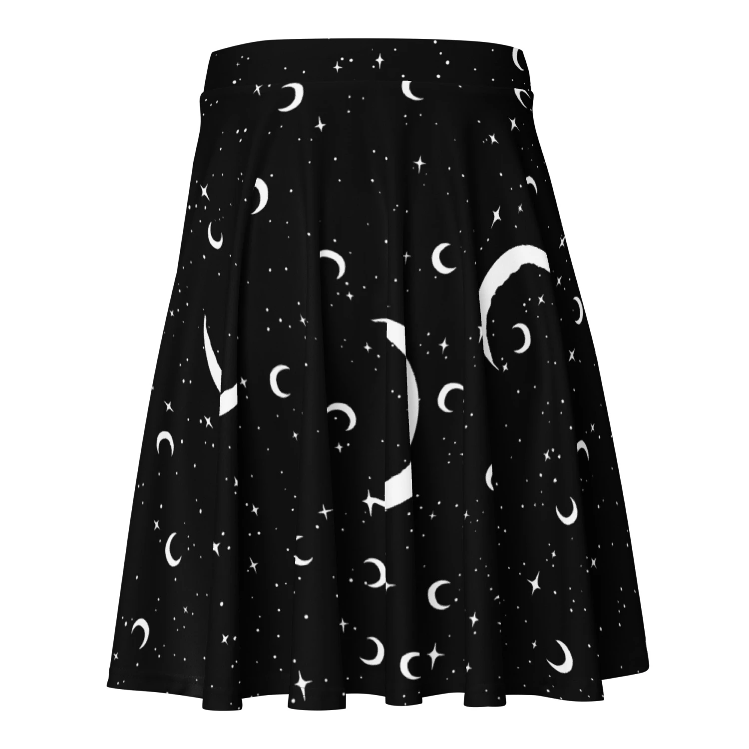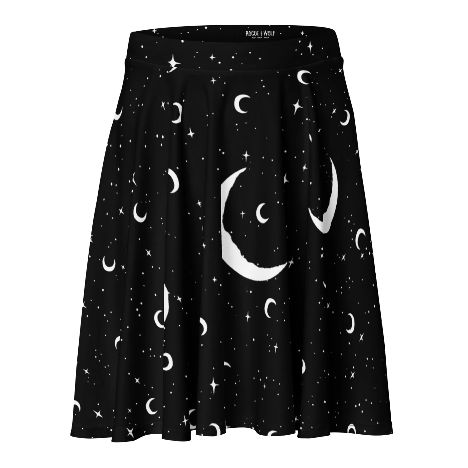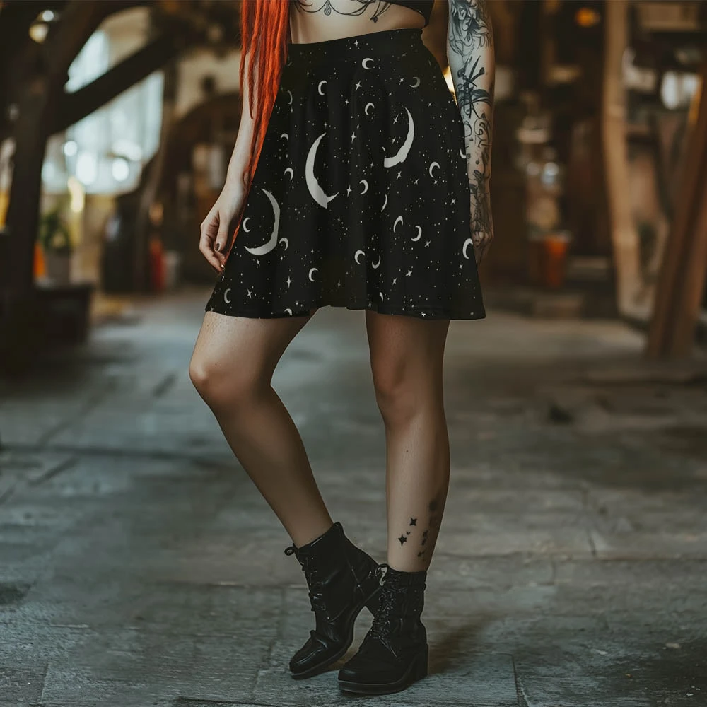 Slide into the shadows in our MoonDust Skater Skirt, a captivating spell cast in blackest night, sprinkled with moons and shimmering stars for the witch who wears darkness proudly. Perfect for conjuring envy at midnight gatherings with The Coven or just vibing beneath the cosmos.
