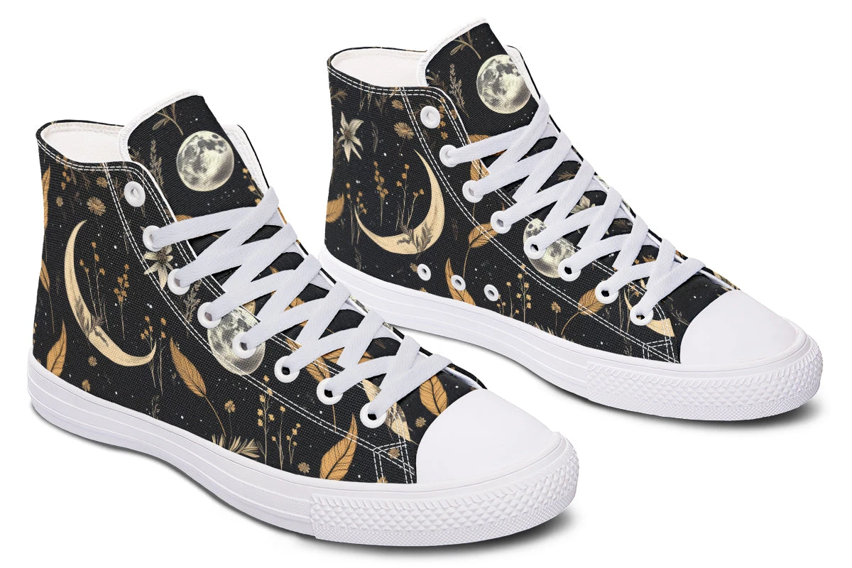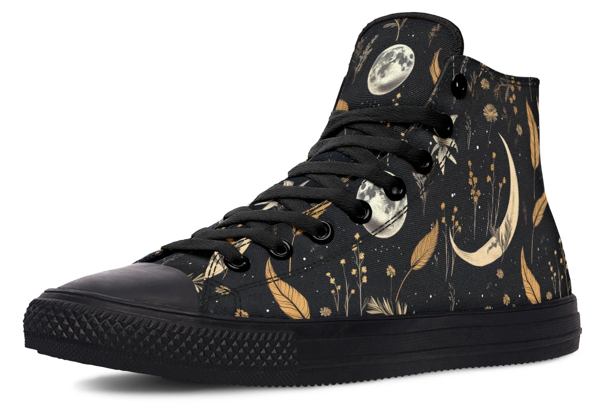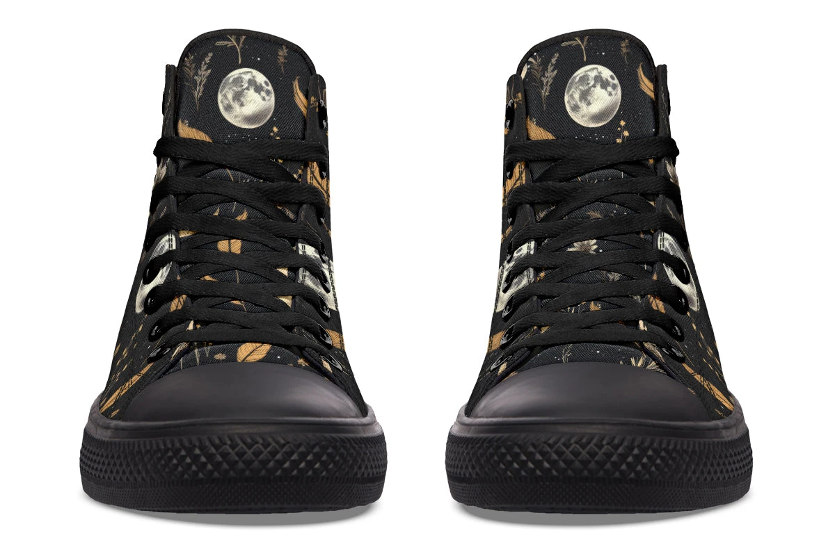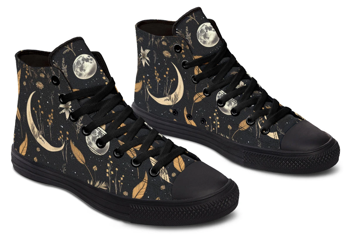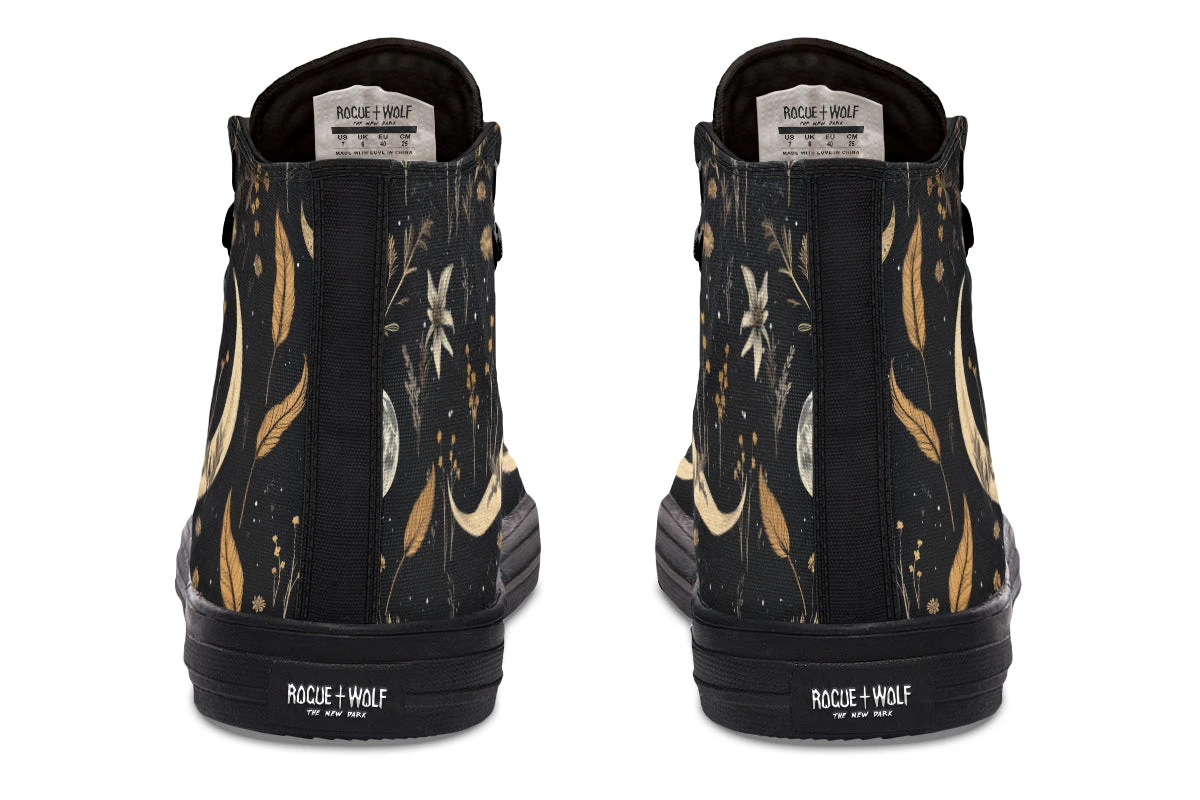 Step into a world of enchantment with these bewitching high tops, adorned with a mesmerizing pattern of moons and magical herbs against a starry black backdrop. These shoes are so spellbinding, you might just find yourself accidentally casting a love potion on everyone who sees them (or at least making them fall head over heels for your style).