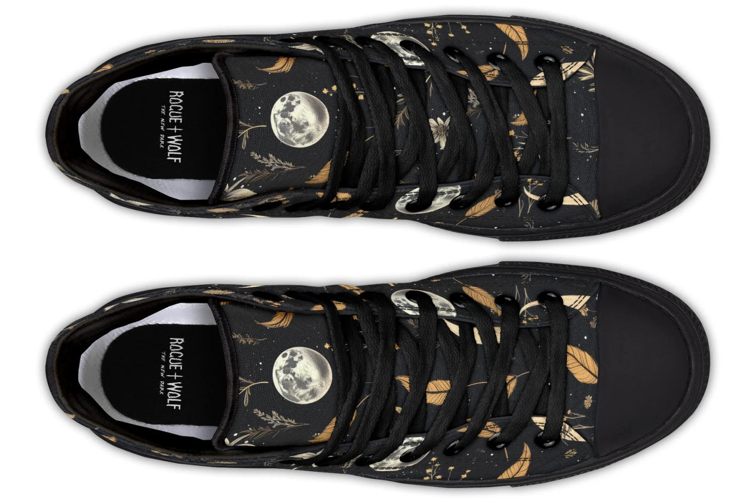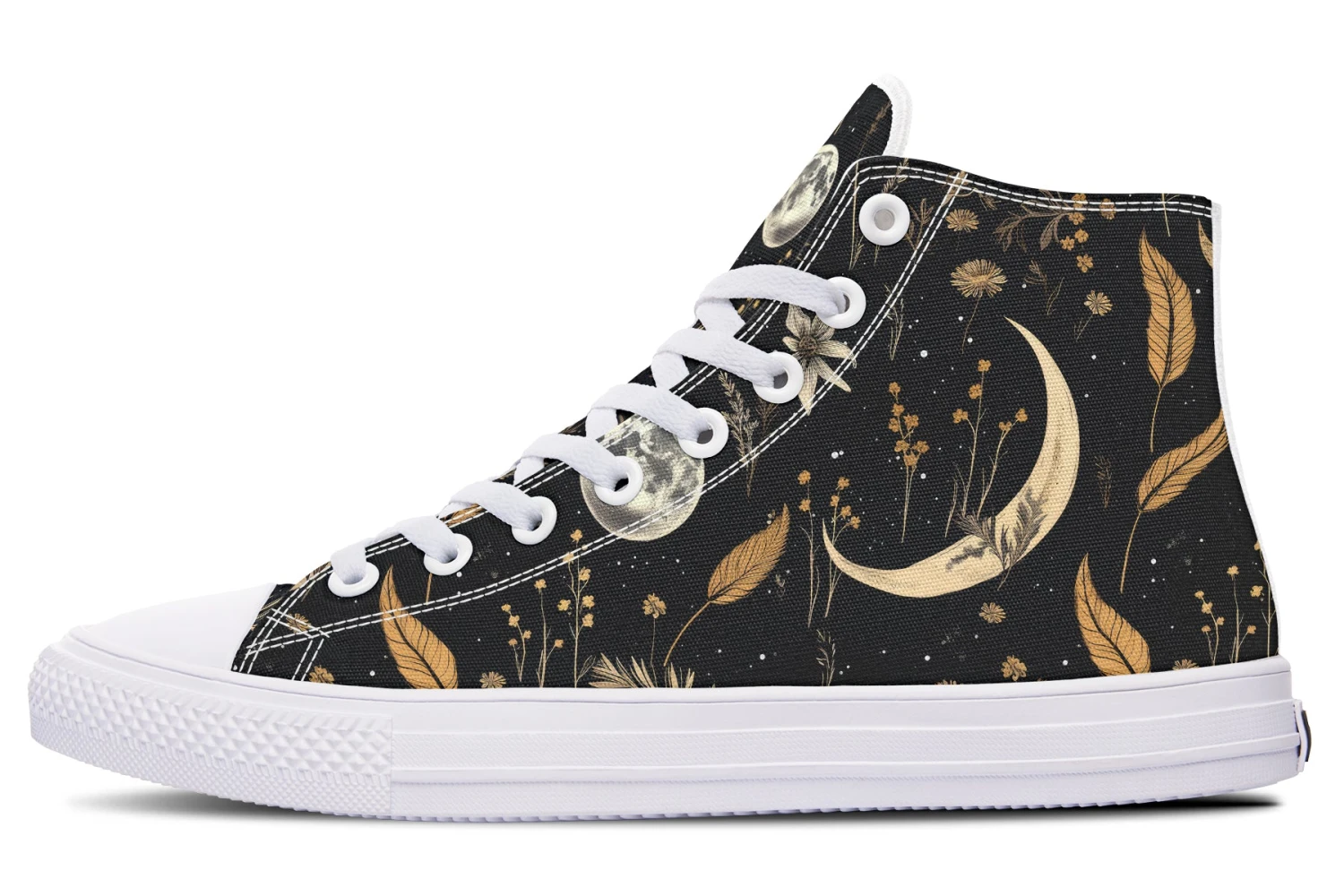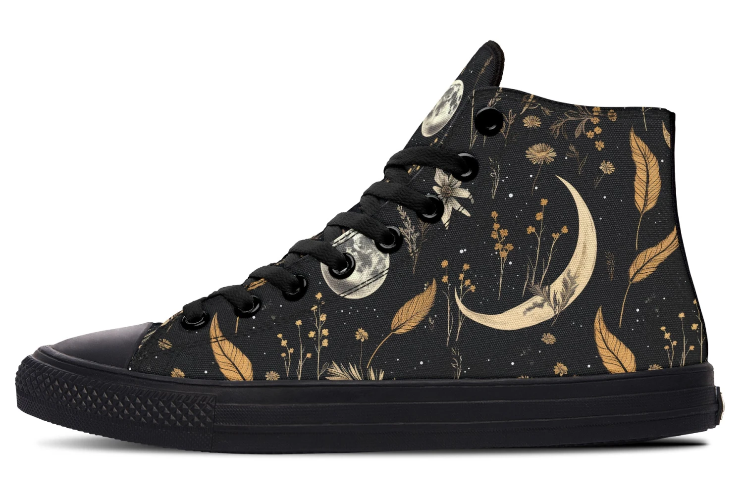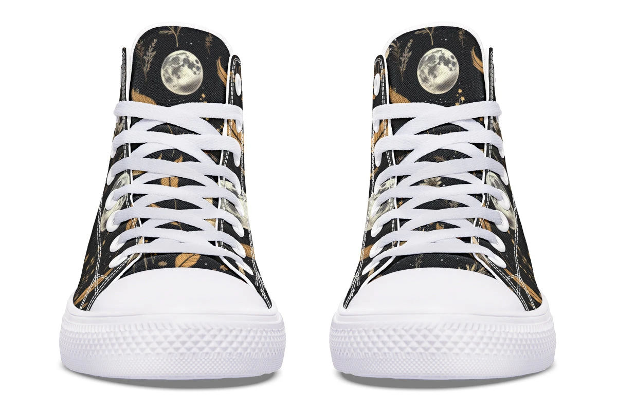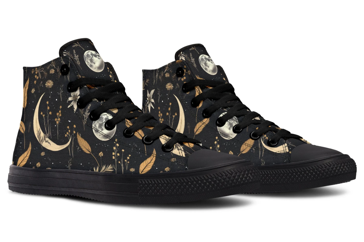 Step into a world of enchantment with these bewitching high tops, adorned with a mesmerizing pattern of moons and magical herbs against a starry black backdrop. These shoes are so spellbinding, you might just find yourself accidentally casting a love potion on everyone who sees them (or at least making them fall head over heels for your style).