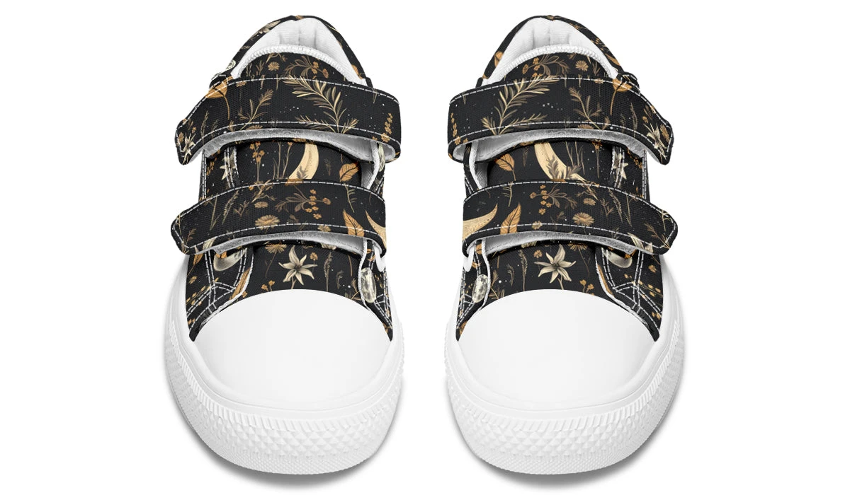 Step into a world where magic meets the moonlight with our Moonlit Botanica Kids Low Tops. These spellbinding shoes are perfect for your mini witch or wizard, casting an irresistible charm with their mystical moons and herbs dancing on a black starry sky.