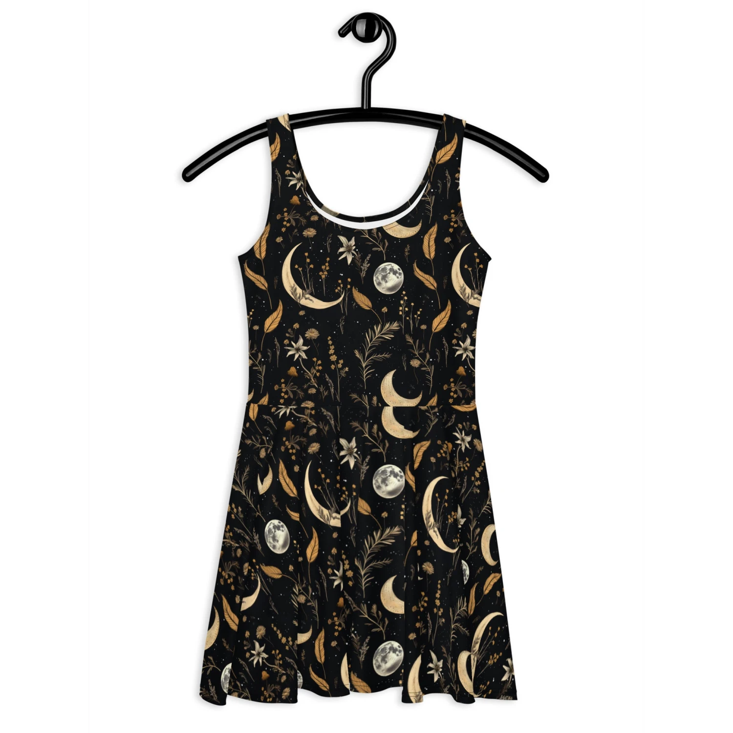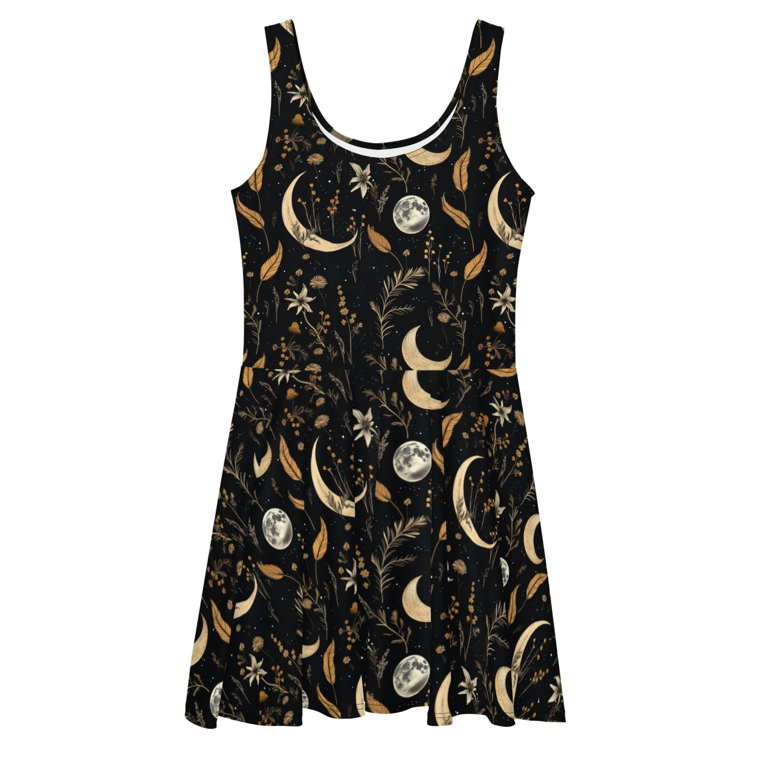 Slink into the night adorned in moons and magical herbs with our dark academia skater dress, set against a celestial starry backdrop. The Moonlit Botanica Dress invites you into a world where botanical witchery and grunge aesthetic dance under a pagan sky.