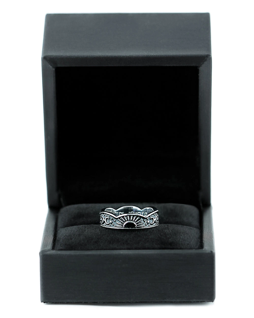 A Stainless Steel Ring 3D sculpted with Moons and Stars and hand-dyed black, to remind you that light is born out of darkness, inscribed on the inside with the words “Shine Bright”. On your darkest days, remind yourself of the light within, put on your crown and shine as brilliantly as the Moon.