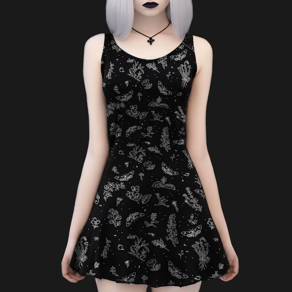 Our Nightshade Skater Dress is a dance between darkness and light, with a striking all-over print featuring sacred moths, mystic flowers, and twinkling stars in a monochrome palette, this dress is all about witchy clothing. The flirty mid-thigh length and flared skirt bring a playful touch, while the elasticated waistline guarantees both comfort and a flattering fit.