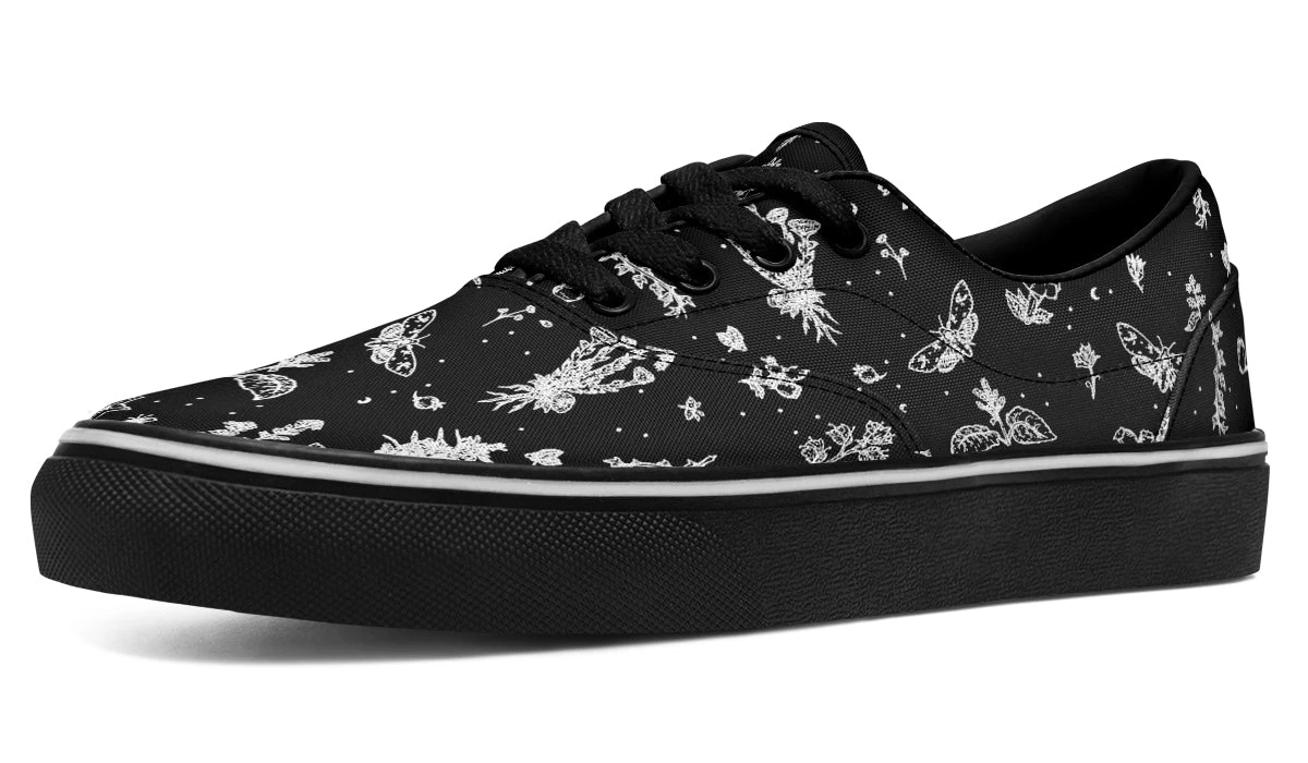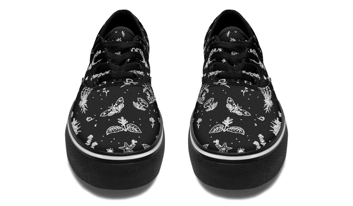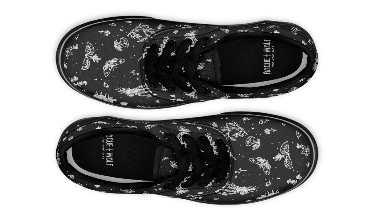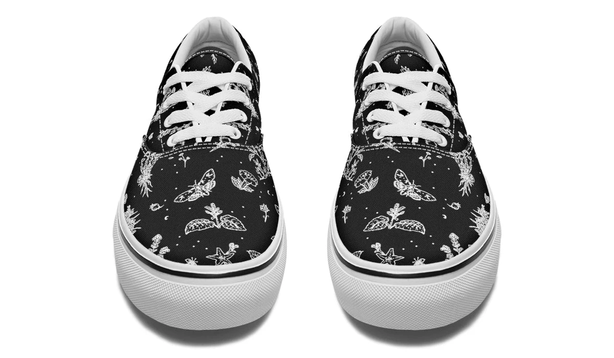 Embrace the night with our Nightshade Street Sneakers, where moths, flowers, and stars weave a black-and-white symphony underfoot. These kicks invite you to dance under the moonlight, where shadows whisper secrets in your ear, and every step is a spellbinding journey.
