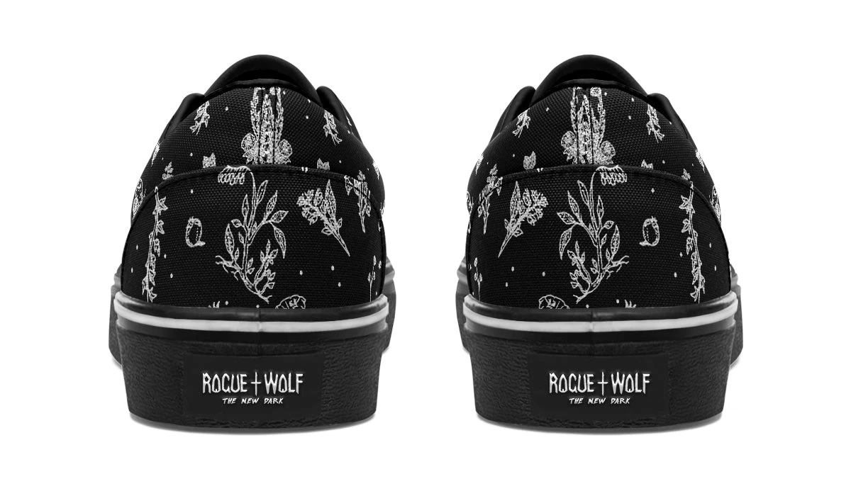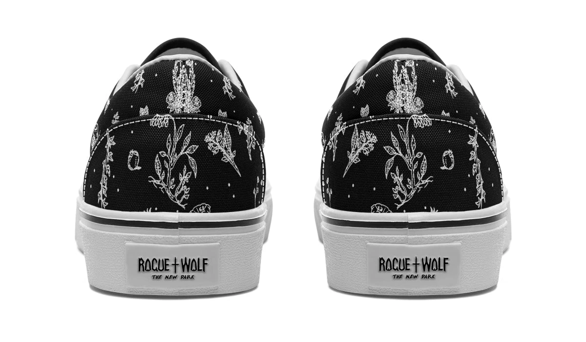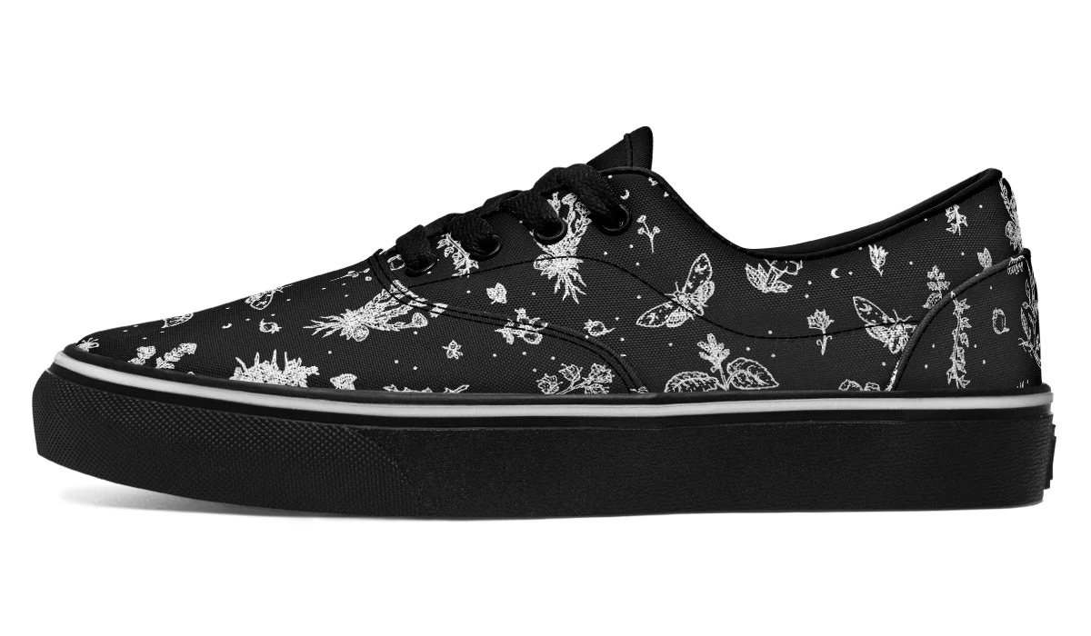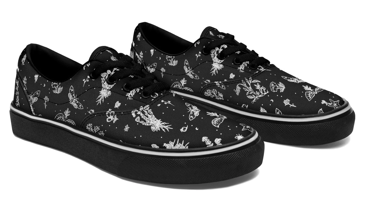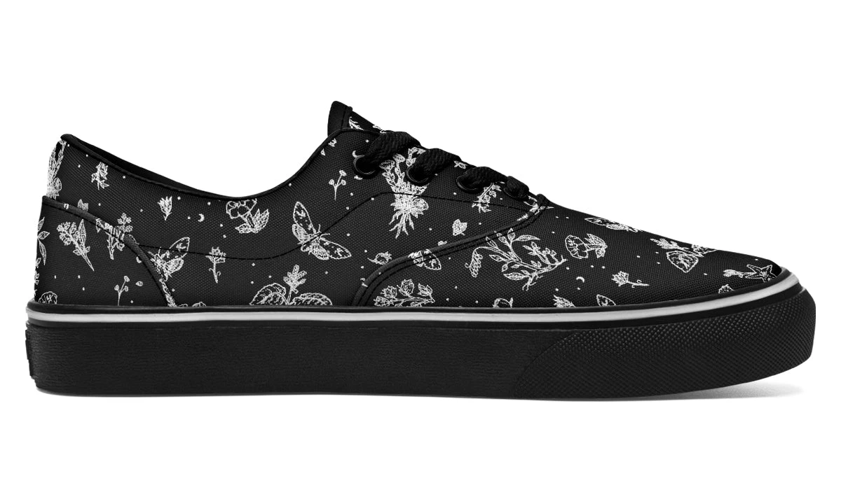 Embrace the night with our Nightshade Street Sneakers, where moths, flowers, and stars weave a black-and-white symphony underfoot. These kicks invite you to dance under the moonlight, where shadows whisper secrets in your ear, and every step is a spellbinding journey.