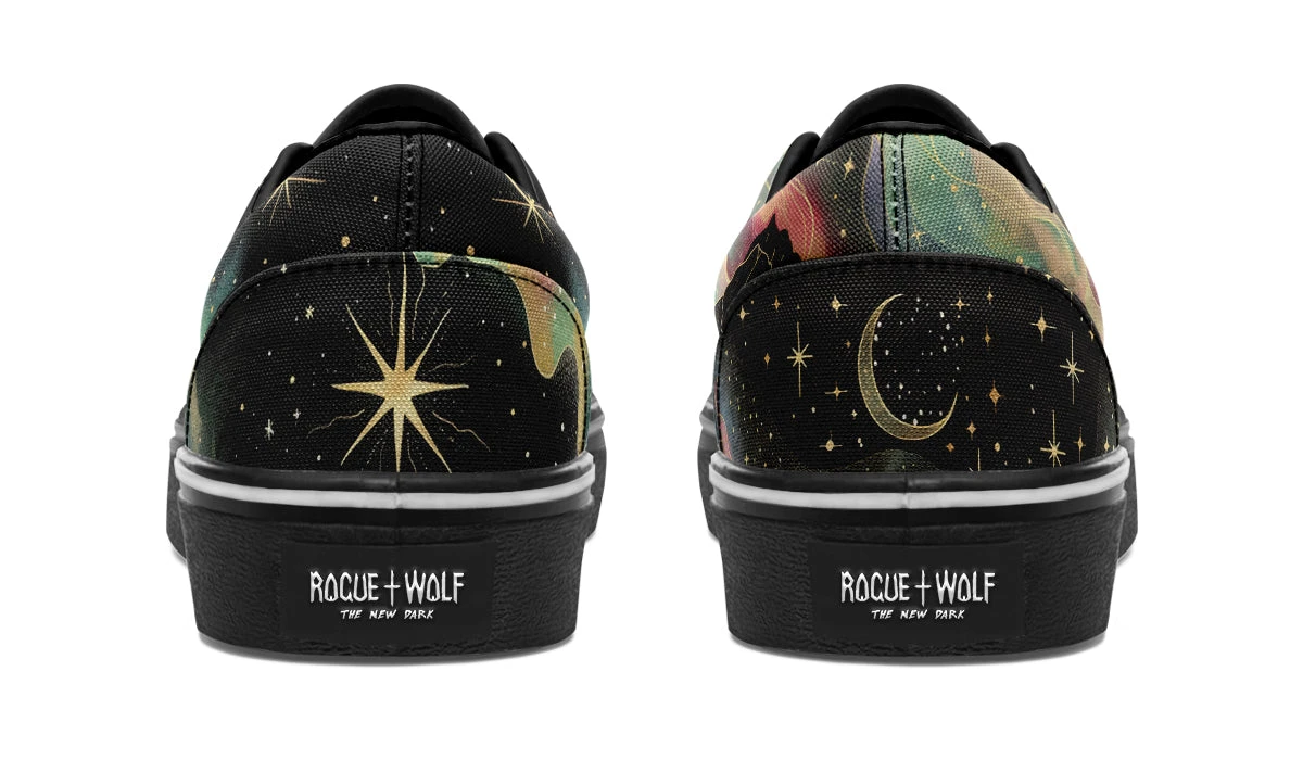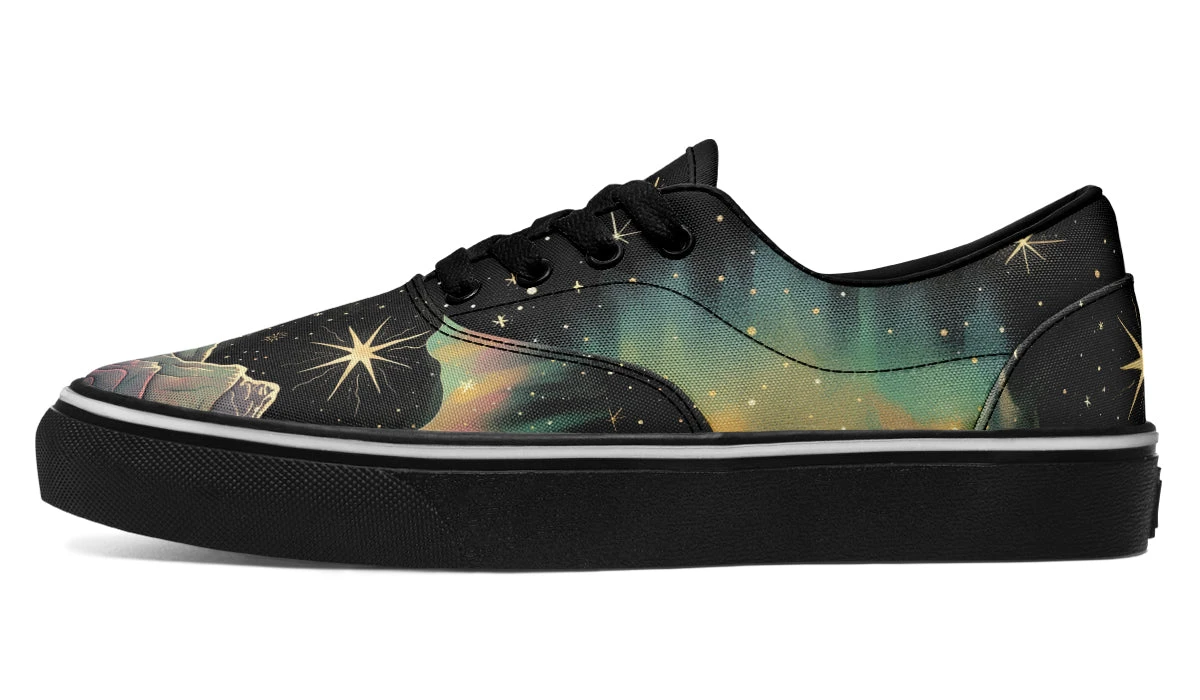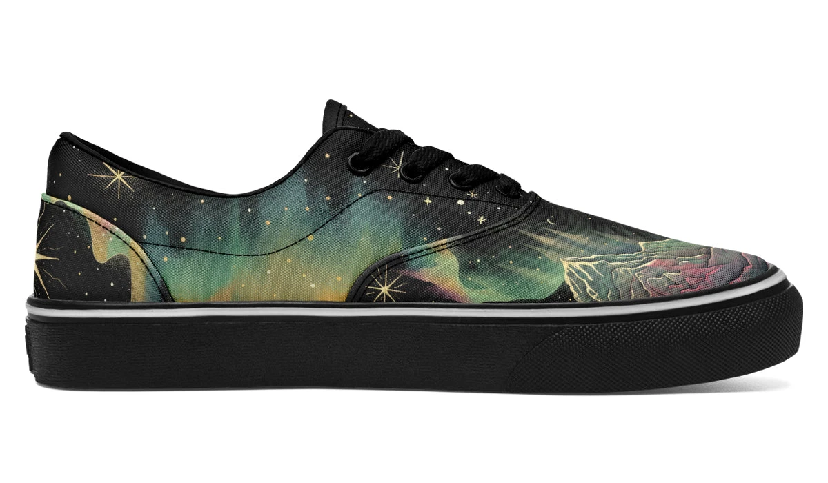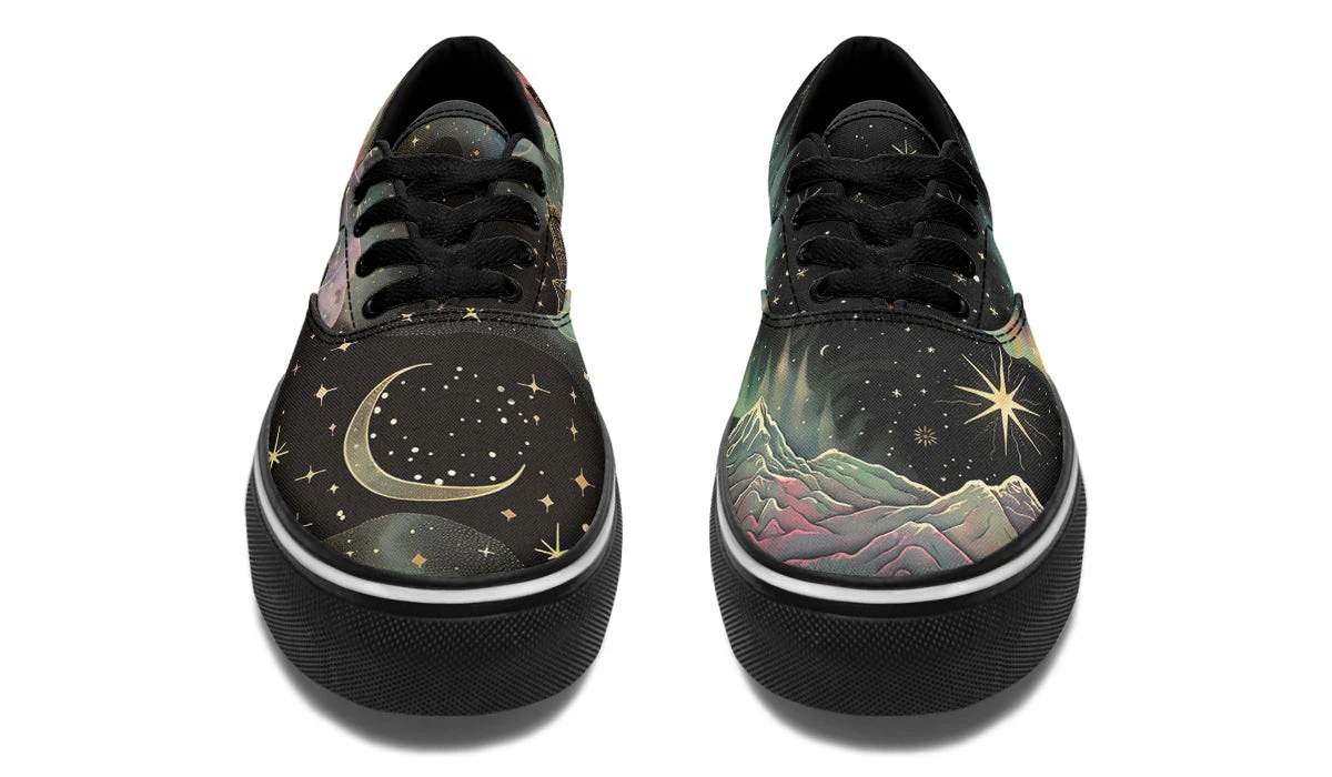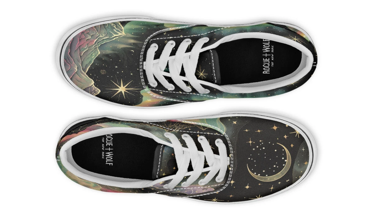 Step into a magical realm where the Northern Lights dance across a moonlit sky, captivating both the bold and mysterious spirits. These street sneakers aren’t just shoes; they’re your portal to an otherworldly style that blends celestial beauty with gothic charm.