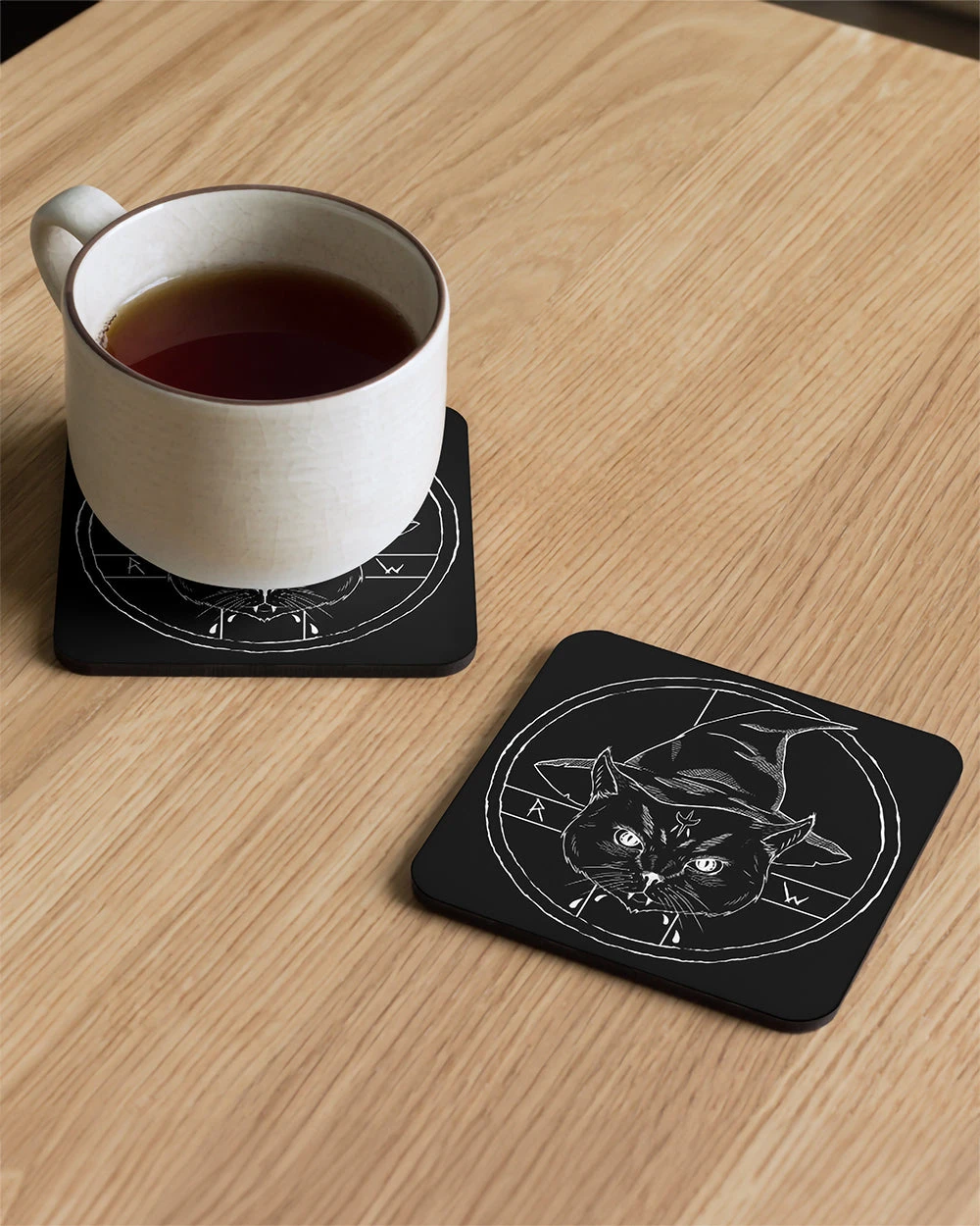 The black hardboard MDF top layer provides a touch of the night, while the 100% non-slip brown cork base adds an element of practicality to its mystical charm, making it an ideal accompaniment for any witchy gathering or casual get-together. Measuring 3.74” x 3.74” with a thickness of 4mm (0.16”), this sublimation printed coaster ensures the protection of your surfaces in style.