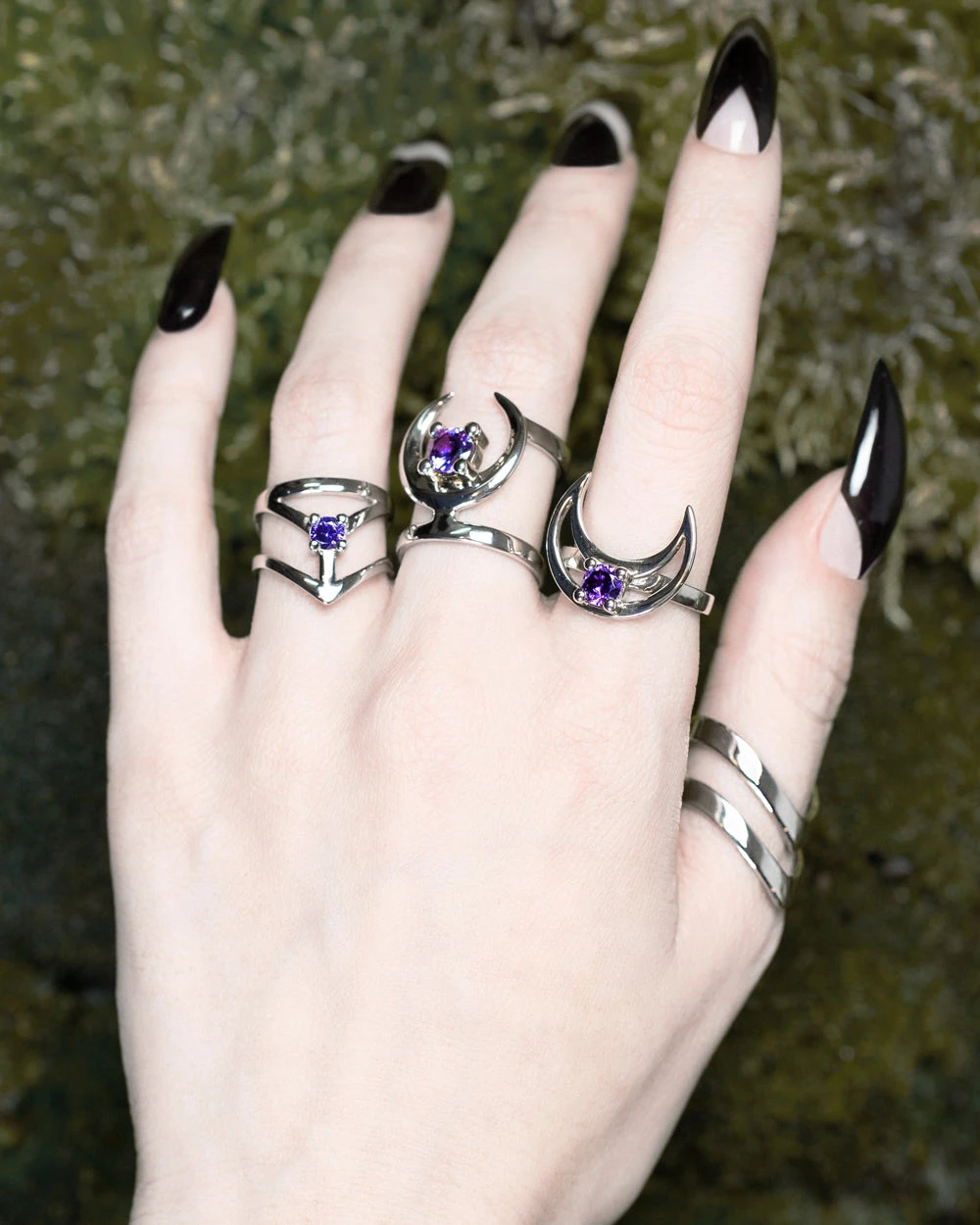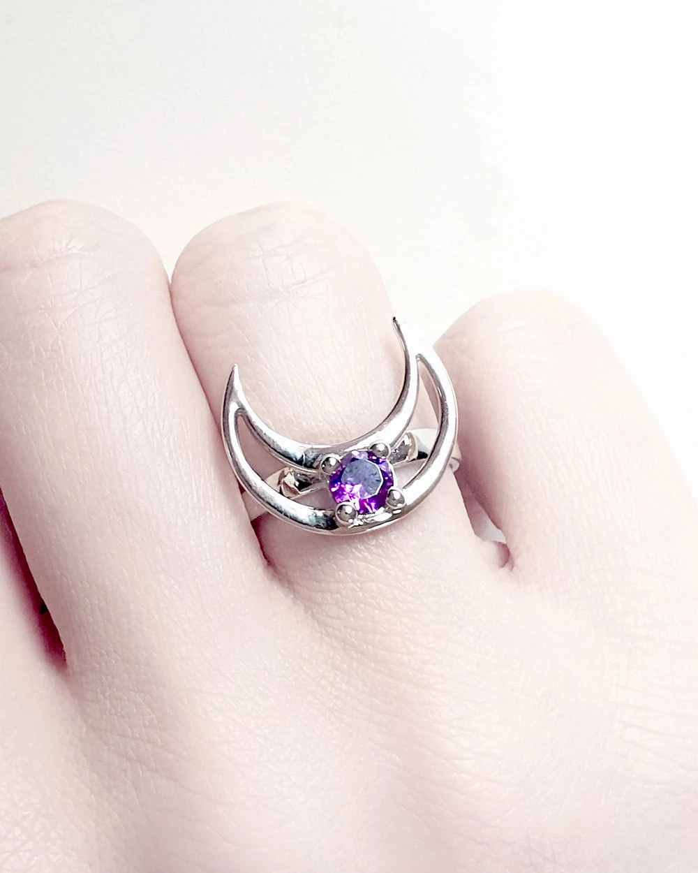 A Magical Sterling Silver Moon Ring with Mirror Polish and an Amethyst Cubic Zirconia gemstone.