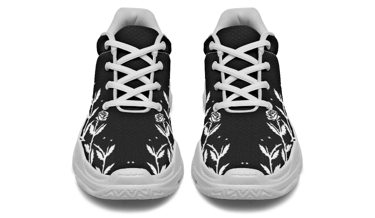 Embrace the dark side with our Rosy Night Chunky Sneakers. Adorned with white illustrated roses and a backdrop of twinkling stars, these thick sole shoes are a spellbinding blend of elegance and edge. Step into the realm where gothic charm meets streetwear chic.
